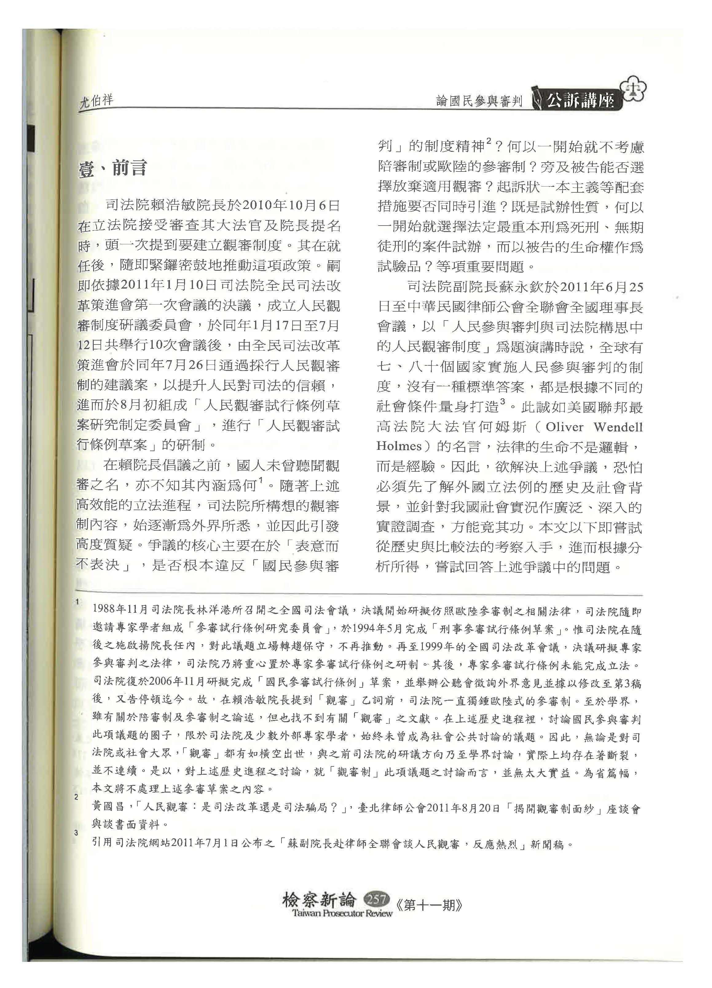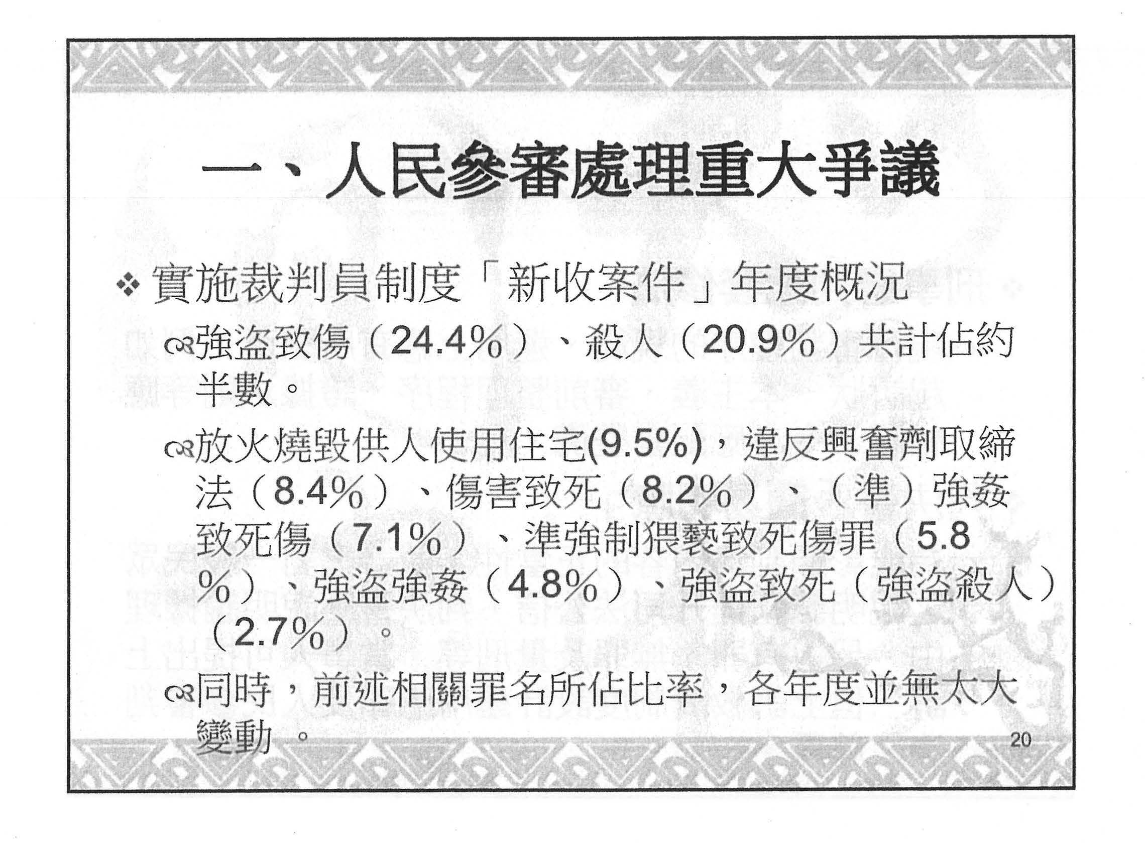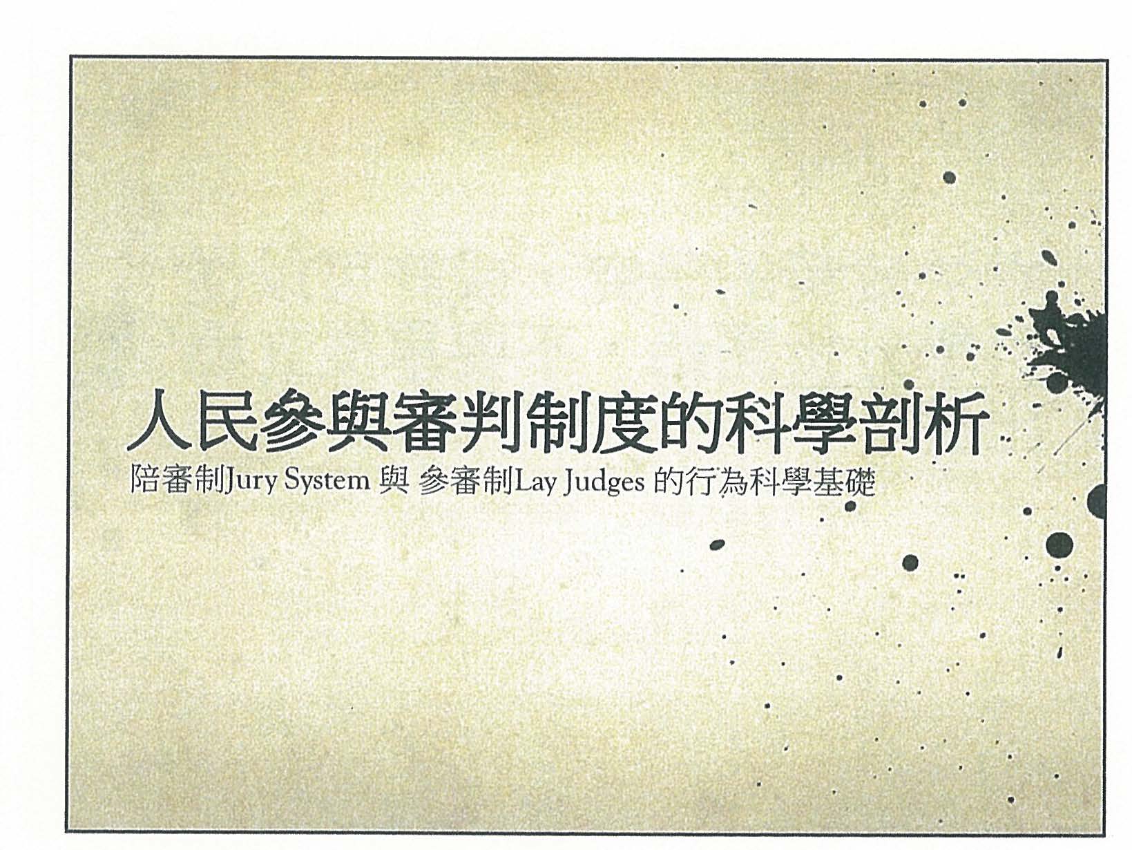 我今天的內容大致分為兩個部分:第一個,為什麼要由人民參與刑事審判制度?第二個,何種形式的人民參與?這兩個剛好都是我最近的研究。第二個是我去年在亞洲犯罪學會年會發表的論文;第一個則是我今年準備在澳洲的亞洲犯罪學會年會上發表的想法,感謝今天有機會讓我先發表。