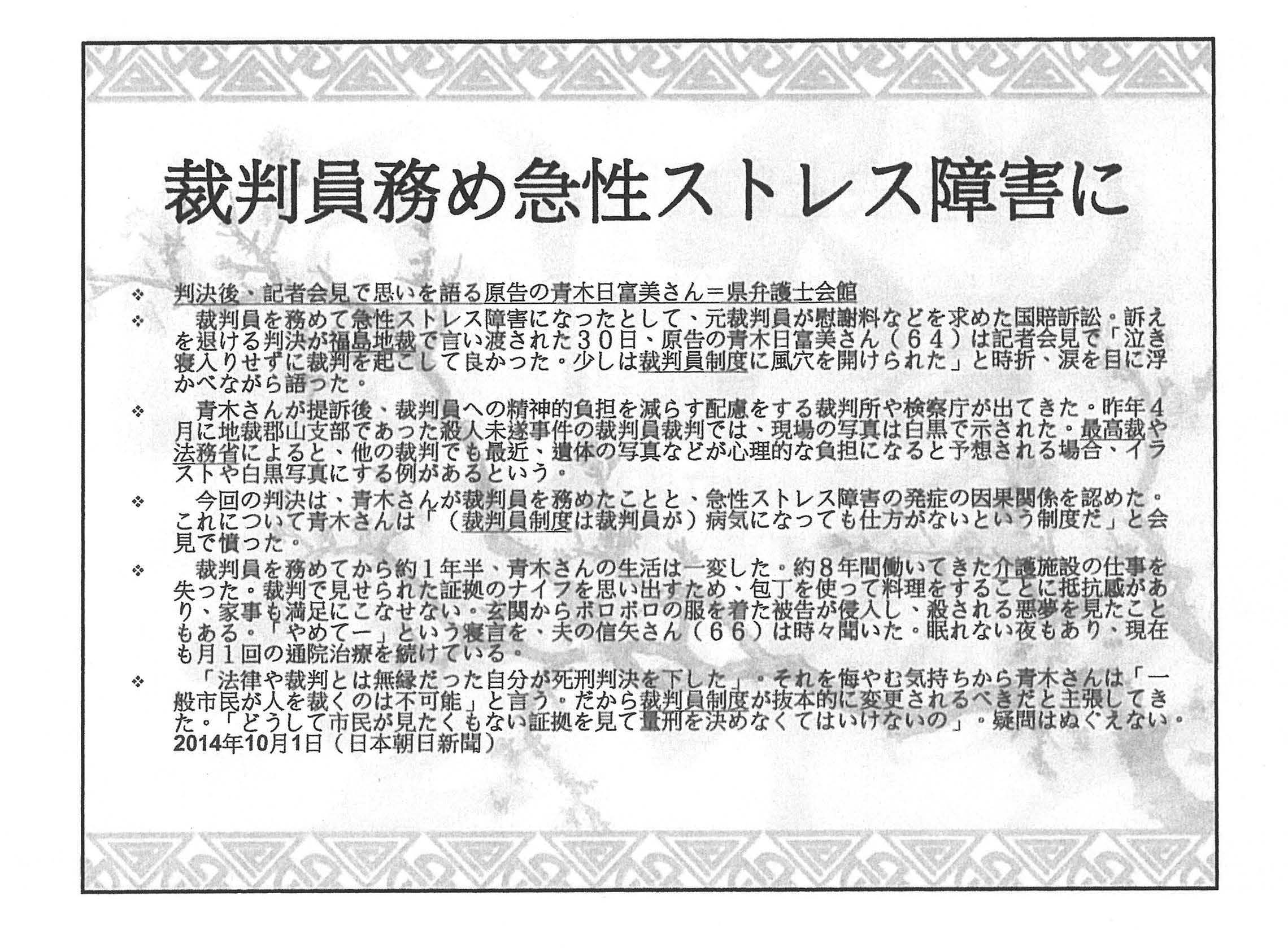 第二個問題就是請人民來當法官這件事情,如果人民不願意就會提告,這樣很危險,在日本就有過這樣的爭議,曾經有人參加人民參與審判的一個審理,回去之後就去告國家,說造成他的創傷症候群,請國家賠償。簡單來講,可能是我們這些比較關心這個議題的人在一頭熱,如果從美國和其他國家的經驗來看,我們可以得知人民參與審判的出席率是越來越低的。螢幕上看到的就是他去告日本政府,請求國家賠償的例子。