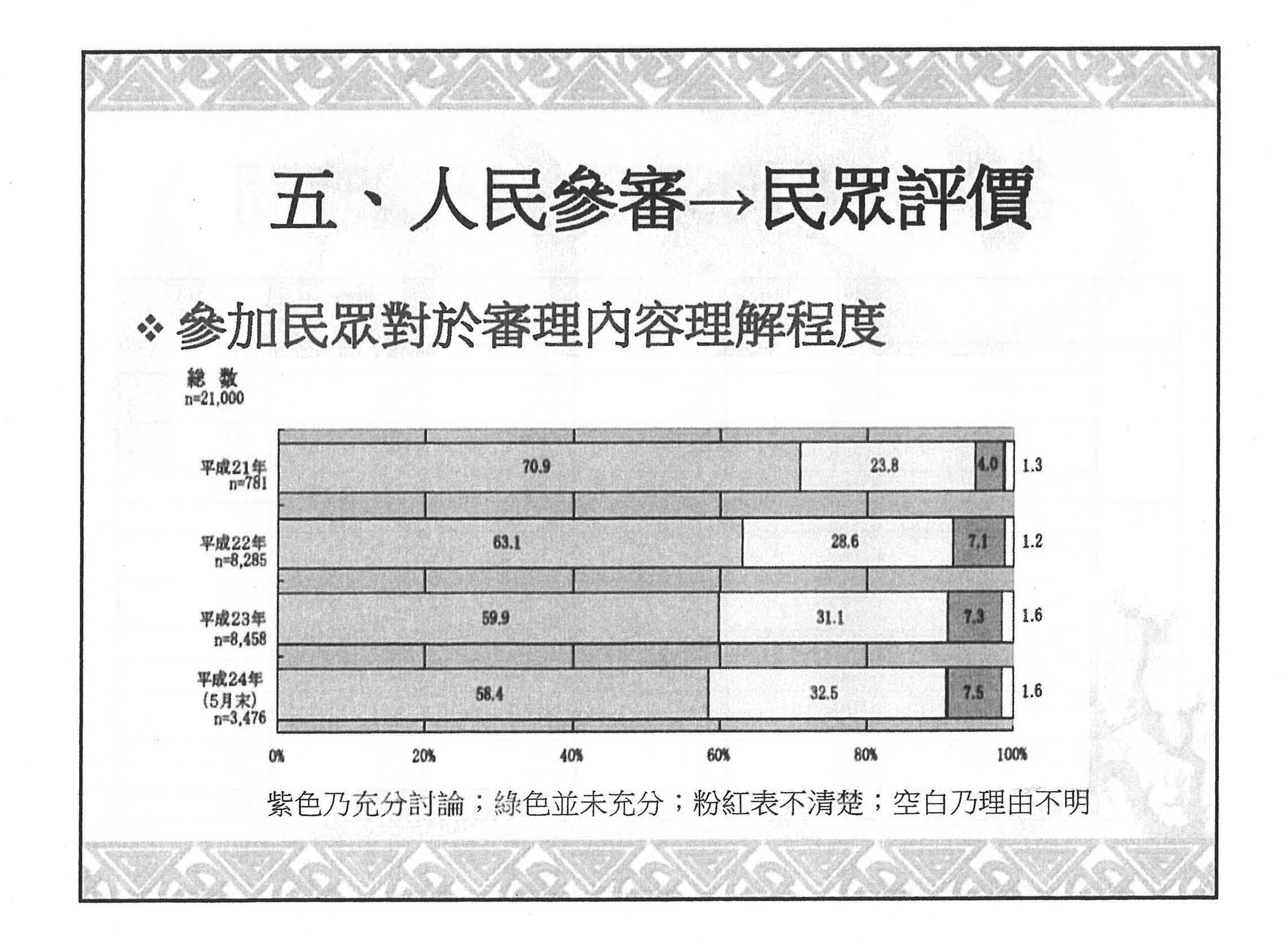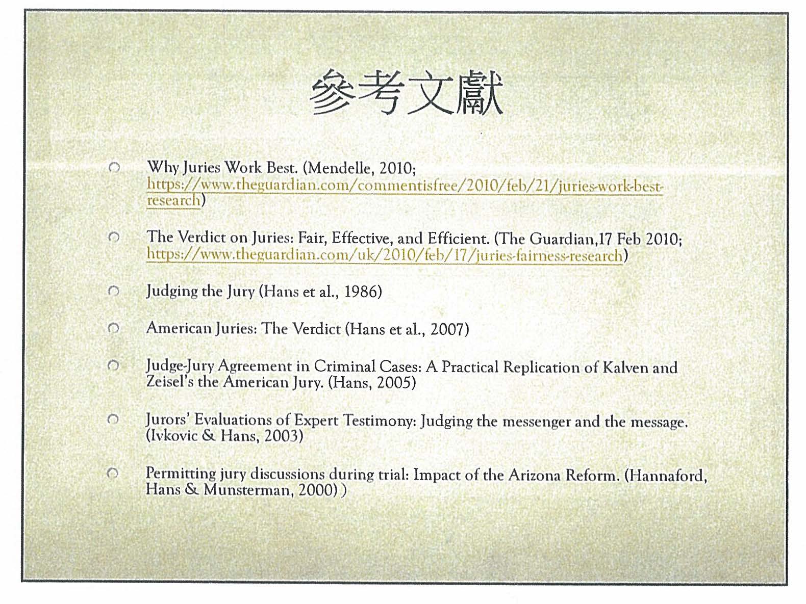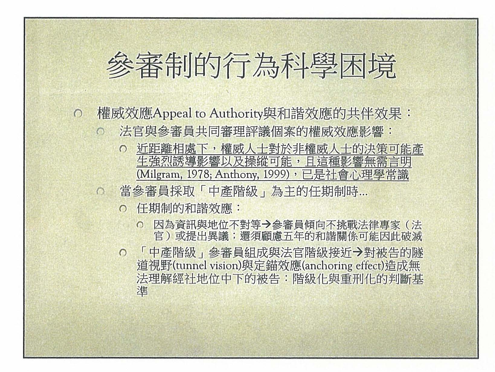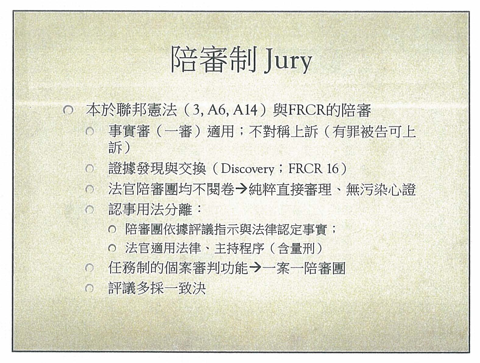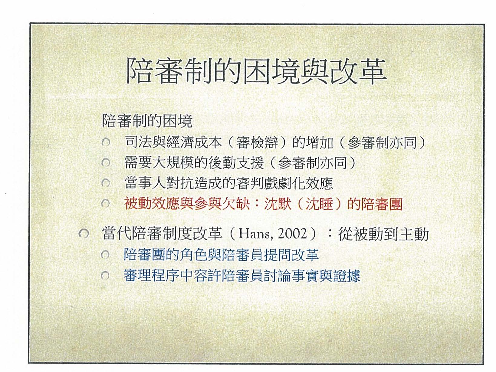 有關陪審制的法律依據,我就不多說,接著我要說的是,目前陪審制是否完美無缺?不是,陪審制當然有問題!第一,陪審制需要大量耗費司法與經濟成本,但參審制需不需要花成本?要!所以最省錢的就是現制,不讓人民參與審判最省錢了,不過我也要幫忙講句話,要增加法官員額。第二,陪審制需要大規模的後勤支援,但參審制要不要?要!國民參與審判呢?要!所以這並非陪審制獨有的缺點。第三,當事人對抗會造成審判戲劇化效應,這點我同意,而且如果搭配法庭直播的話,問題可能會更嚴重,惟這是法庭公開活動的必然之惡、必要之惡。第四,根據行為科學研究結果,陪審團既不能問,又不能做筆記;有筆記也不能拿出來,也無法做中間評議,因此,從沈默的陪審團變成沈睡的陪審團,當然,這是個笑話。但漢斯教授2002年所做的一項研究曾公開提到,其實這問題很多州都已經在改革中,首先是增加陪審員在庭參與,也就是可以問問題,可以做中間評議,並藉此提升陪審員的認知能力,對事實做出正確認定,這不就是我們要的目的與公民教育嗎?就這點來看,顯然讓陪審制變得比較主動是其看法。