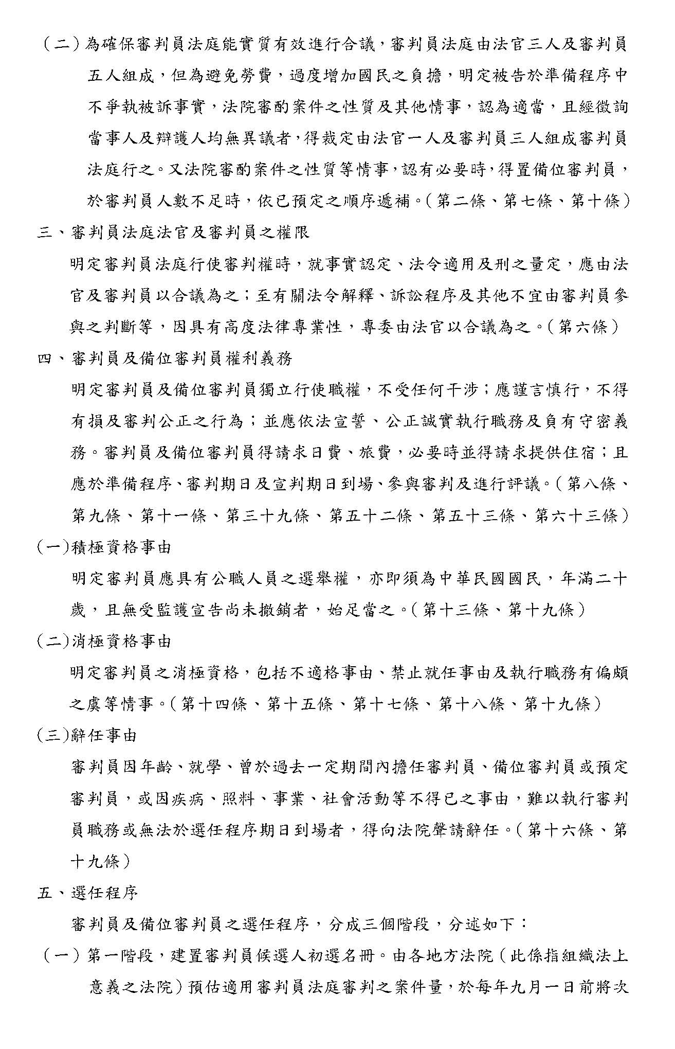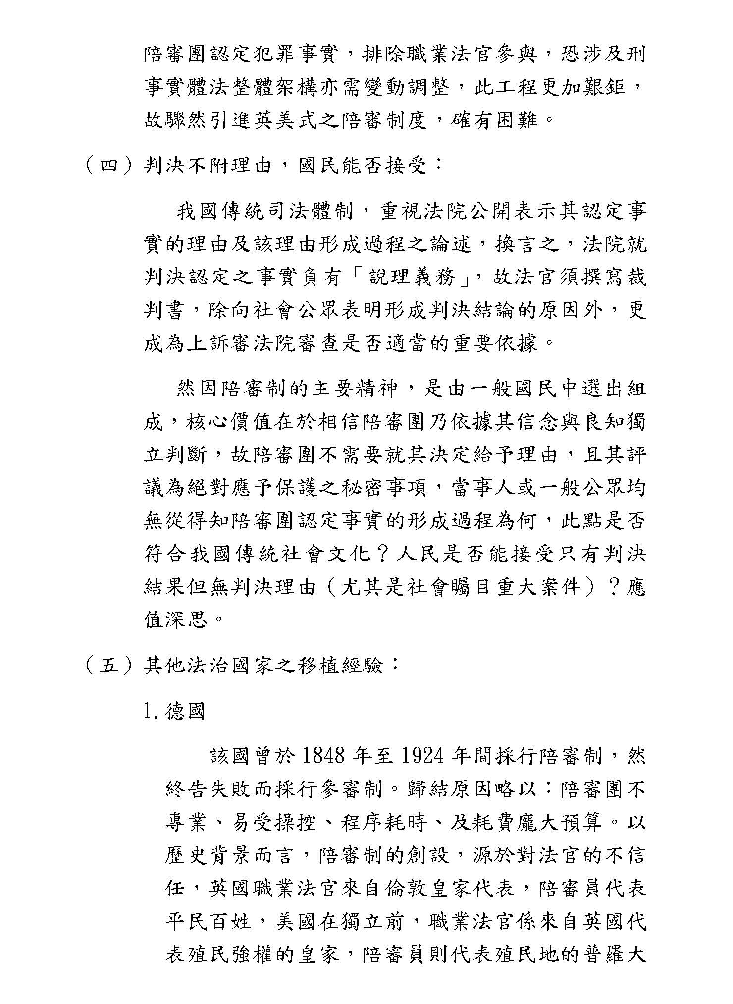 第二,司法院過去所支持的參審制和所稱的觀審制到底差在哪裡?因為從你們今天的書面來看,我覺得只是名稱改變,內容換湯不換藥,是否只是把觀審制換個名稱就決定未來臺灣人民參與審判的走向?