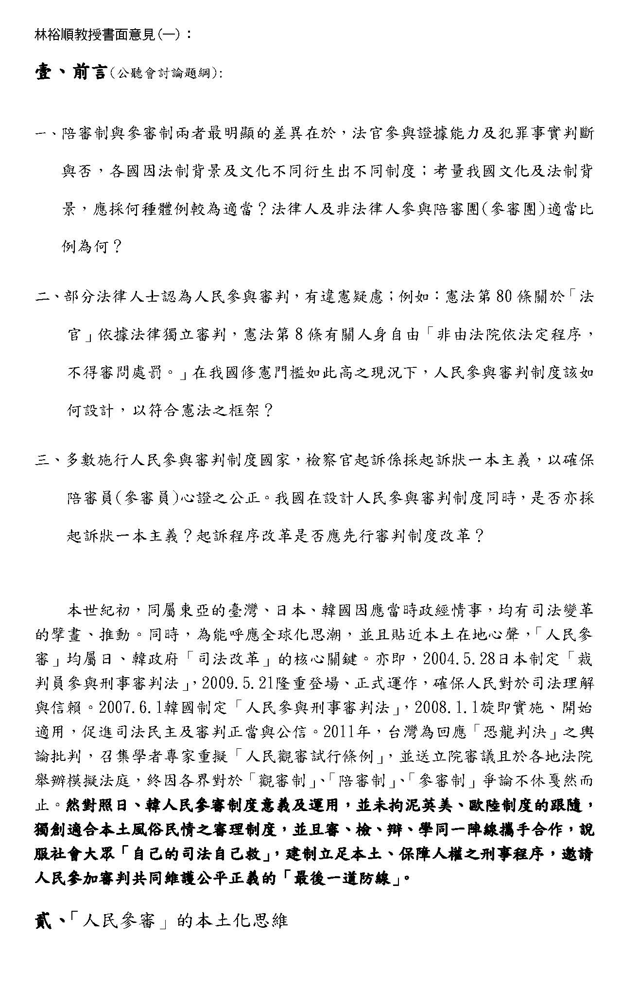 林裕順教授:主席、各位委員。今天很榮幸獲邀參加有關人民參審的公聽會,其實今天來與會的很多專家學者都知道,因為我們在不同的場合參加這個類似的公聽會,可能不下4、5次了,立法院辦的至少就有4次,參加的人也幾乎都是熟面孔。從現場委員出席人數及媒體的關注程度來看這個議題,我覺得這好像是茶壺的風暴,值得大家思考,如果我們要推人民參與審判,我只能做這個比喻,就是我們總是對司法不信任,可是要推司法改革或參與司法的話,可能就像焚化爐的爭議一樣,大家都需要丟垃圾,但又不希望焚化爐蓋在我家附近。我想提醒大家的是,我們在設計制度時,有時候不能太樂觀,也不能太悲觀,人民參與社會關注的程度又是如何,都需要先瞭解清楚,這也是我今天要報告的主軸,如果我們把提綱簡化的話會有這三個問題,包括:一、到底人民參審有沒有憲法爭議?二、臺灣適合陪審、參審?三、現在臺灣的審判制度能否承載人民進來?
