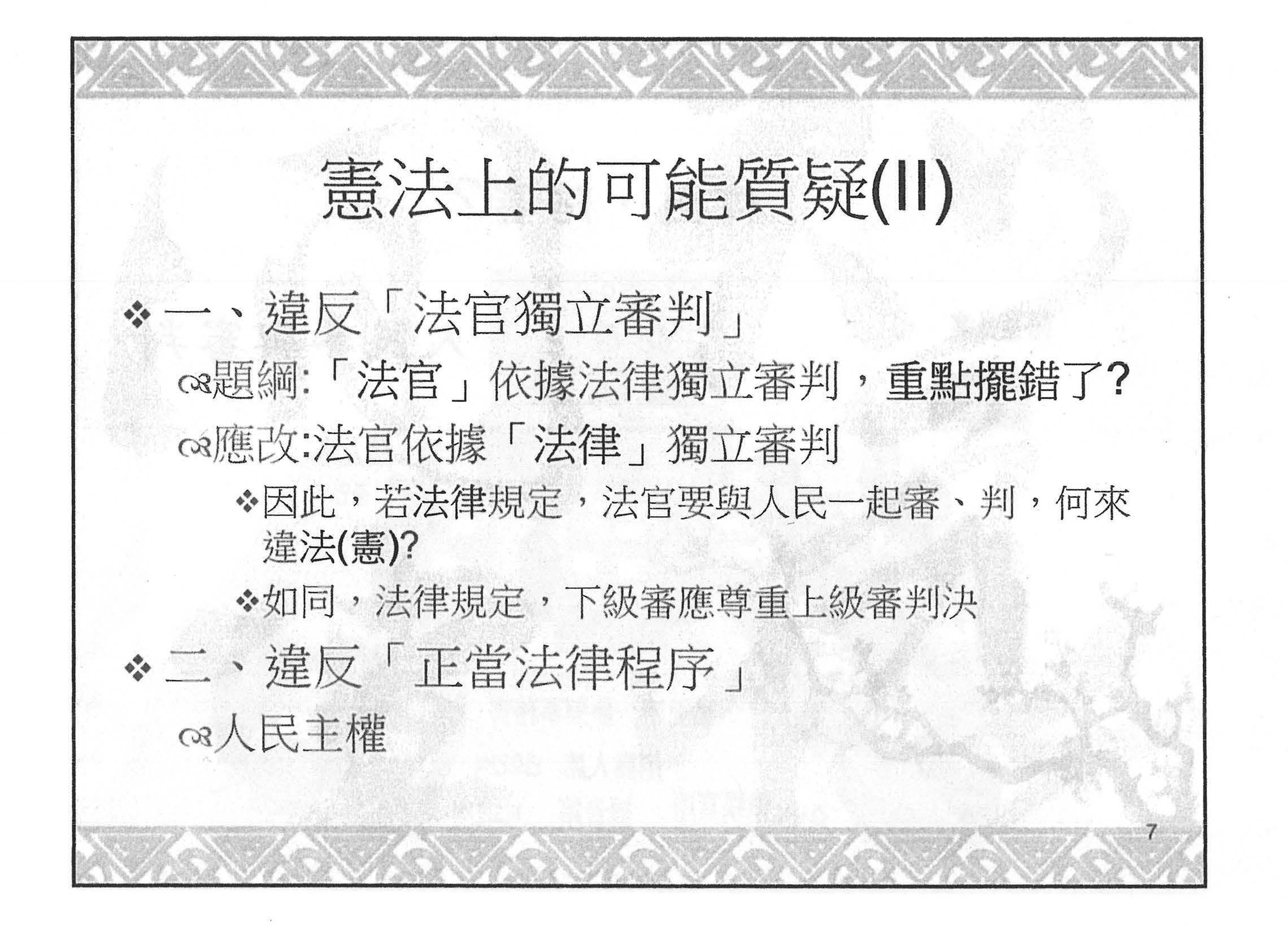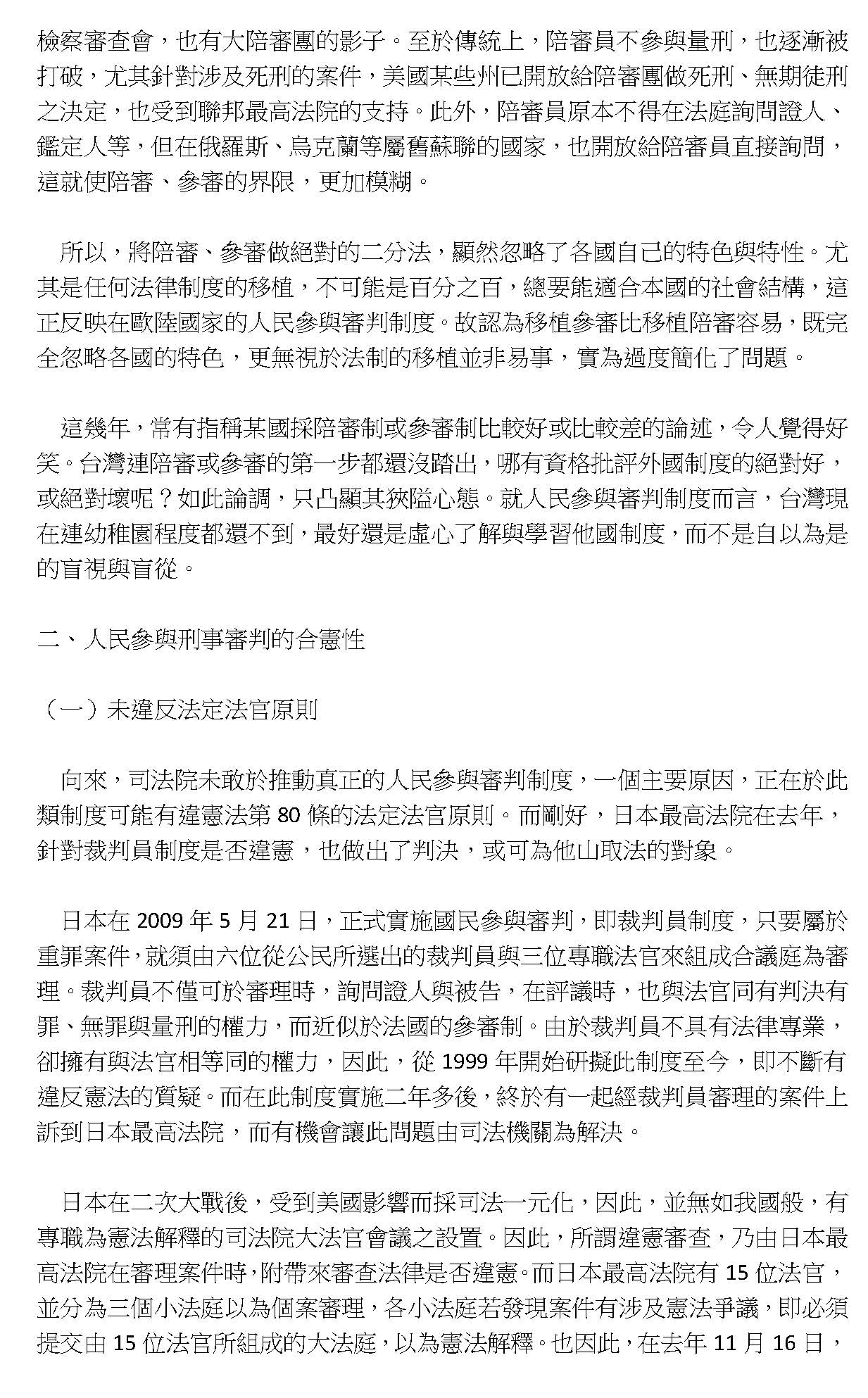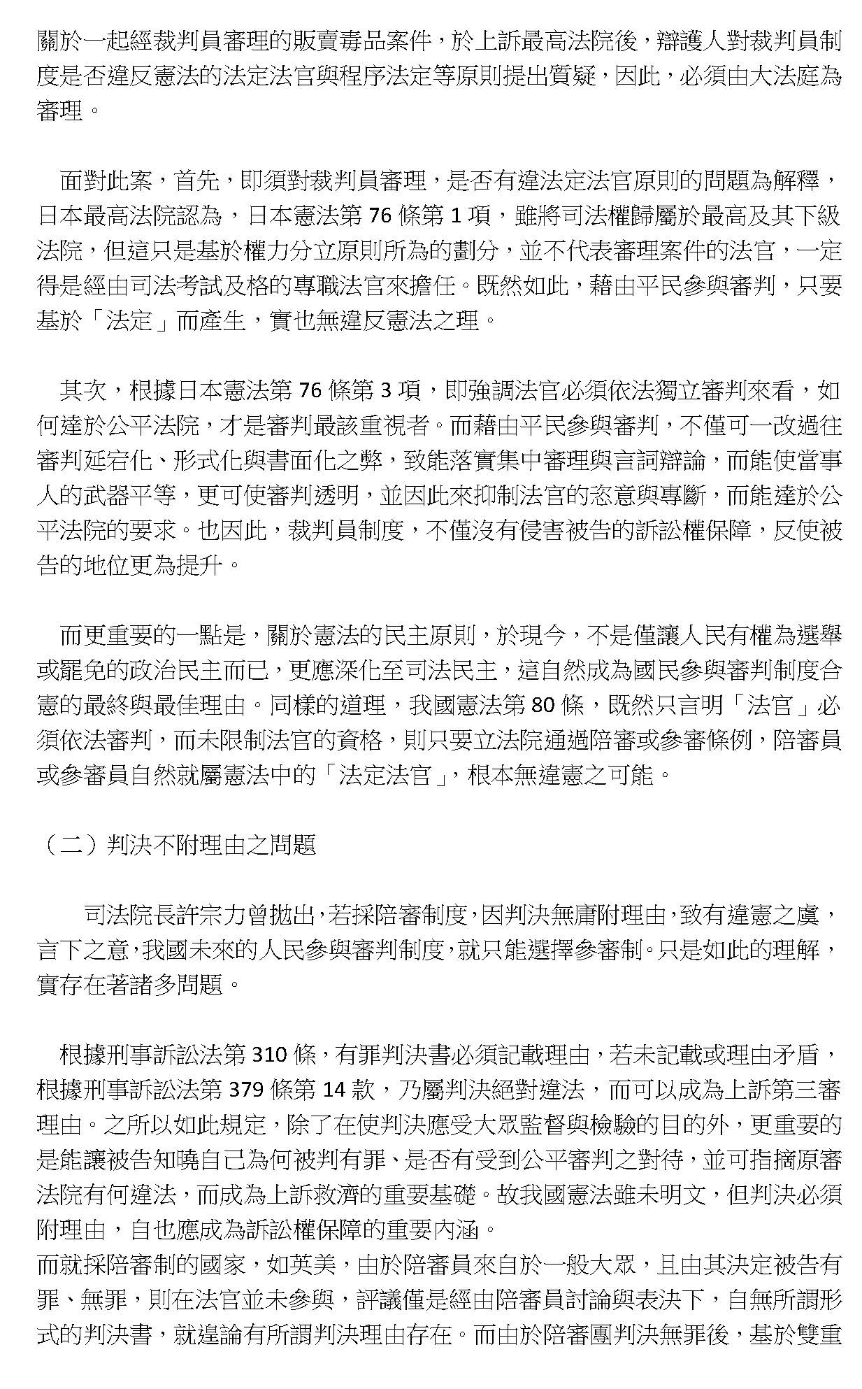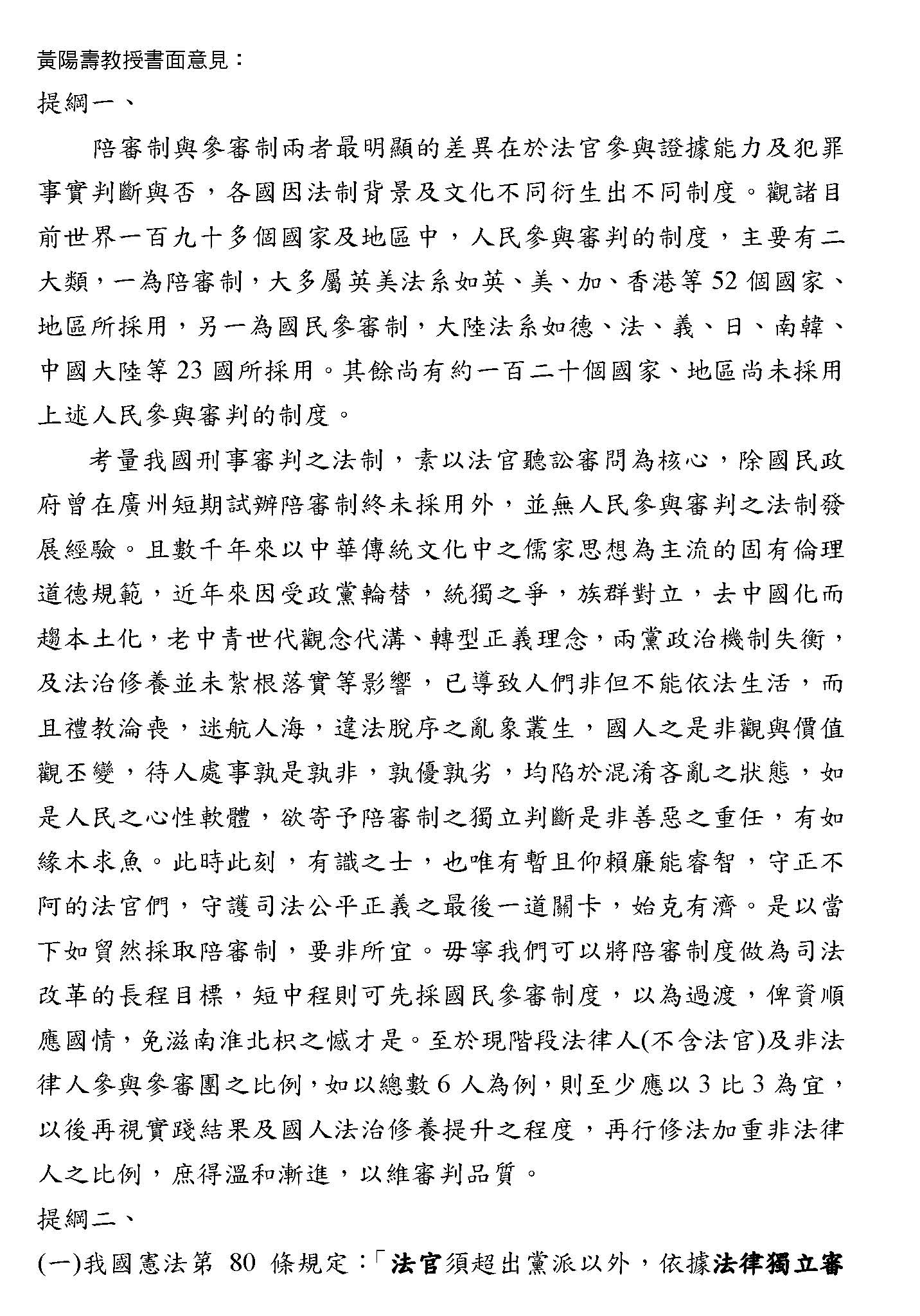 關於提綱第二點有沒有違憲的部分,剛才很多先進都提到憲法的第八十條,提綱也有提到憲法第八條關於人身自由非由法院依法定程序不得審問和處罰。我在這邊要引用前司法院大法官李震山的大作,他在司法改革雜誌「司法的民主化與平民化─論德國刑事參審制度」裡面有提到一段話,他說有關於合憲性的解釋可以從兩個角度來看,第一個是法官審判,司法獨立這個原則;第二個是有關國民主權,在這兩者之間去求取一個平衡。從這個角度來看,其實兩者之間去調和應該是合憲的,這是在李大法官的大作裡面提到的,他認為應該是合憲,如果我們對於是不是合憲有疑慮的話,或許也可以申請釋憲。
