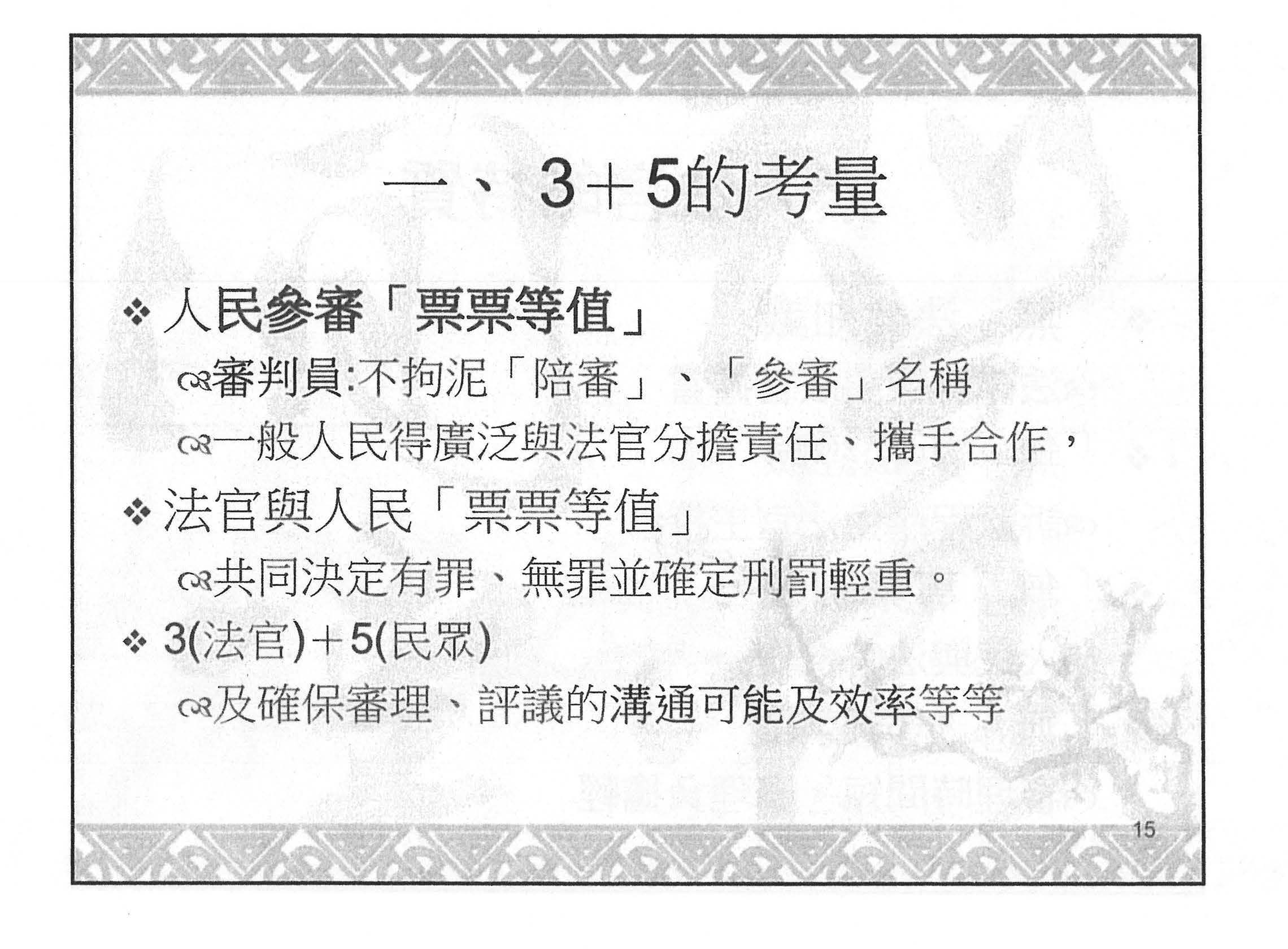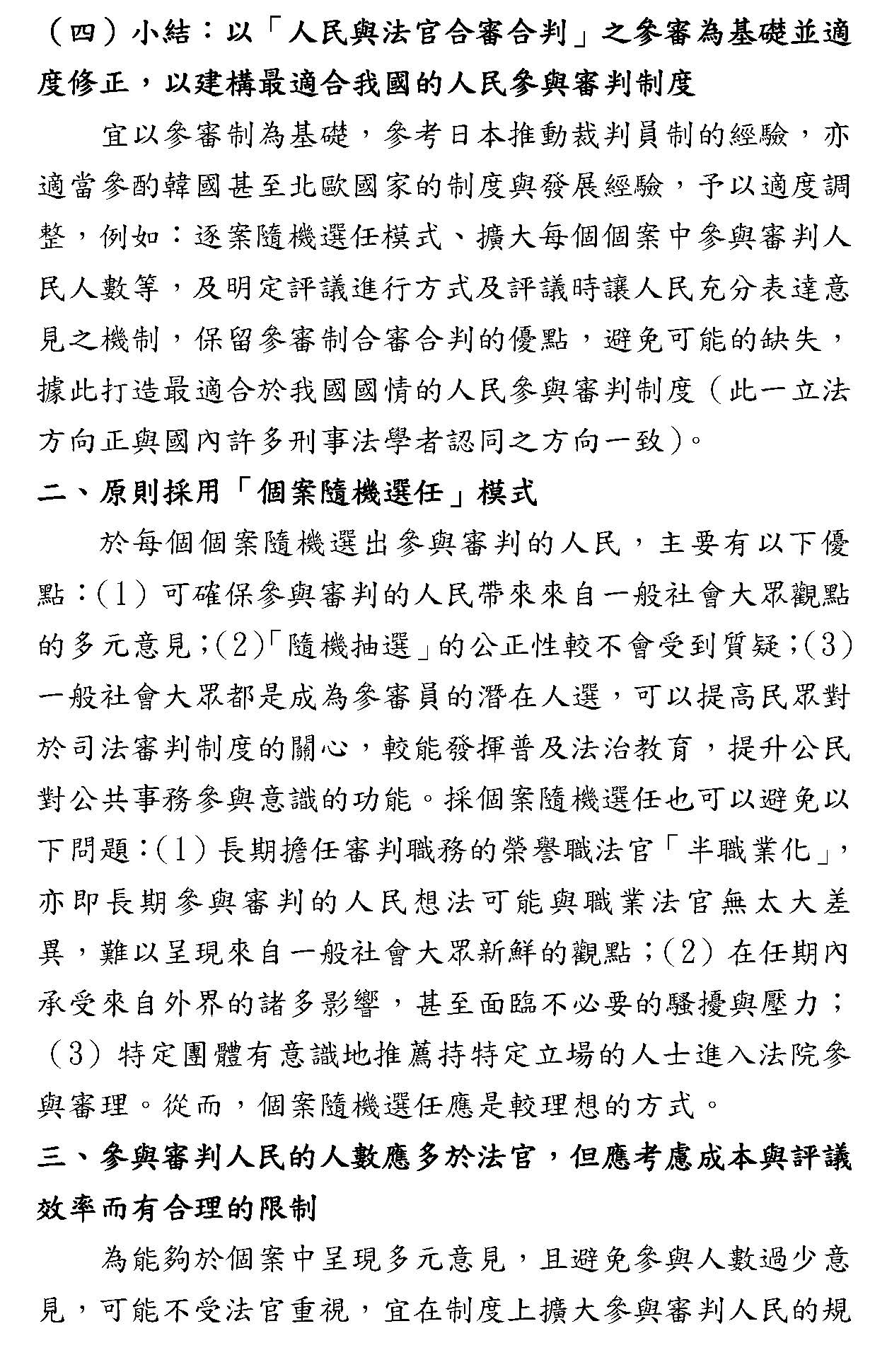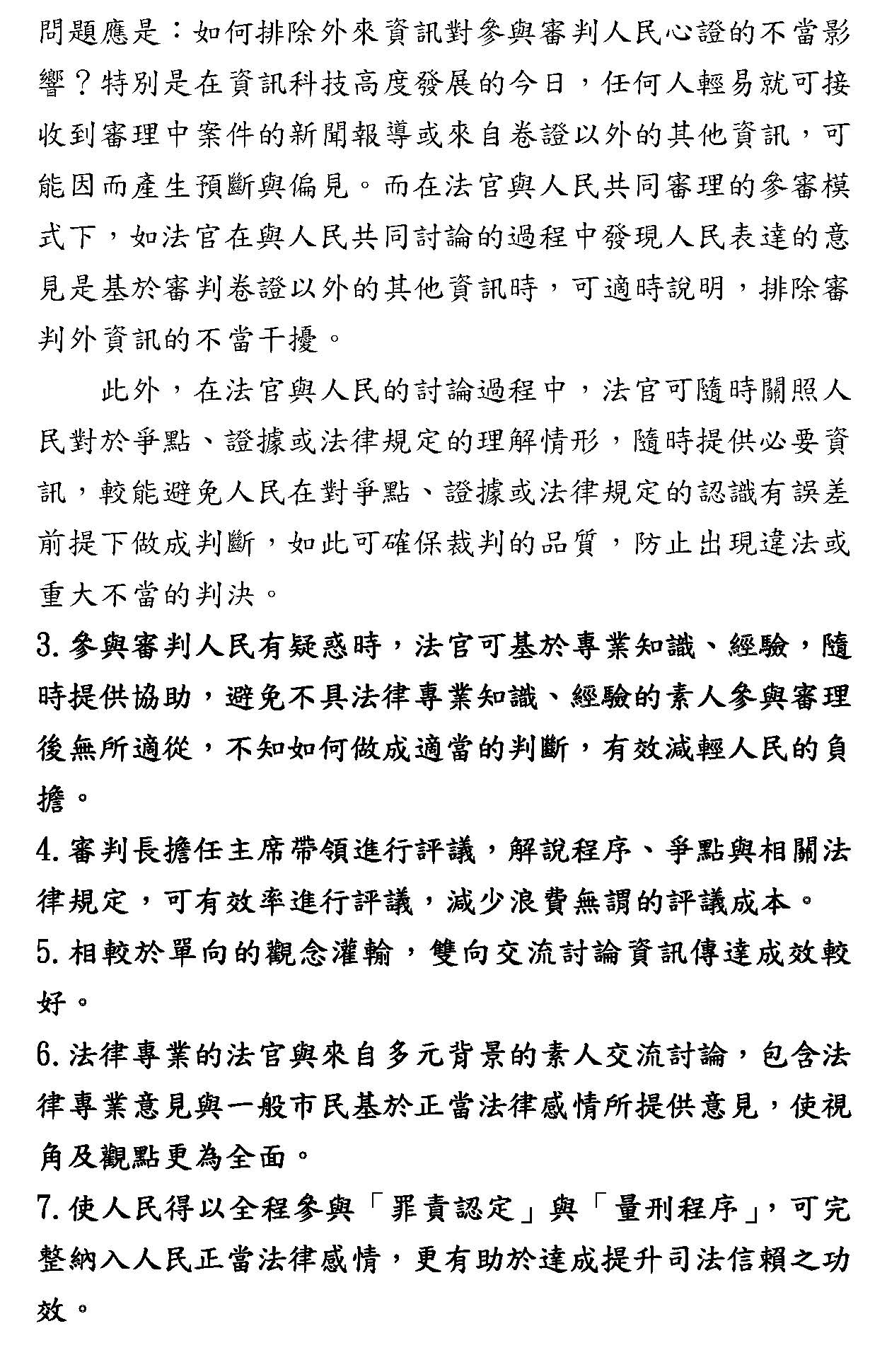 其實剛才有提到我個人也是台日刑事法學會的常務理事,我們曾經訂了一部人民審判員法,前陣子也有送到大院來審議,只是礙於屆期不連續沒有再審。我們的思考邏輯是結合了陪審和參審的考量,也檢討了日本和韓國可能的缺失,然後去訂這一套法律,重點是我們採3個法官5個審判員,然後多數決四分之三,希望這樣可以讓法官和人民多溝通,互相瞭解對方在想什麼,再得出一個符合個案正義、個案公平的結論。