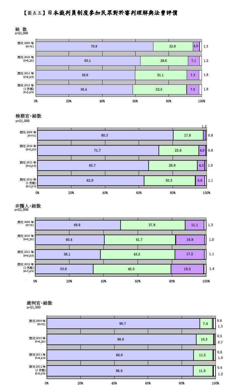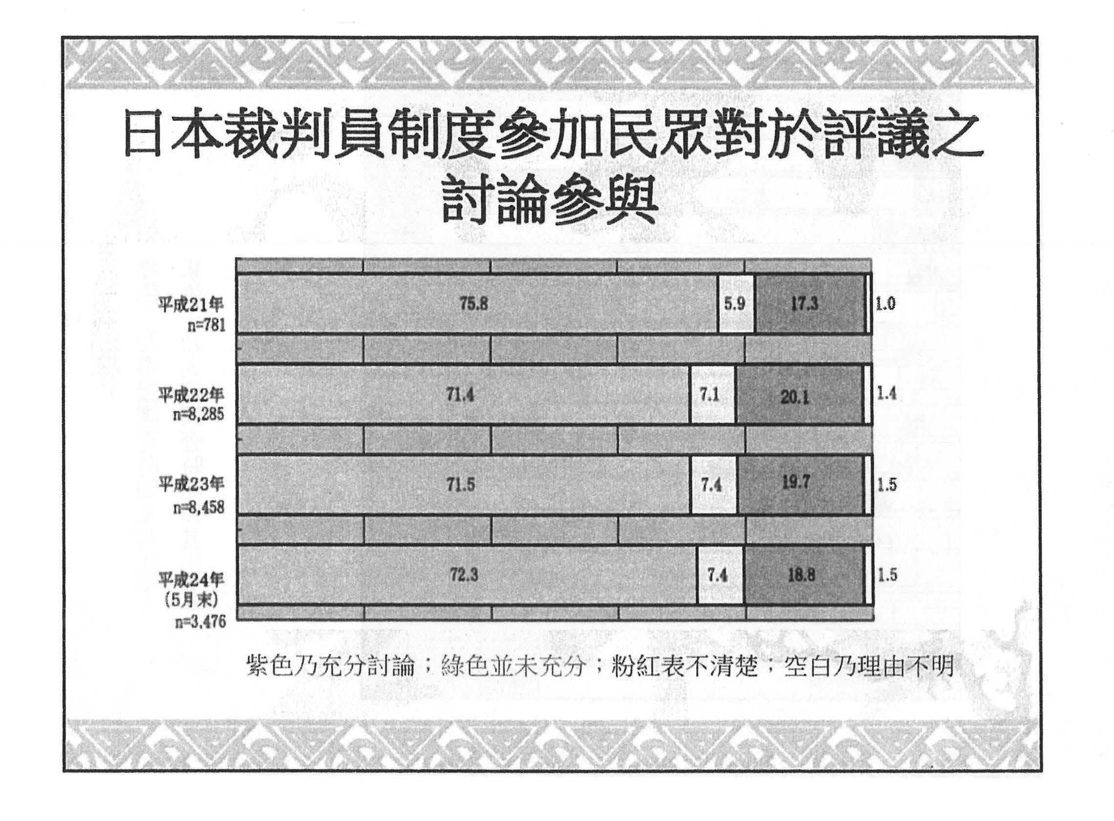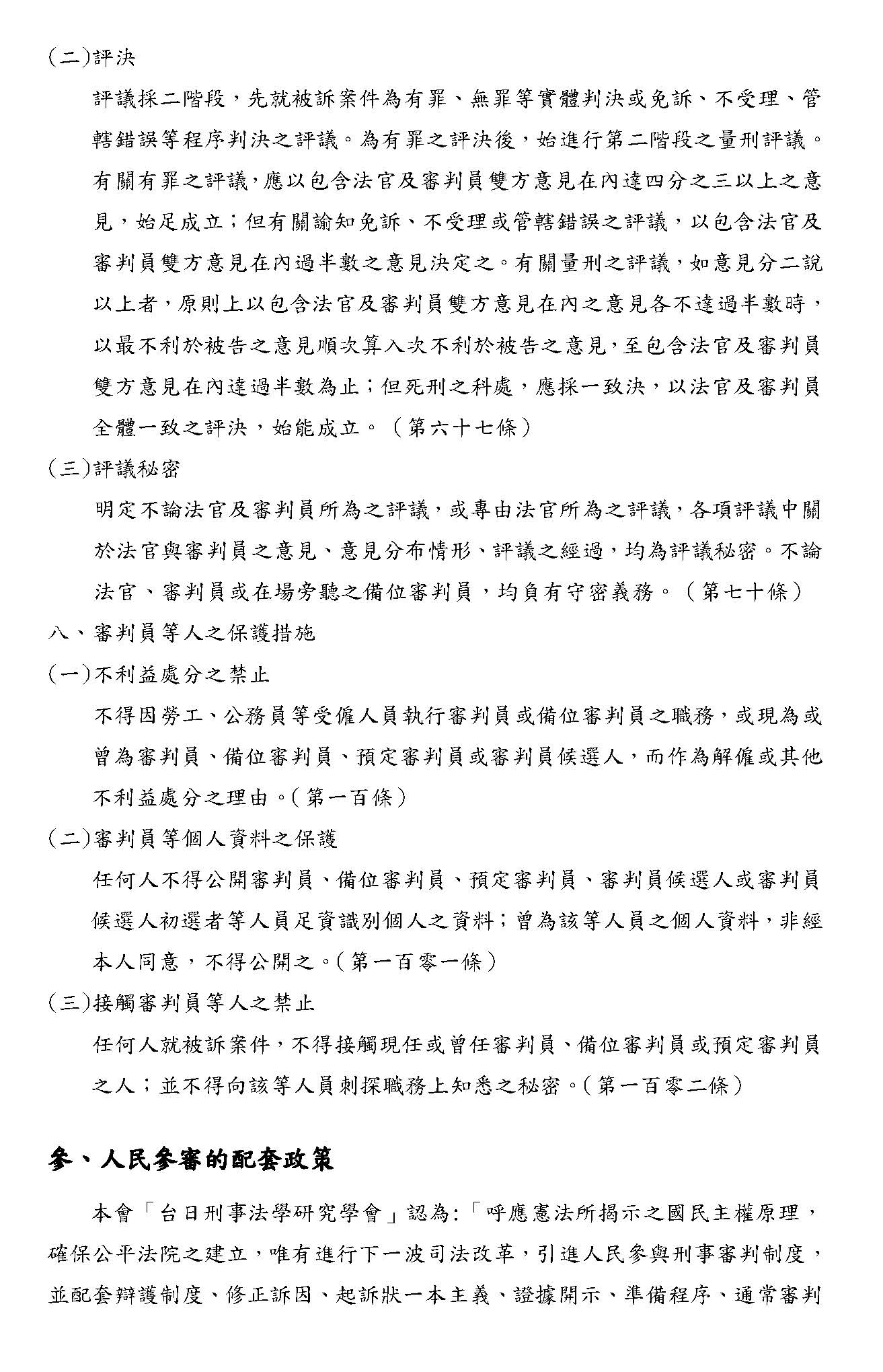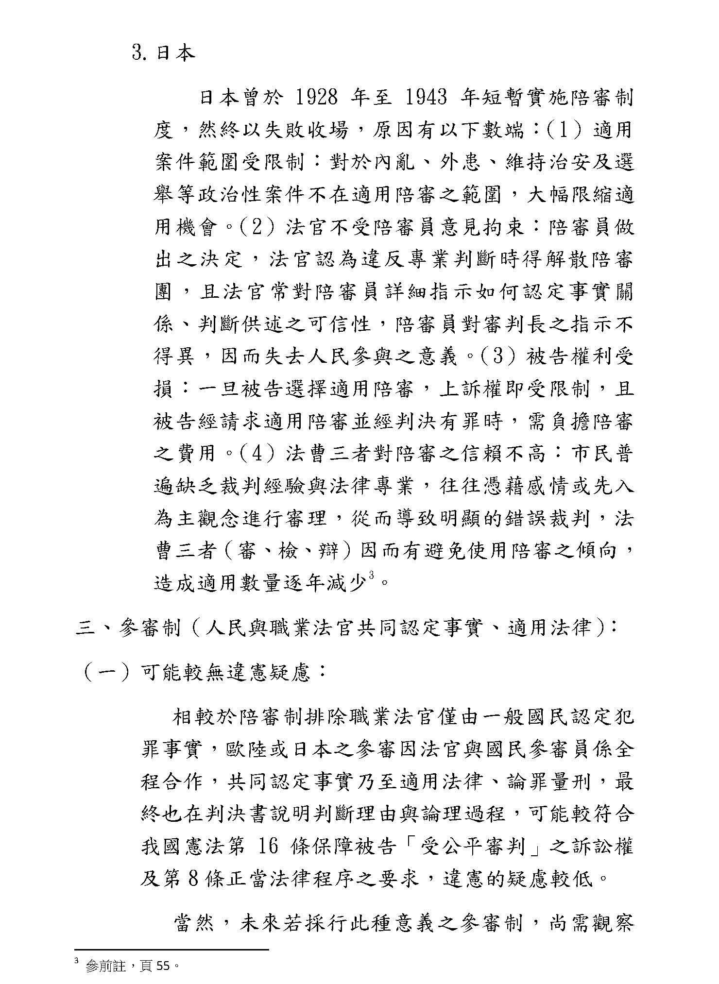 其實剛才有提到我個人也是台日刑事法學會的常務理事,我們曾經訂了一部人民審判員法,前陣子也有送到大院來審議,只是礙於屆期不連續沒有再審。我們的思考邏輯是結合了陪審和參審的考量,也檢討了日本和韓國可能的缺失,然後去訂這一套法律,重點是我們採3個法官5個審判員,然後多數決四分之三,希望這樣可以讓法官和人民多溝通,互相瞭解對方在想什麼,再得出一個符合個案正義、個案公平的結論。