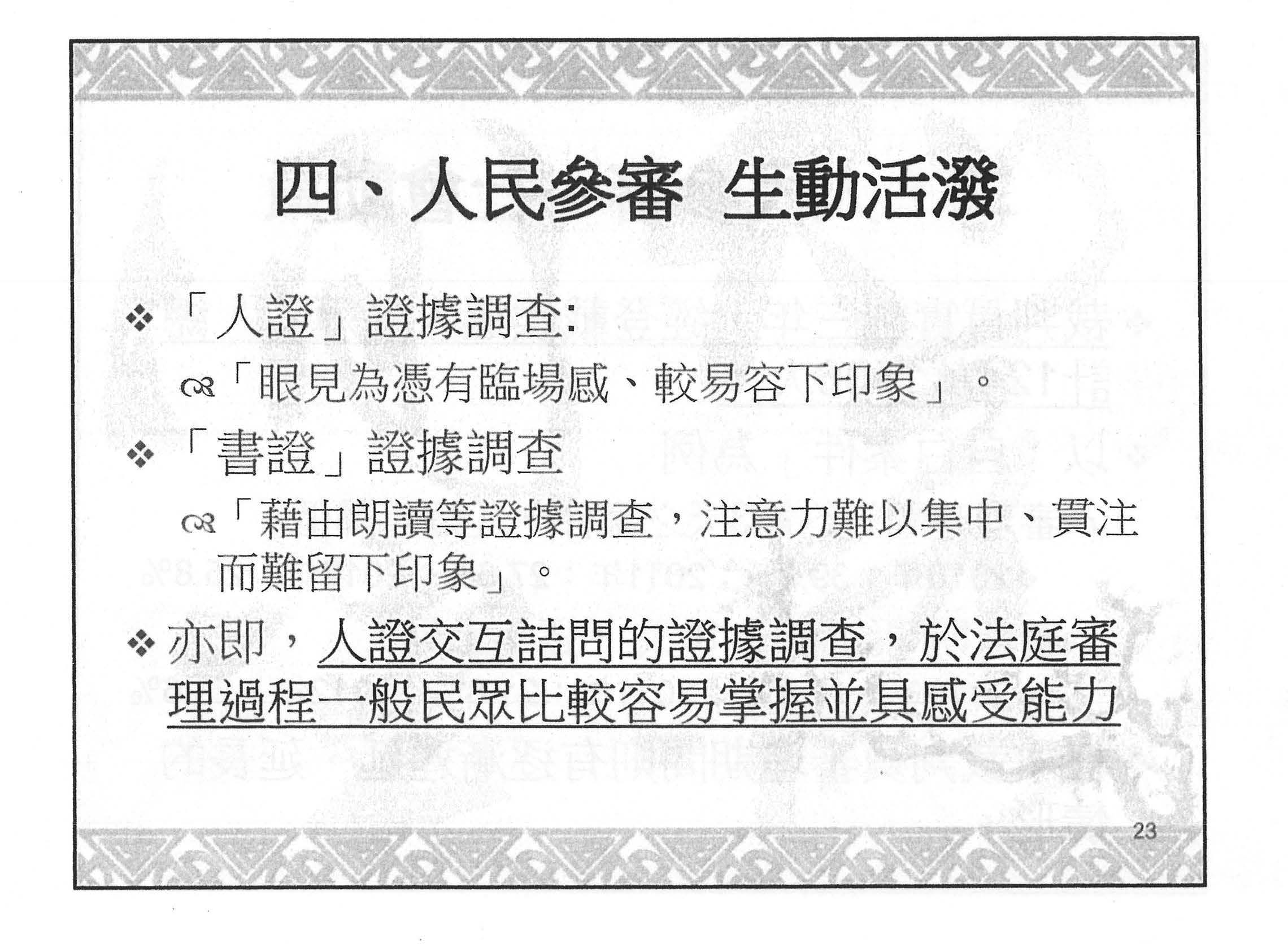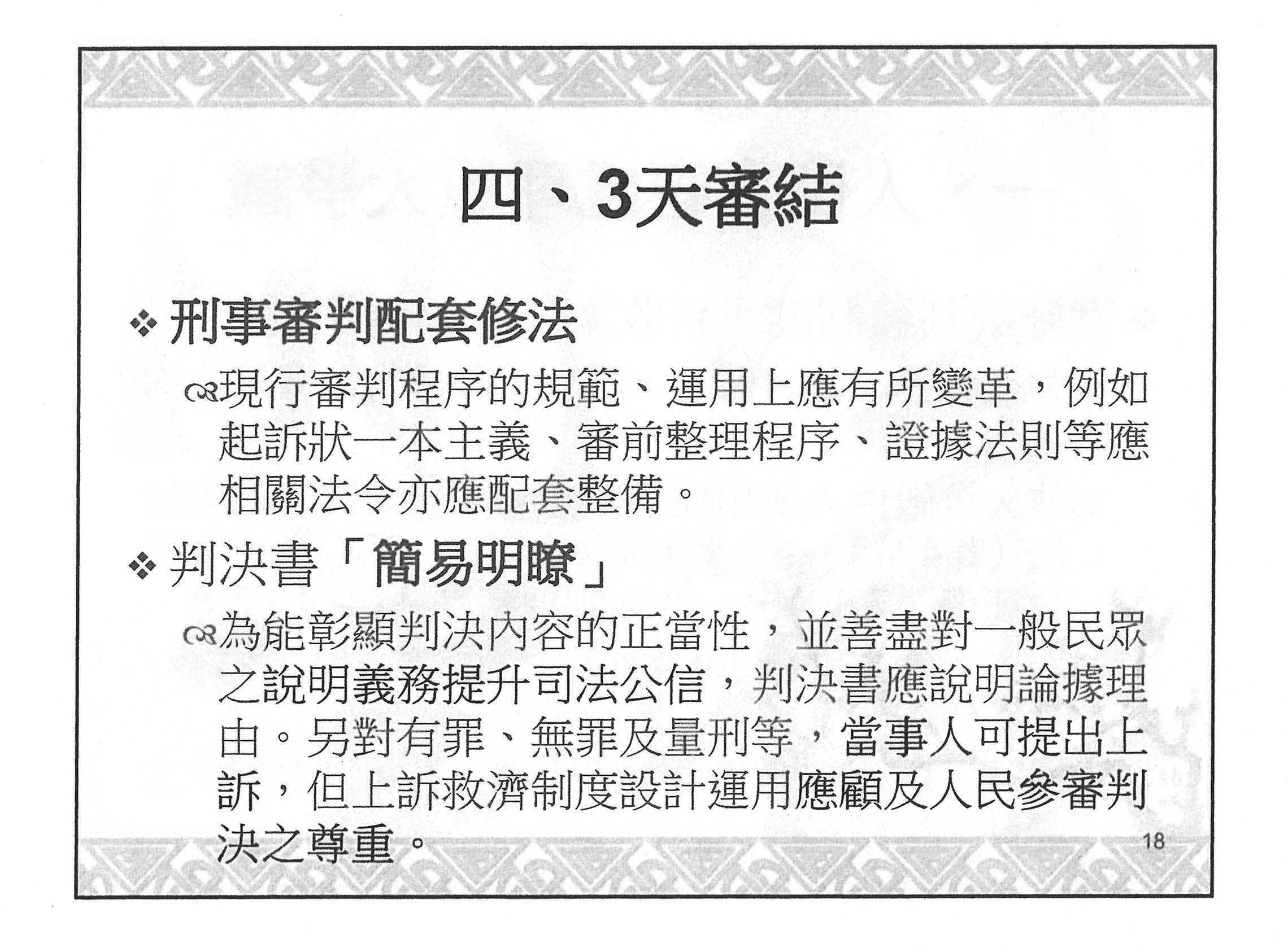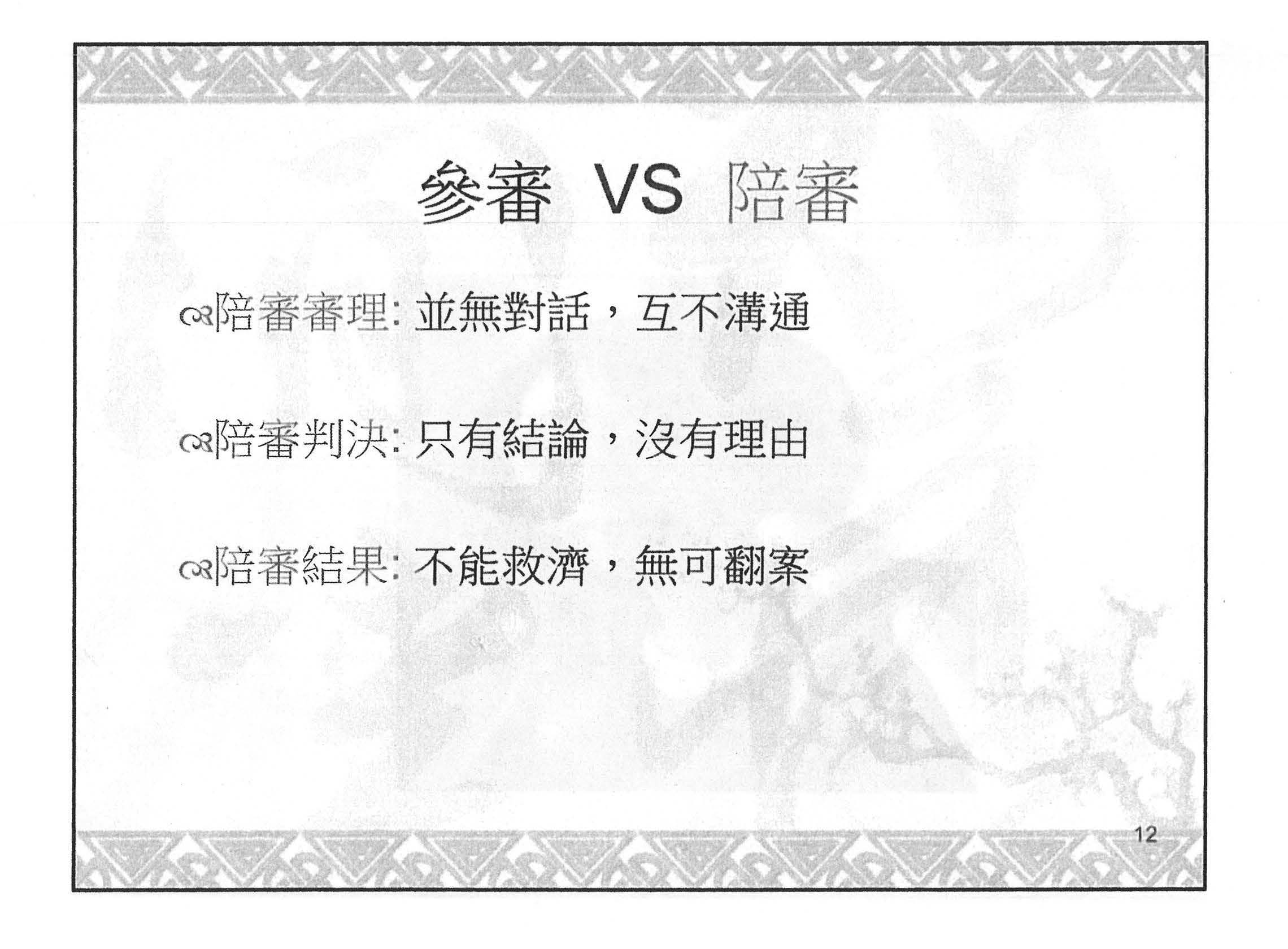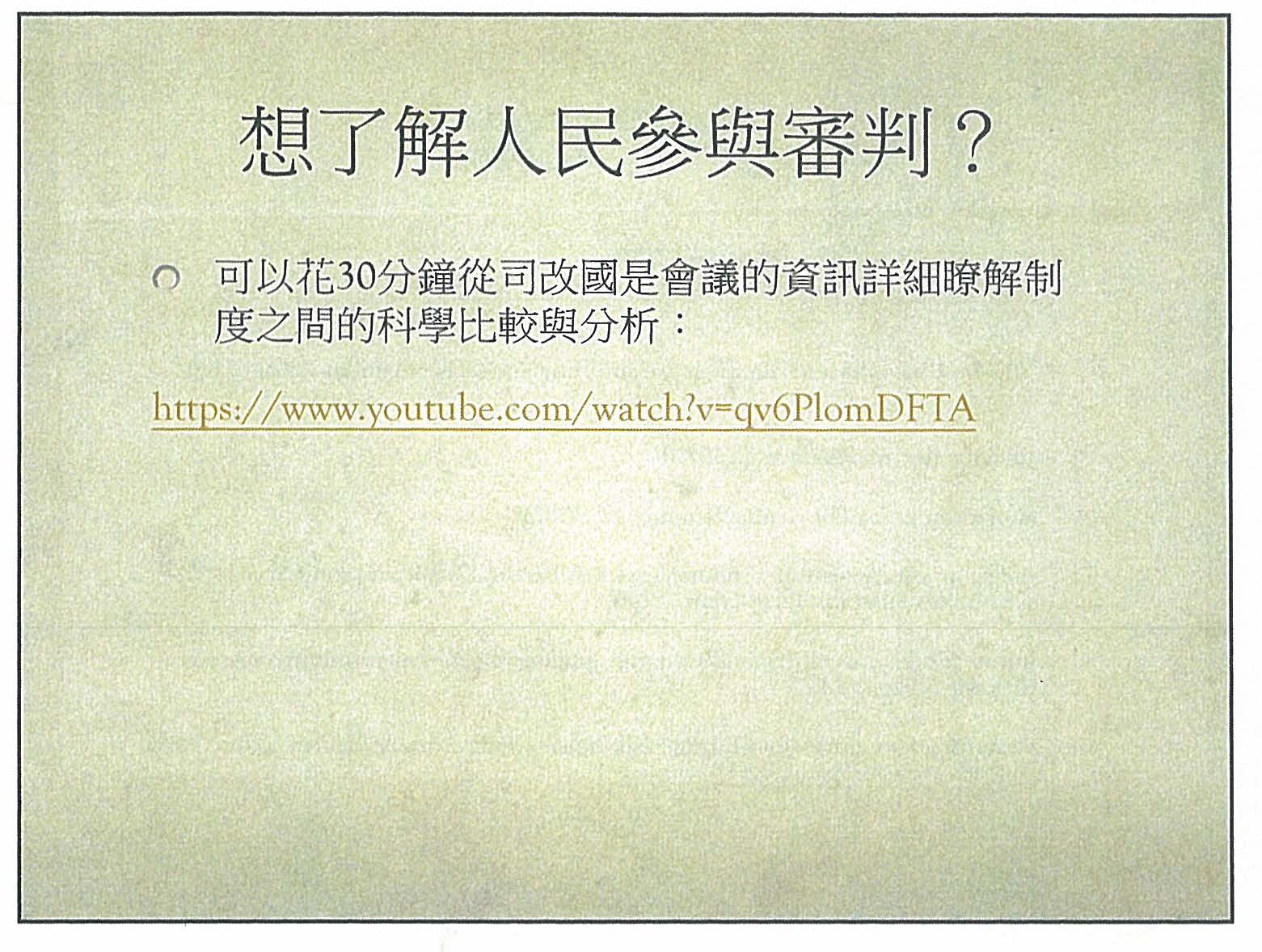 至於參審和陪審到底哪個好?我要提醒一下,陪審有三個特徵,第一個,法官和陪審員「並無對話,互不溝通」;第二個,陪審的判決「只有結論,沒有理由」;第三個,陪審的審判基本上是「不能救濟,無可翻案」。當我們在思考這個問題的時候,想想看,如果一個殺人案件,不管大家對這個被告的觀感怎麼樣,不管結論是有罪還是無罪,我們竟然不知道他是基於什麼樣的事實認定,我們不瞭解真相是什麼,或是他基於什麼情況被判有罪,我所謂的不瞭解是指外界不瞭解,一般民眾不瞭解,我覺得這個值得再去思考。