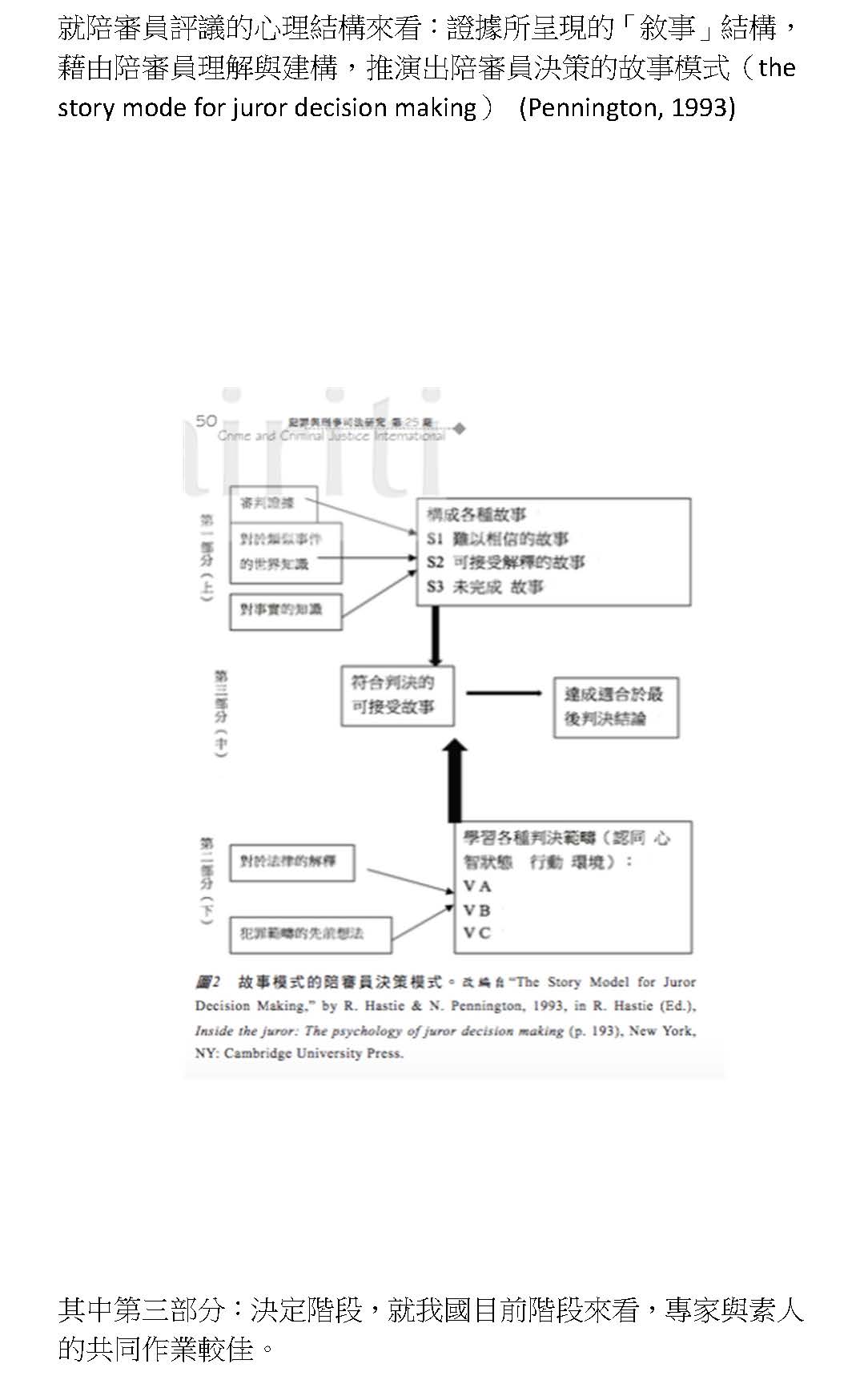 其實我自己在去年就曾經針對嘉義地院的模擬法庭提出研究,這些研究結果可以提供給大院作為判斷的標準。如果我們聚焦於評議階段,也就是法官要不要參與最後量刑的評議?大家一直說陪審制法官沒什麼事做,其實我覺得這有一點言過其實。在陪審制裡面,法官也必須做法律的解釋,讓一般平民了解。有一位研究司法心理學的心理學家提出了故事模式的理論,我在文章裡面引用了這個理論,並且把它翻成中文。重點就是陪審團在決定事情時有三個階段,第一個階段,他在審判的過程中吸收了這些證據,並且在他的頭腦裡面構成了一些故事,這些故事可能是很難相信、可接受或是未完成的。第二個階段,他可能會加入他的生活經驗,包括以往他對於犯罪或法律的解釋,進而產生一些看法。最後一個階段,他會把這兩者結合在一起,做出一個評決。