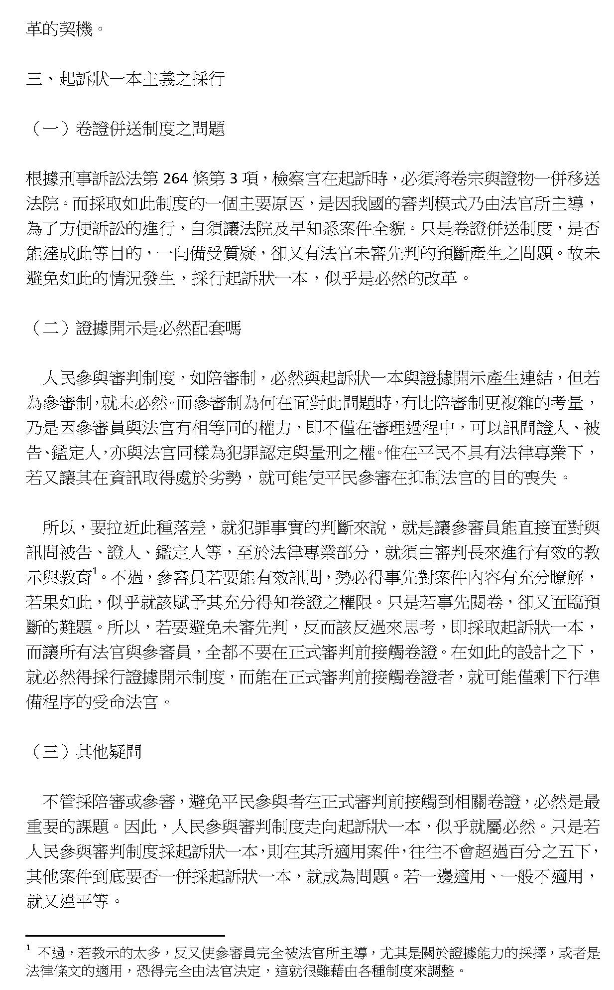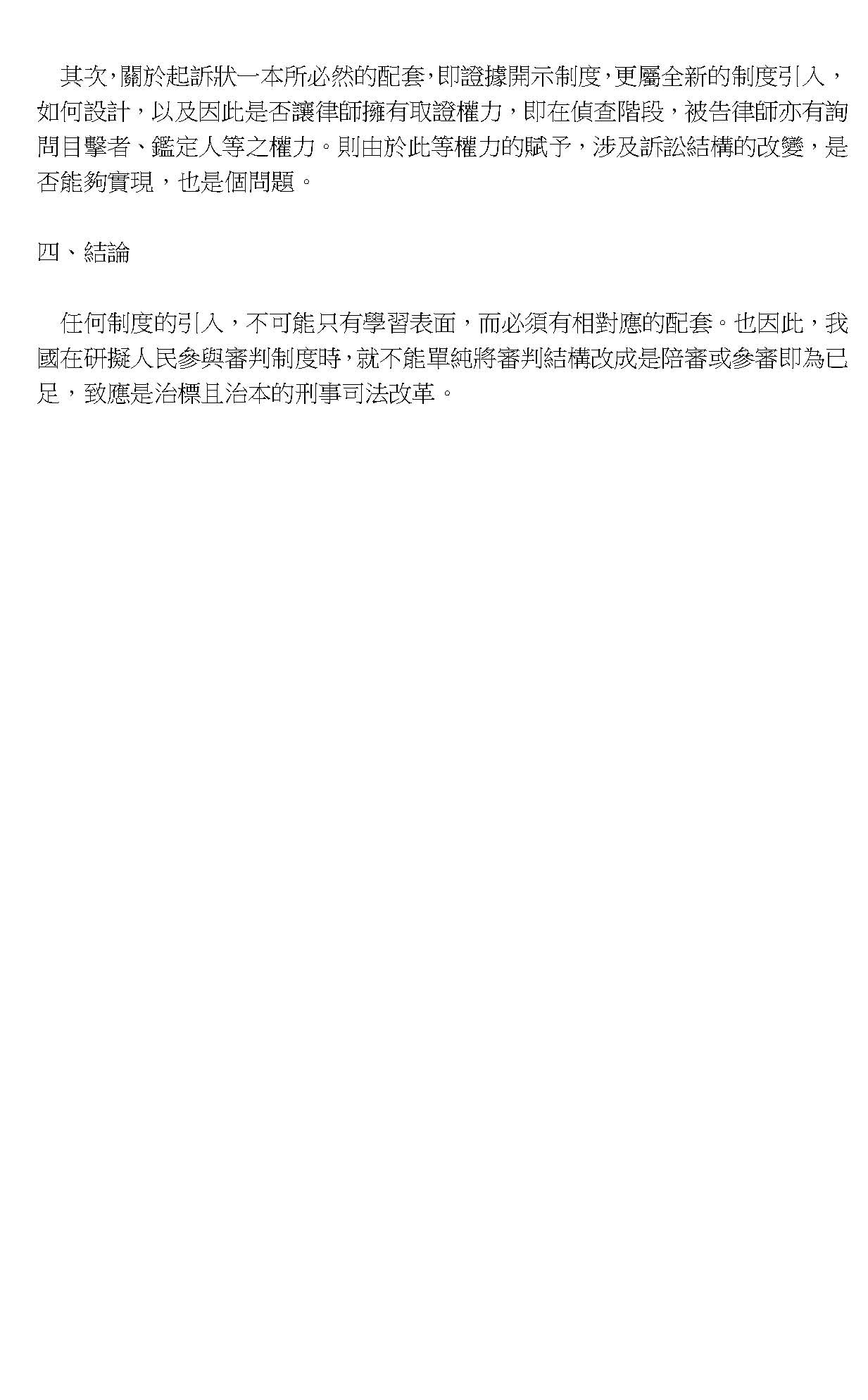 關於提綱的第三點,施行人民參與審判制度的國家,檢察官採取訴訟一本主義,我覺得這個部分也必須一起改變。如同我剛才所提到的,我們必須要預防參審制的參審員或是陪審制的陪審員在心證受到影響。其實我國目前的刑事偵查是採卷證併送制度,檢察官在決定起訴之後會把起訴的卷證轉交給法院,那麼法官就可以先做功課,而法官在閱覽這些卷證之後到底有沒有先入為主的心證,這一點只有法官自己心裡知道。或許我們可以說法官是專業人士,因為他是職業法官,但是他能不能恪守無罪推定的原則呢?這個也不無疑問,事實上也取決於法官個人,但是如果今天我們把同樣的卷證和相同的證據交由陪審員或是參審員先行閱覽的話,會不會影響這個無罪推定的進行?我覺得這個也是我們應該考慮的,所以就提綱的第三點,我要呼應前面先進所說,的確在刑事制度上必須一併來修正。