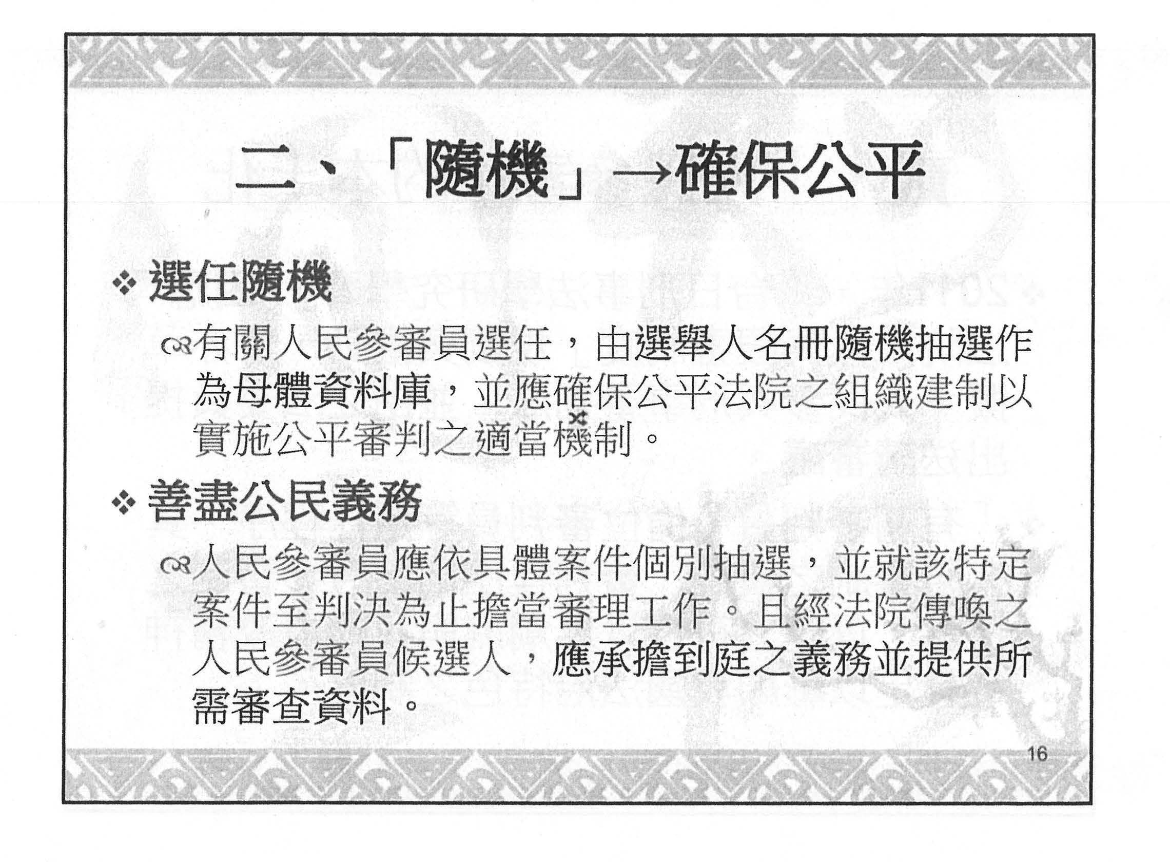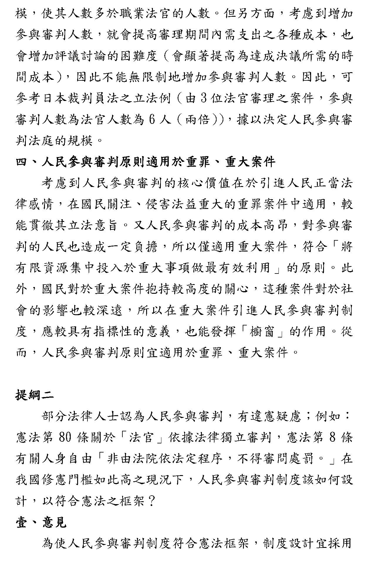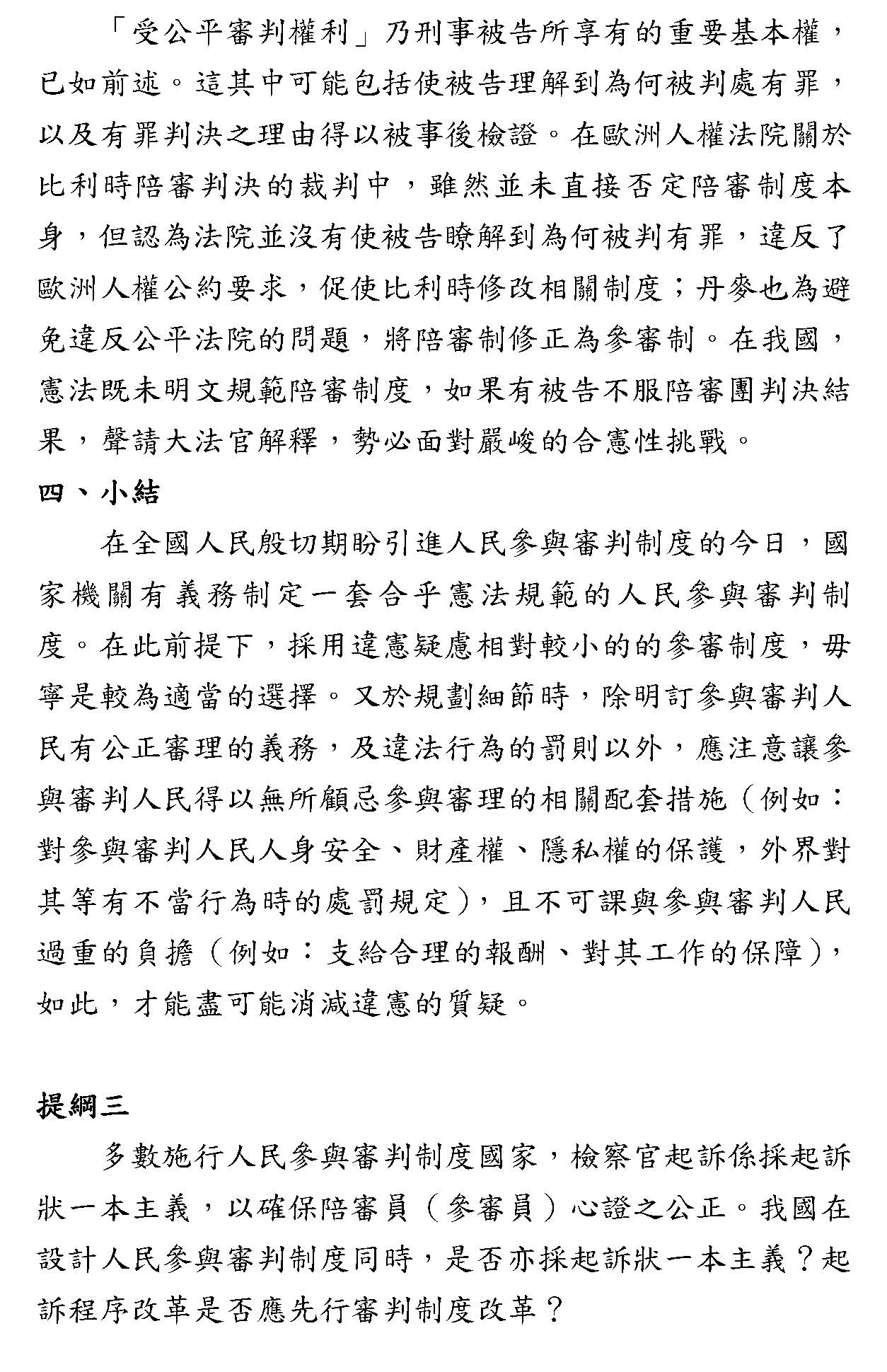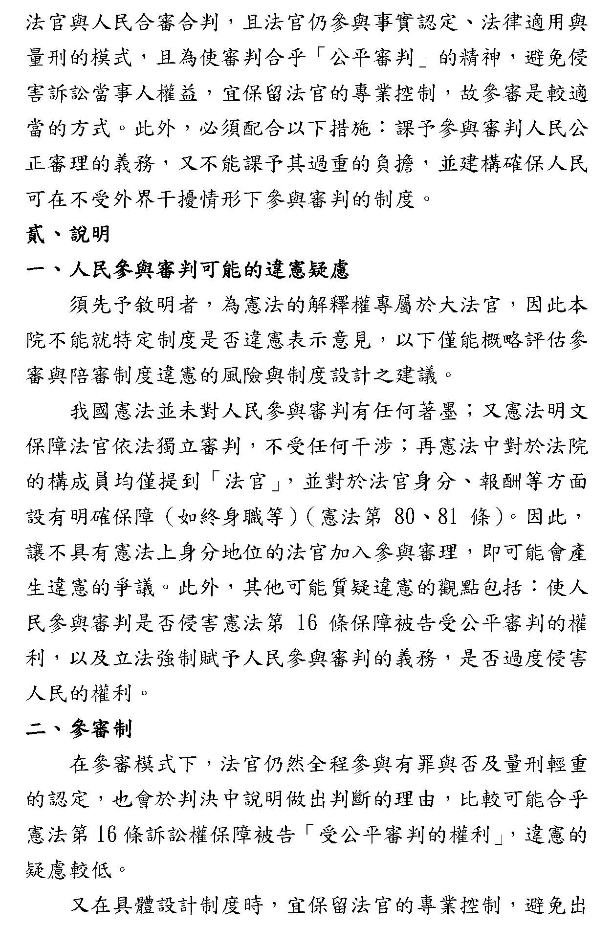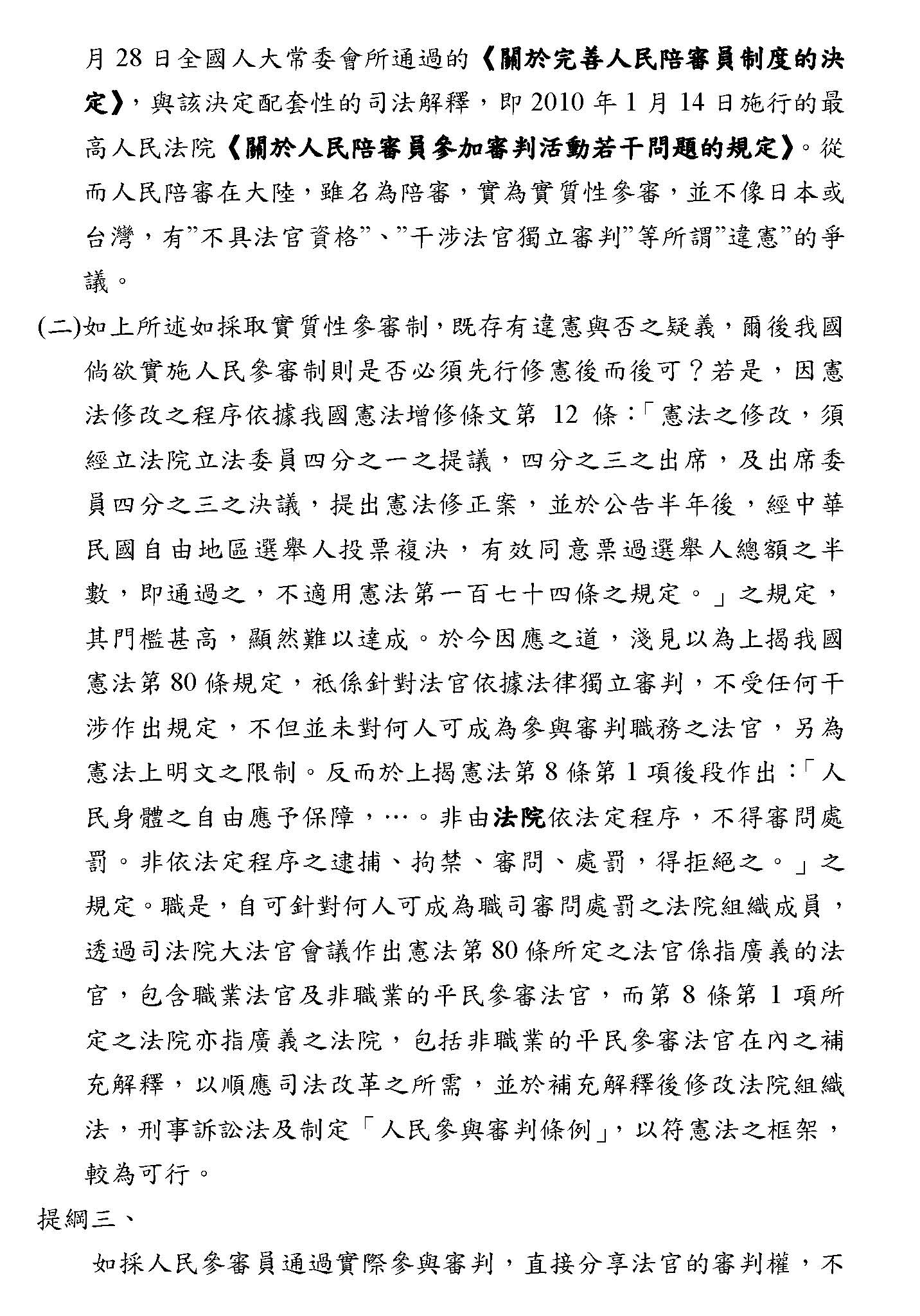 提綱二是有部分法律人士認為人民參與審判,有違憲疑慮,當然對於這個議題有各種不同的主張,本院目前的看法是,在全國人民都希望引進人民參與審判制度的時候,國家有義務要制定一個合於憲法規範的人民參與審判制度。在大家討論的時候,比較少人主張有違憲的情況,因此參審制度似乎是一種可以採取的模式。如果考慮到可能會有違憲的疑慮,我們認為可以在規劃細節的時候,規定參與審判的人民有公正審理的義務,且有違法行為的罰則,注意讓參與審判的人民可以沒有顧忌的參與審理的種種配套措施。而且不可以課予其過重的負擔,如此才能減少違憲的疑慮。