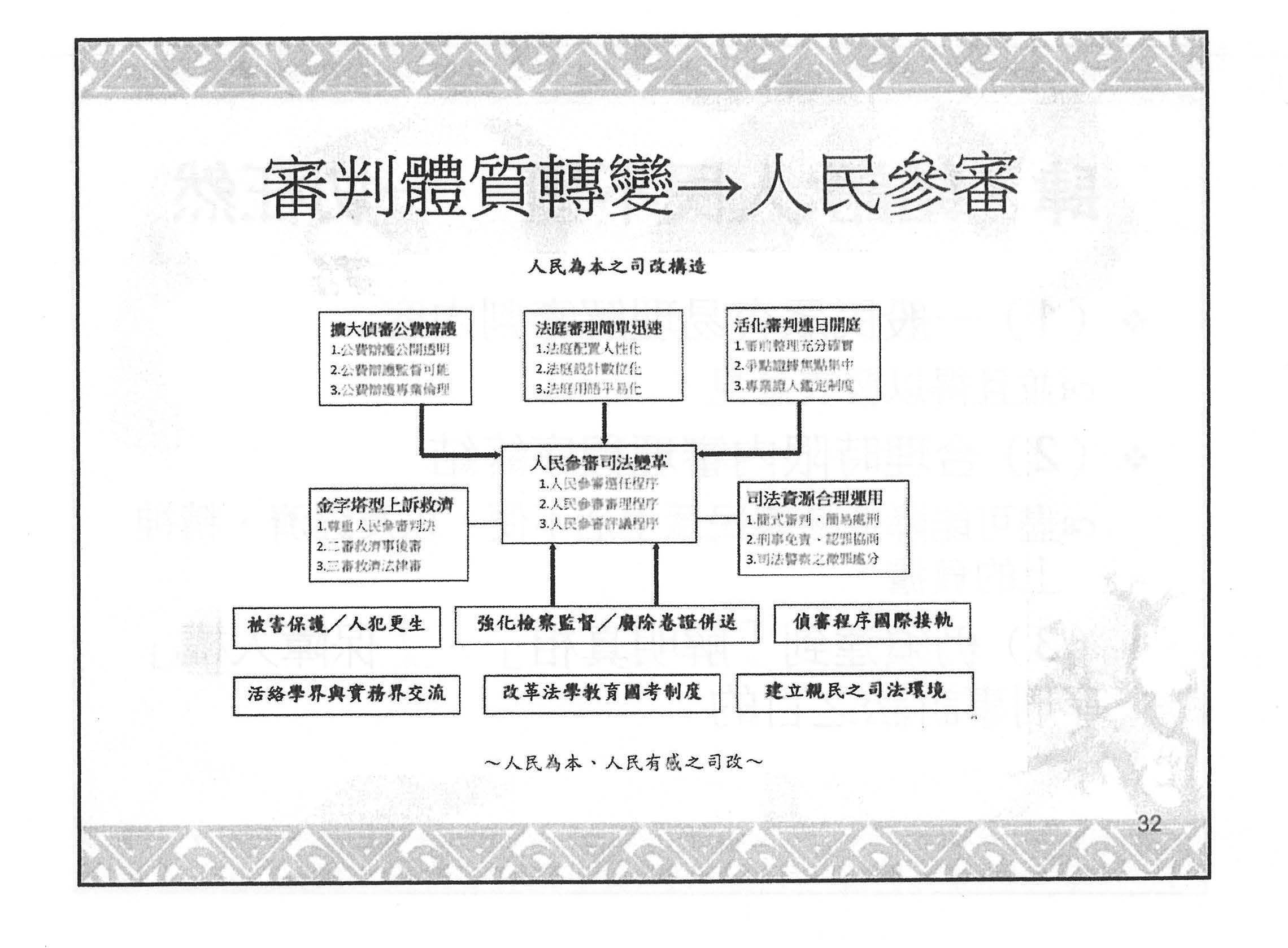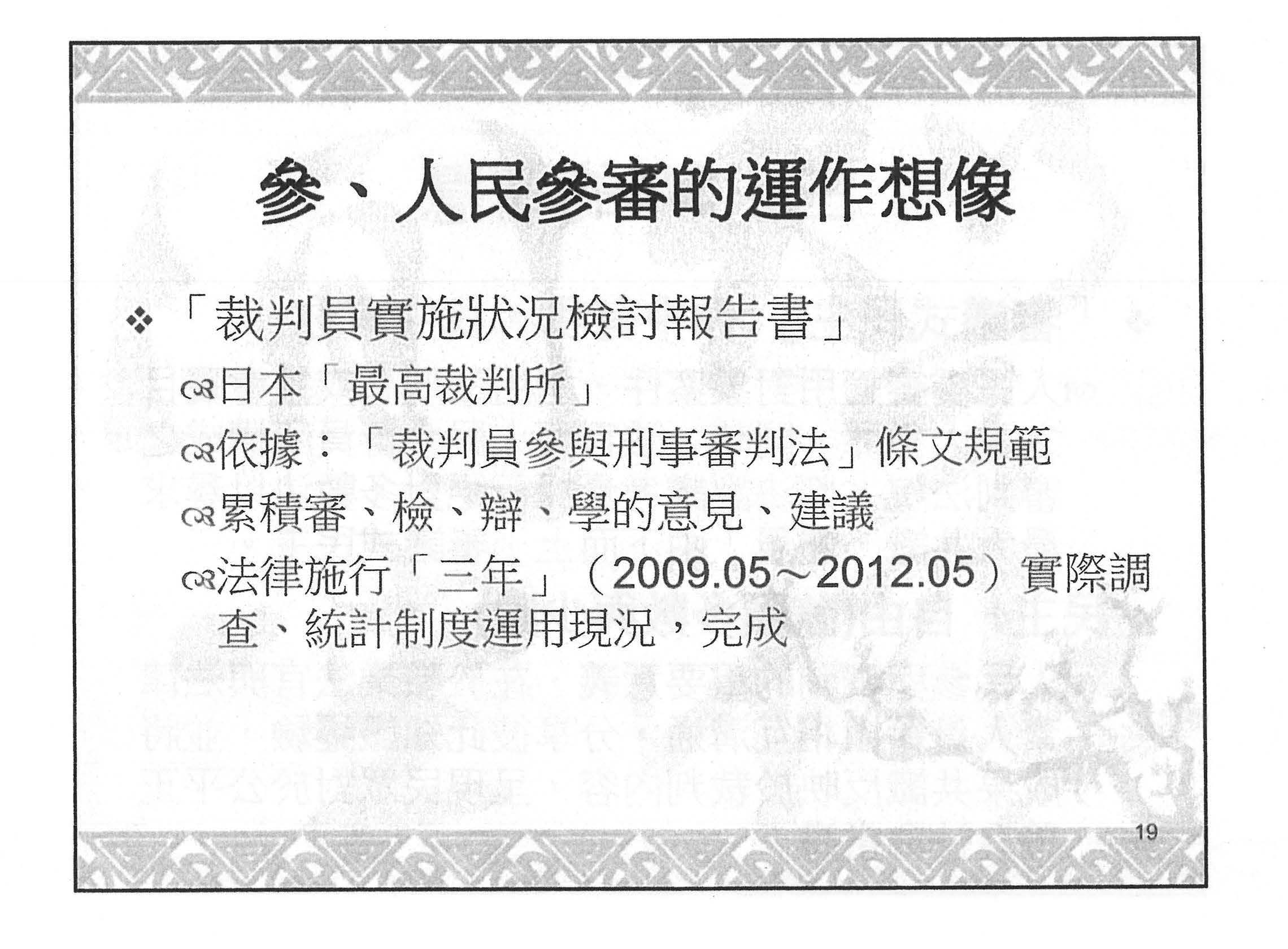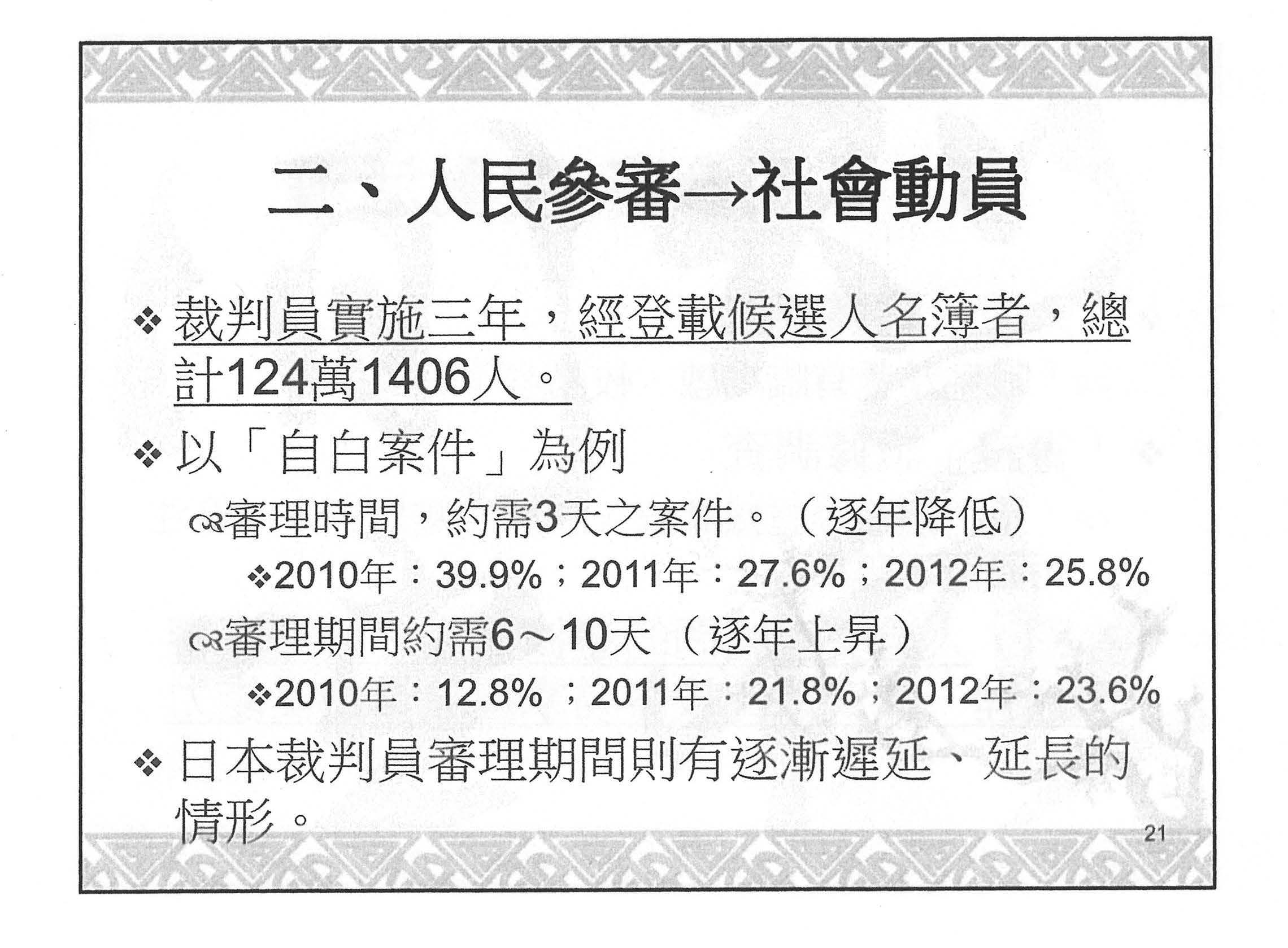 我剛才提到日本,這也許是歷史的巧合,我們今(2017)年還在做司改國是會議,可是大家印象應該很深刻,1999年其實臺灣也開過全國司改大會,巧合的是,同時間日本、韓國也在做司改,十餘年過了之後,日本在2004年5月已經立了類似裁判員參與刑事審判的法,法也實施了;2007年韓國也訂了一個法,他們輸人不輸陣,一定要比日本快,所以韓國在2008年1月1日就開始實施。簡而言之,在21世紀的潮流中,你要推司法改革,若沒有人民參與審判制度,可能有點跟不上時代潮流。再看日本的例子,他們的這個制度不叫做參審,參與的人稱作裁判員,席次分配大致是:中間3位法官、旁邊6位是一般民眾。至於韓國,若稍微瞭解他們的實質內涵的話,他們應該不敢稱之為陪審,其法律名稱叫做人民參與審判,雖然他們一般俗稱其為陪審員,可是從專業或比較法的角度來看,實質運作上並不純然是陪審制。