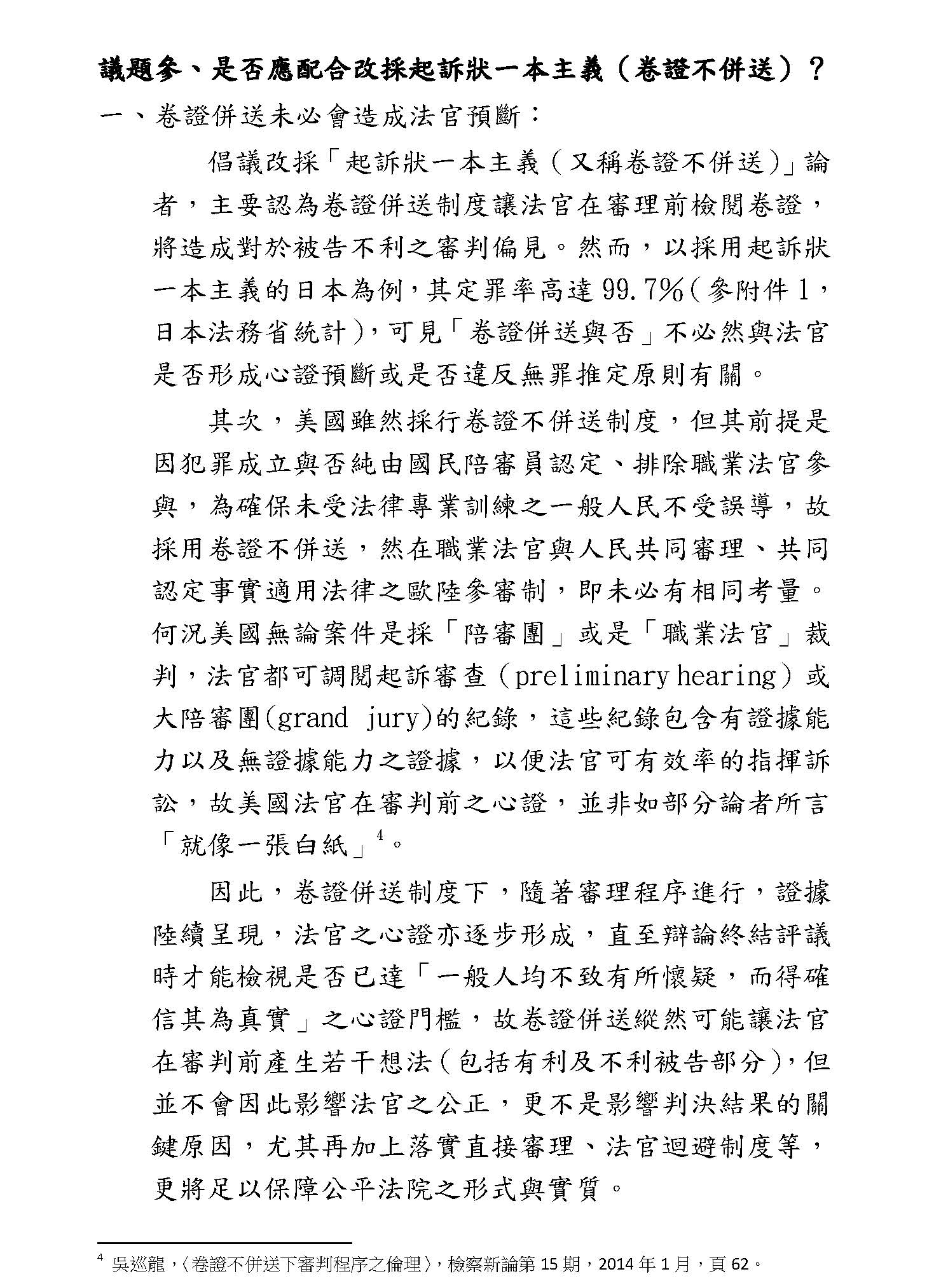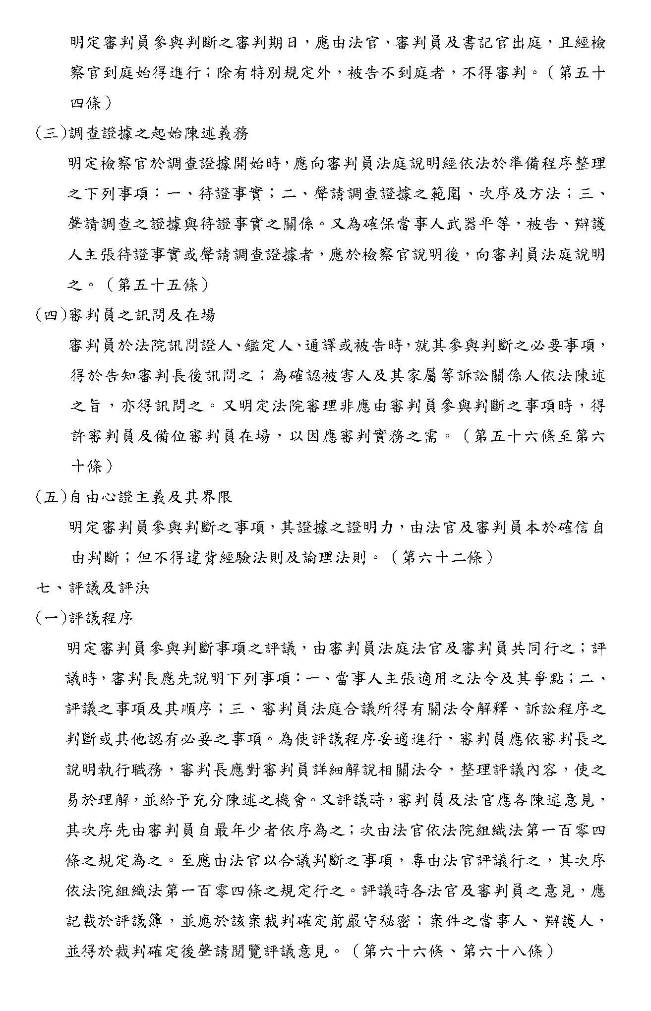 關於提綱三是否亦採起訴狀一本主義這個部分,照本院目前的想法,我們規劃中的人民參與審判制度適宜採取起訴狀一本原則,因此在刑事訴訟法修正需要一些時間的情況之下,應該可以考慮先行於人民參與審判相關法案中訂定特別規定。