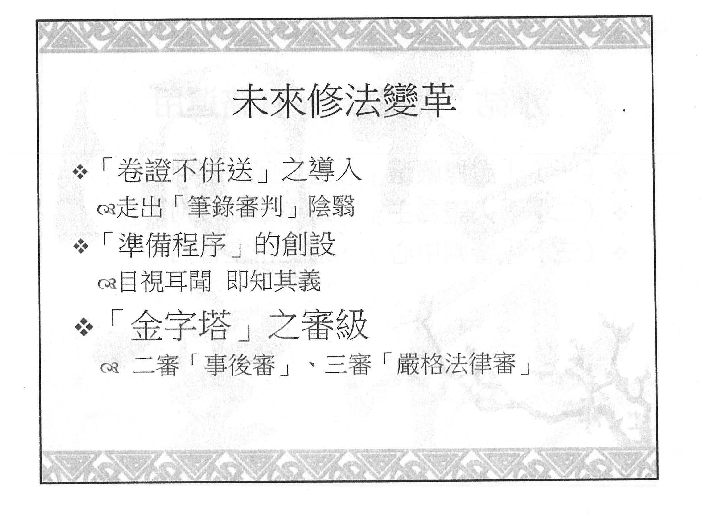 我最後的結論還是要呼應前面的講法,如果沒有起訴狀一本主義,沒有證據法則的修改,沒有相關審級制度的修改,我相信我們沒有資格談人民參與審判制度,以上,謝謝各位。