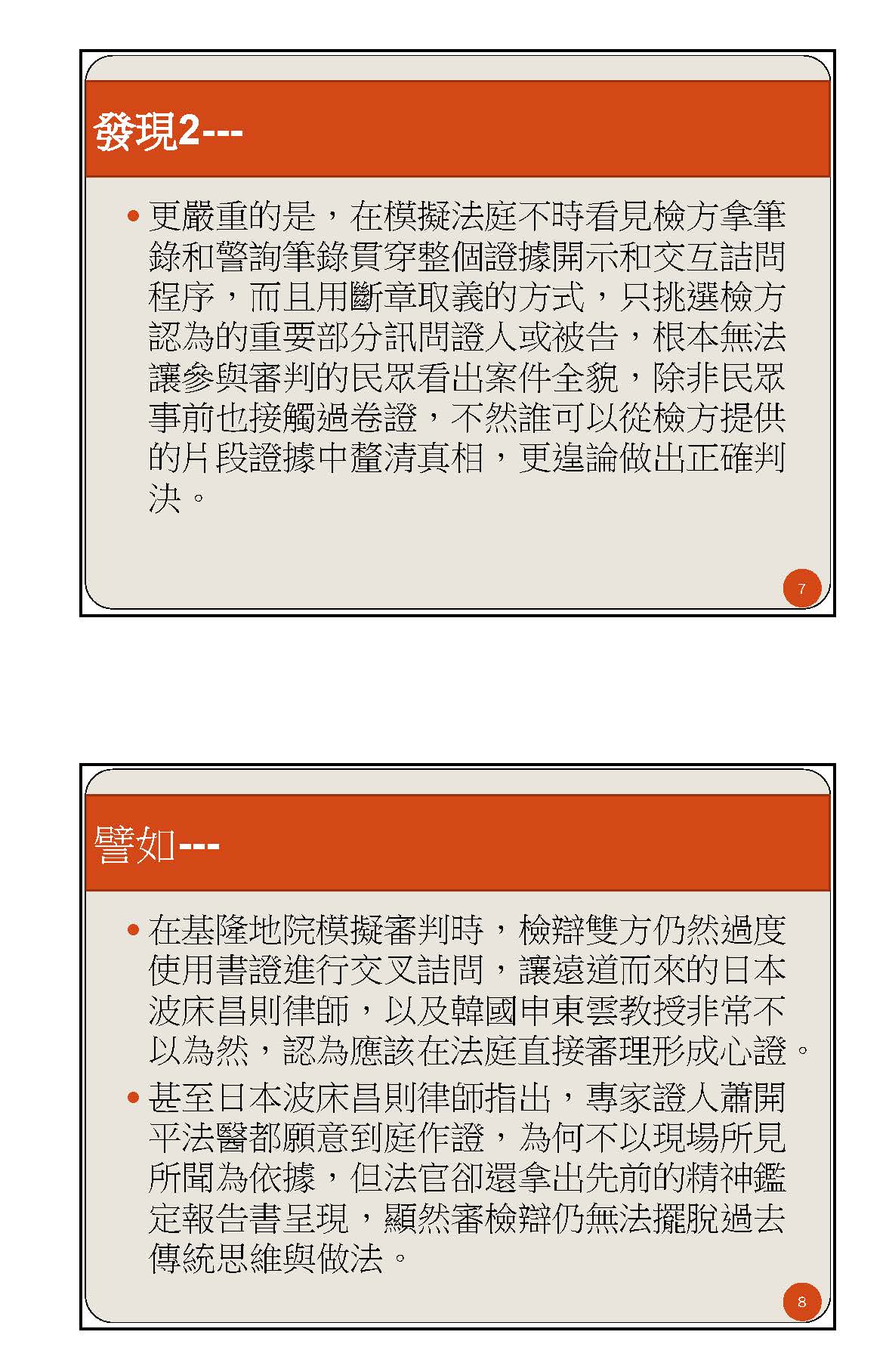 第二個,更重要的是,因為沒有起訴狀一本,所以你可以發現台灣模擬審判的制度和其他國家有很大的不一樣,我們永遠都是拿著警詢筆錄、偵訊筆錄在詢問被告所做的犯罪內容和當初所做的筆錄是否一致,他只問重點,完全不會在現場把事實從頭到尾陳述一遍,當沒有接觸過卷證的人跟著有接觸過卷證的人只講重點,你覺得人民可以做出正確的審判嗎?譬如說我去基隆地院,看到的是檢辯雙方過度使用書證進行交叉詰問,讓從日本遠道而來的波床昌則律師以及韓國來的申東雲教授非常的不以為然,認為應該在法庭直接審理形成心證,台灣怎麼會是這樣子在做模擬審判?日本波床昌則律師甚至指出,那一天好不容易請了一個真正的專家證人蕭開平法醫願意到庭作證,為什麼法官還是拿出精神鑑定報告來呈現?且從頭到尾都沒有趁著法醫、專家在現場的時候把它問清楚。所以你可以發現,如果模擬審判還是不主張起訴狀一本的話,我們的審判過程永遠不會擺脫過去傳統的思維和做法。因此我認為,比起過去的審判,人民參與審判至少可以落實無罪推定原則與集中審理制度,更能解決審檢一家親,落實審檢分隸,並且能避免侵害被告權利。不管是日本的裁判員制度、韓國的混合制或美國的陪審制,都要在起訴狀一本的前提下,除非你想學的是德國的參審制,它並沒有主張起訴狀一本。