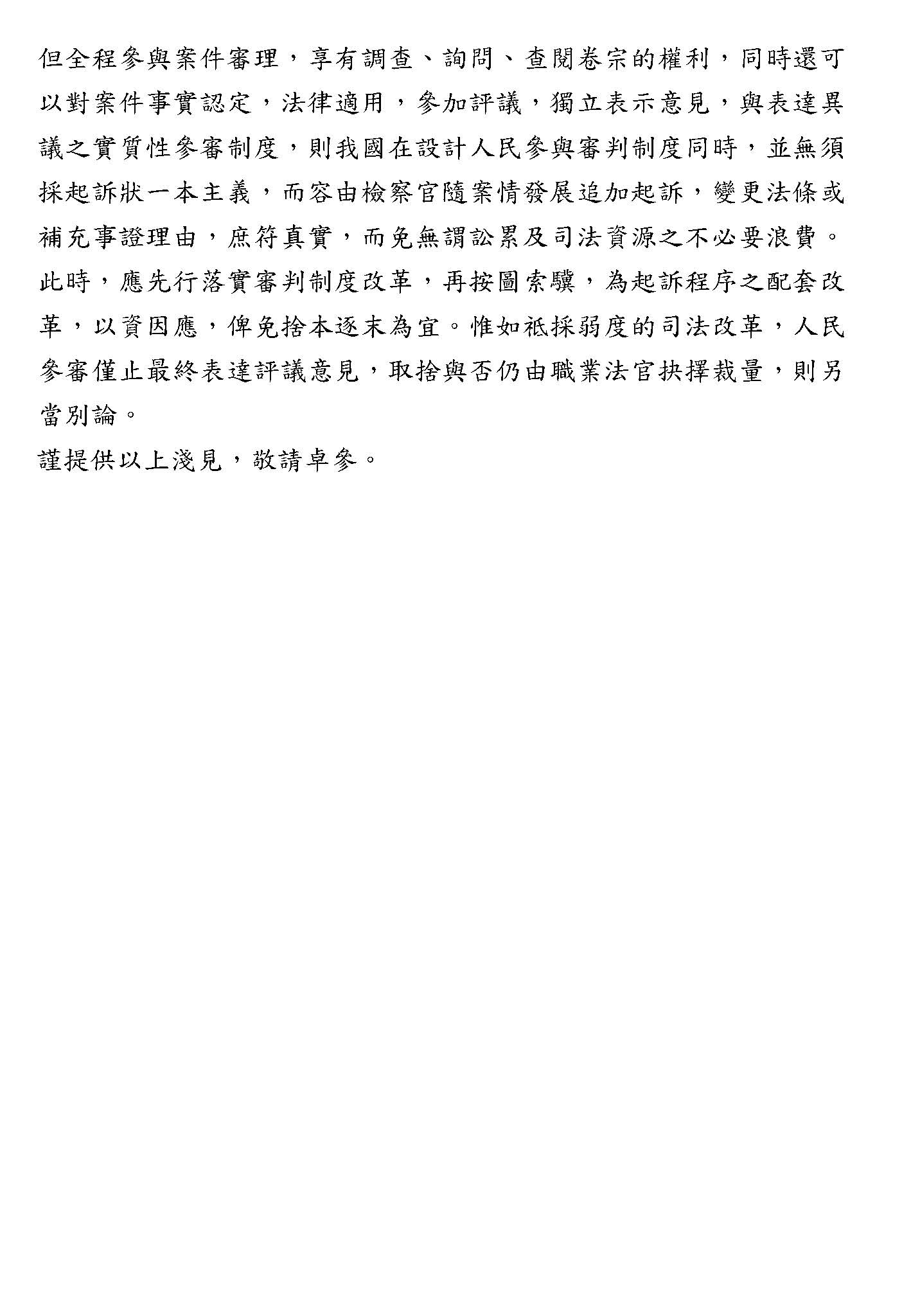 我認為人民參審若能有配套措施,並讓一般民眾瞭解,應該會獲得更大支持,謝謝。