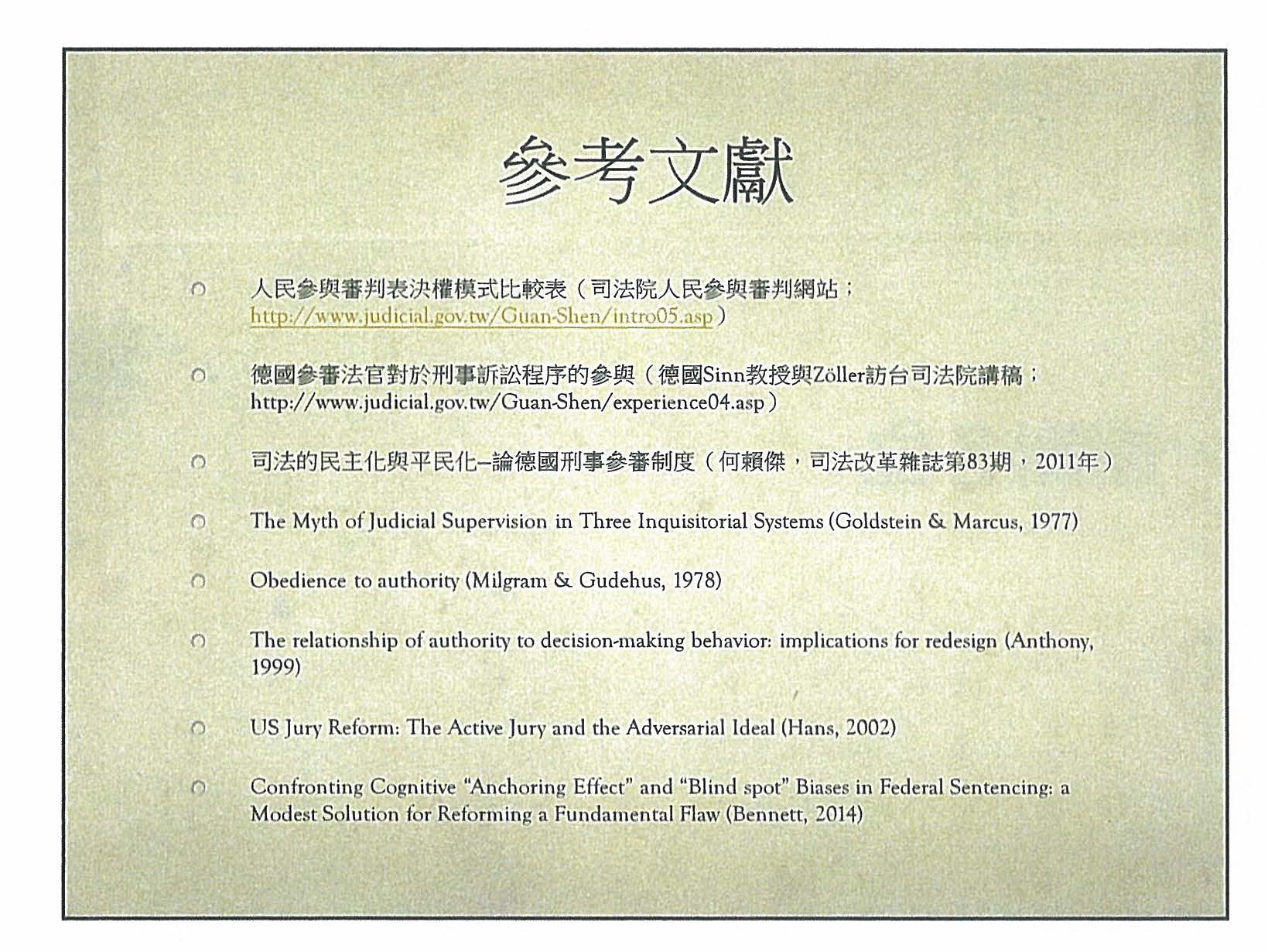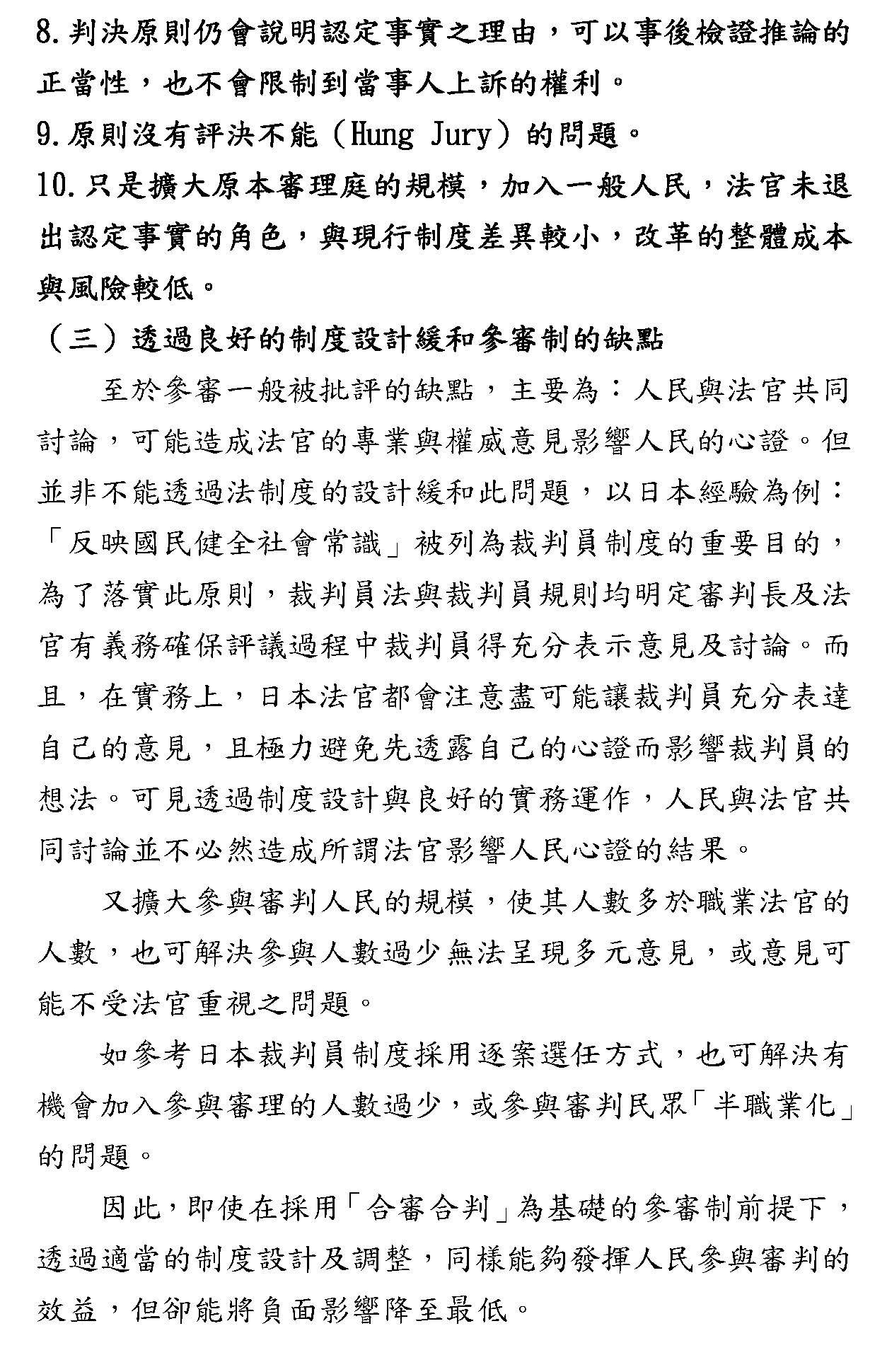還有就是法官人力資源善用的問題,為什麼參審制是一個全世界最複雜的制度?因為它是六個參審員形成一個決策圈,然後三個法官又是另外一個決策圈,當兩個意見有衝突,又要去解決這個問題。陪審團是讓法官最省時,他不用先去看卷證,也不用再去做職權的訊問,只要聽誦就好了,這樣法官很好做,我們現在都已經沒有辦法去負荷這個人力,還要採一個最複雜的參審制,讓法官又更累,還要寫判決書,我覺得如果採參審制,對台灣來講會是一個災難,這不是真的改革,只是找人民進來背書,然後又累死我們的法官,最後又得不到人民的尊敬,所以我還是認為我們應該採用可以被尊敬也可以省時,又讓大家覺得是一個比較公正的陪審團制度,我強烈建議台灣真的要改革,是要一步到位的改革。