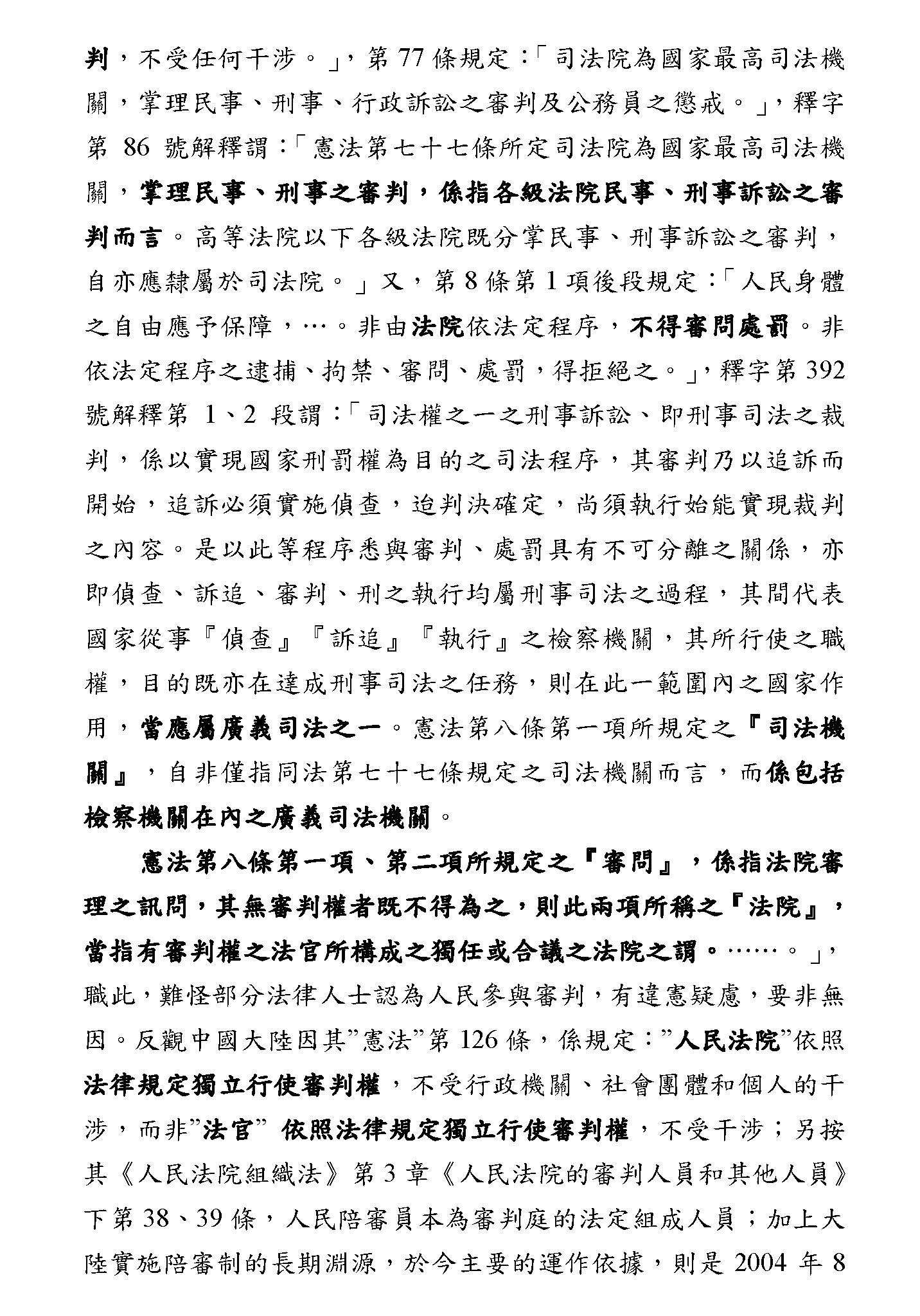 我國憲法第八十條規定:「法官須超出黨派以外,依據法律獨立審判,不受任何干涉。」第七十七條規定:「司法院為國家最高司法機關,掌理民事、刑事、行政訴訟之審判及公務員之懲戒。」又第八條第一項後段規定:「人民身體之自由應予保障,……。非由法院依法定程序,不得審問處罰。非依法定程序之逮捕、拘禁、審問、處罰,得拒絕之。」釋字第392號解釋第1、2段也都有提到。我的意思是,憲法對於誰是實質法院的概念,在很多解釋裡都是採廣義解釋,而且所規定之「審問」,係指法院審理之訊問,其無審判權者既不得為之。我認為前面第八十條提到的法官獨立審判,是針對法官在執行審判職務時,應該守的態度,而不是講說不是職業法官就不能審判,沒有這樣的意思。第八條講的法院如果指的是廣義的法院,那以後的平民法官也是廣義法院組成的一份子。有人認為這有違憲之虞,我認為可以透過大法官會議補充解釋,把相關憲法條文解釋清楚。因為過去我們並沒有參審和陪審的制度,所以大法官解釋時還來不及解釋,現在大家對司法改革的期待殷切,可以透過大法官會議補充解釋,把日後的平民法官也做為廣義法院組成的一份子,那就沒有違憲之虞,這樣的作法比較方便,否則如果照現有憲法增修條文第七十四條規定的門檻,那麼難度將會非常大,根本做不到,所以,違憲的部分,我認為可以透過解釋來解決。當然,相對應還要修正法院組織法、刑事訴訟法,並制定專門參審的相關法律,這個問題就可以解決。