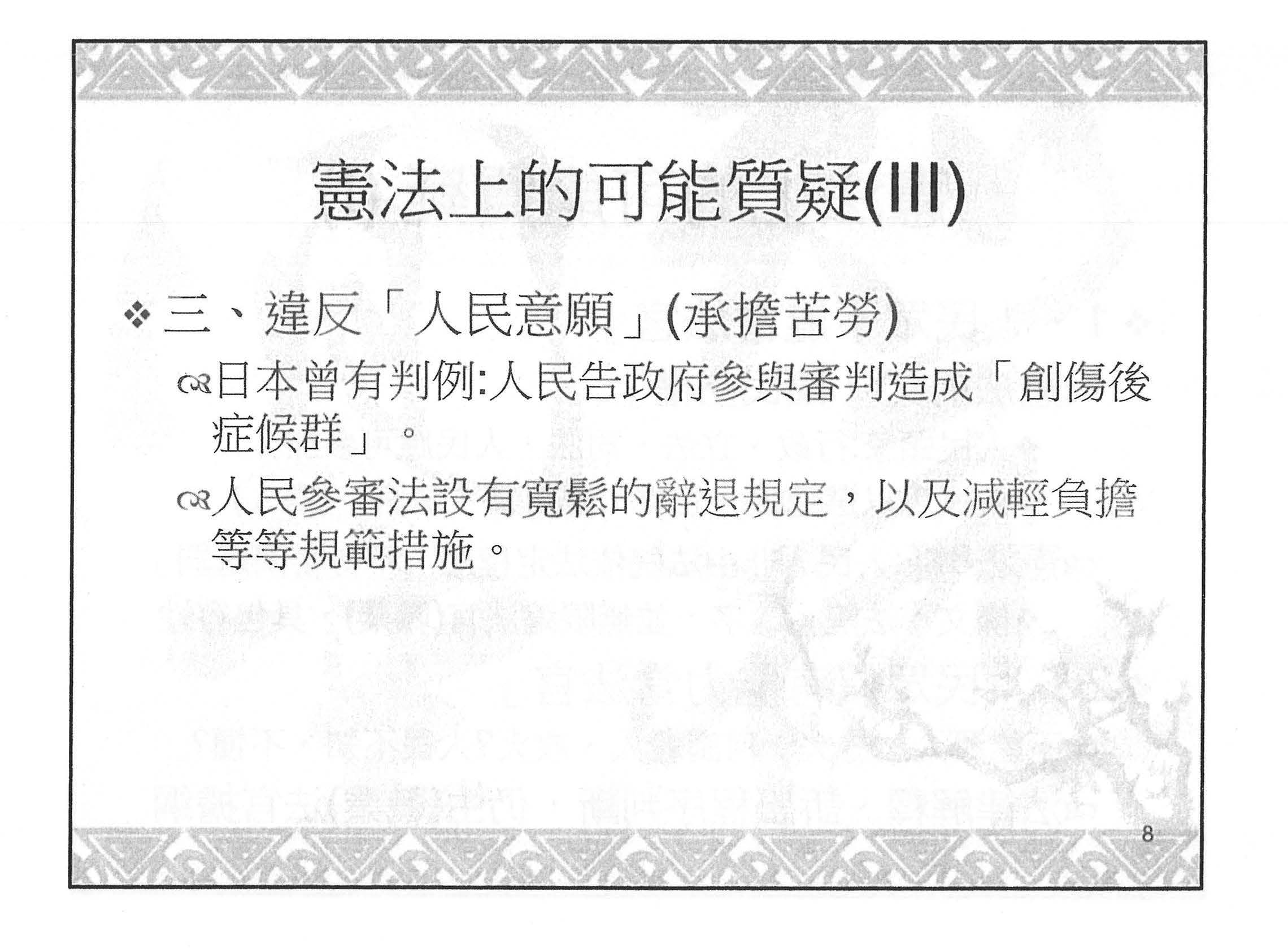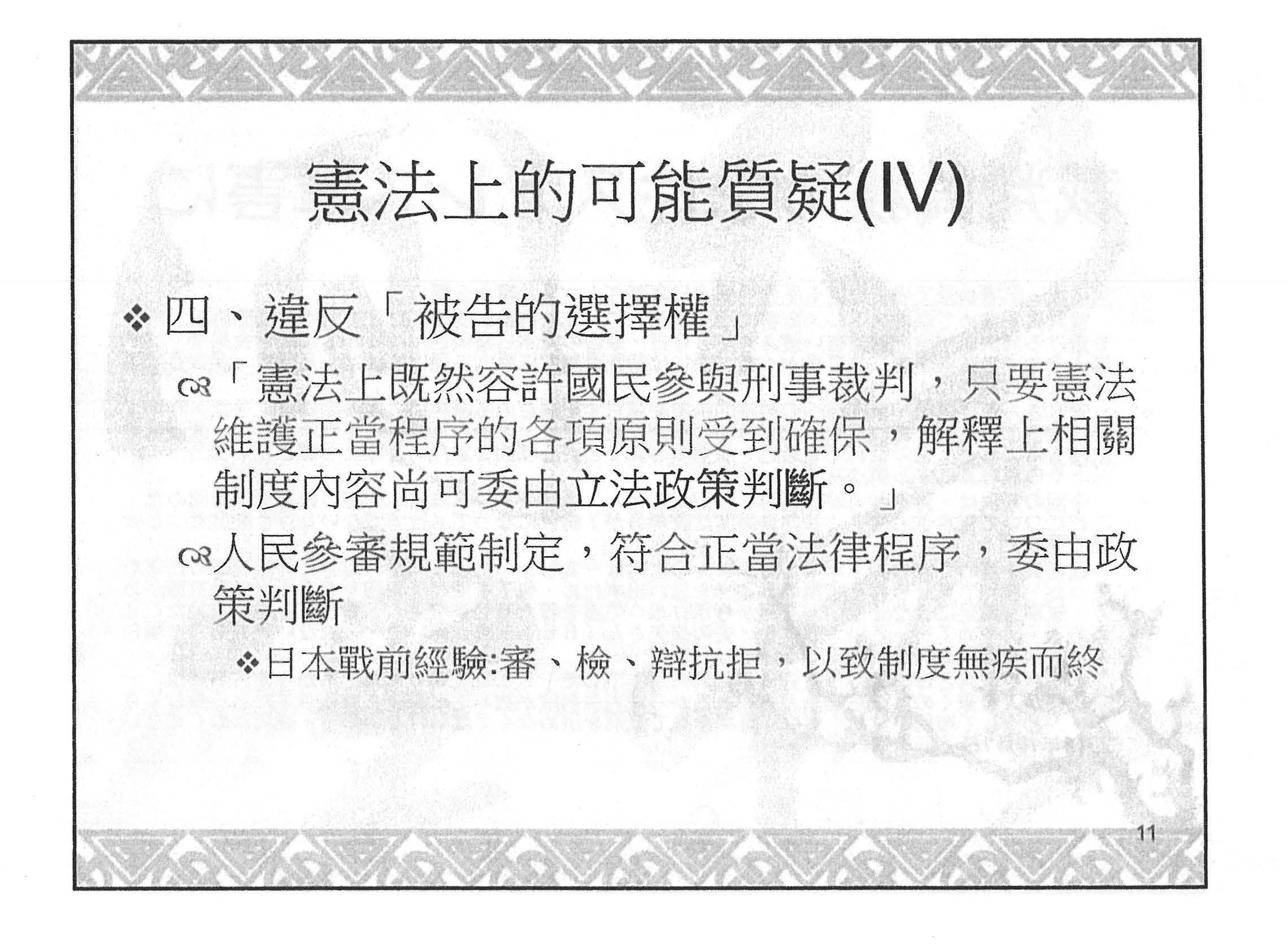 以上是從當法官的這一面來看,但是我們從被告的角度來看,他會覺得奇怪,為什麼我的犯罪一定要讓人民來審?我要選職業法官來審不可以嗎?剛才有提到日本的憲法判決,我認為重點是在於制度設計,到底這個設計有沒有違反正當的法律程序?如果沒有違反的話,被告即使沒有選擇權,他不接受人民參與審判,我們剝奪他這個權利也沒有違反他的基本權利,也就是回到憲法第八條,到底我們制定出來的這個程序有沒有違背正當程序的保障?