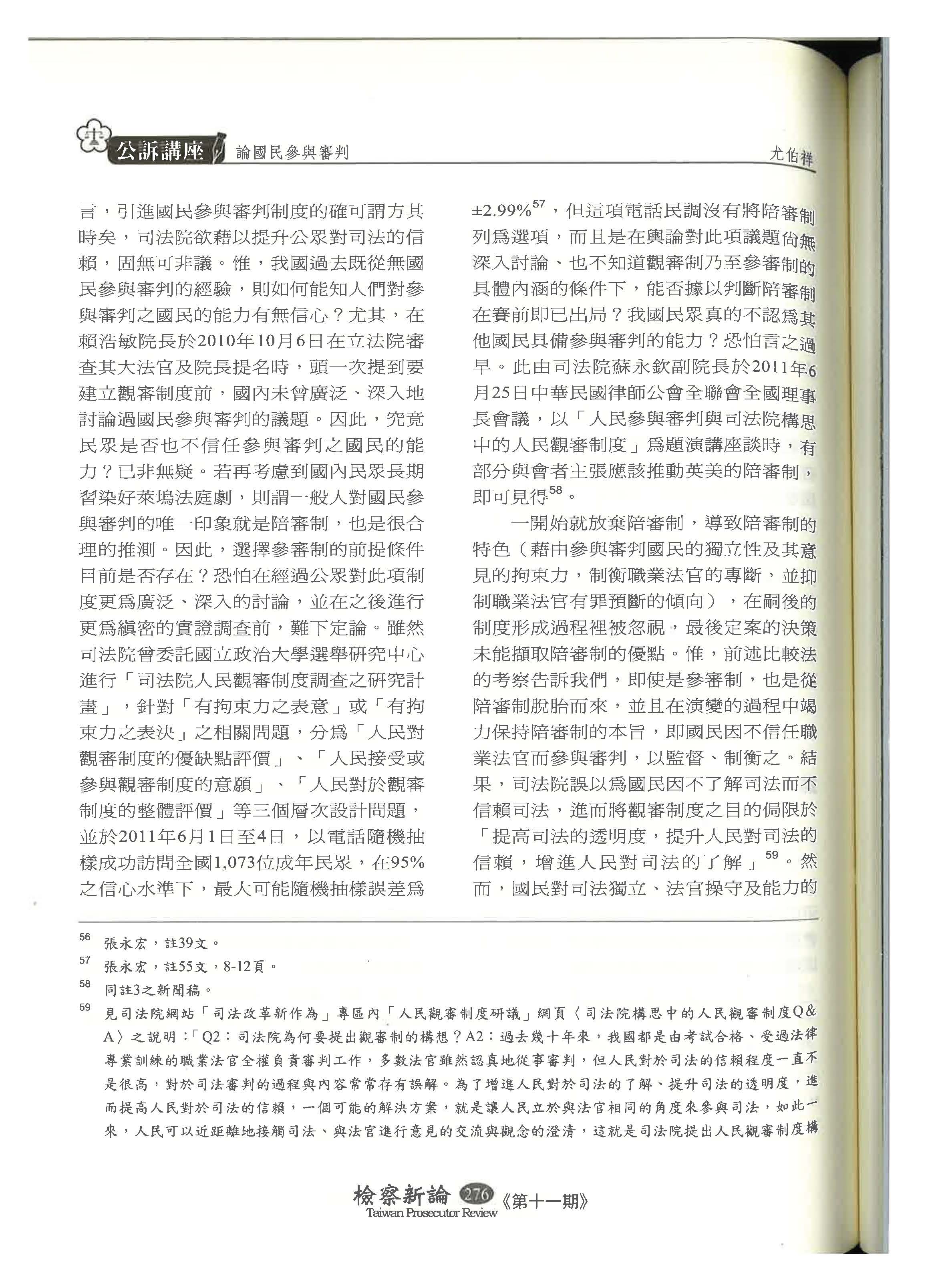 第二個,我要提醒司法院,各國的經驗和學者都不斷指出我們只要引進的話,大部分都是混合制,沒有純粹的參審制,所有的參審制都是一種混合制,純粹的大概只有陪審制,所以只要你設定政策說要引進參審制,其實你的意思就是獨排陪審制,那你就要小心你的說理和論證,你為什麼要排斥陪審制?你沒有實證就說不出一個道理來,除非你真的去操作。你說可能因為台灣的媒體太發達,在操作之後我們發現不可行,因為只要案件一發生,像剛才教授舉例的小模閨蜜也好媽媽嘴案也好,全民都被污染了,所以找不到陪審員,你要有這樣的實證數字來說明因為台灣太小,所以我國確實不適合陪審制,要不然的話,大家都是在猜測。所以我提醒司法院要很小心,你們的政策走向都是排除陪審制,可是你要知道現在台灣人民一般都比較期待陪審制,原因很簡單,因為陪審制是分享法官的權力,我們引進人民參與審判制度最大的目的是因為人民不相信司法,但其實我覺得我還滿相信台灣的司法。