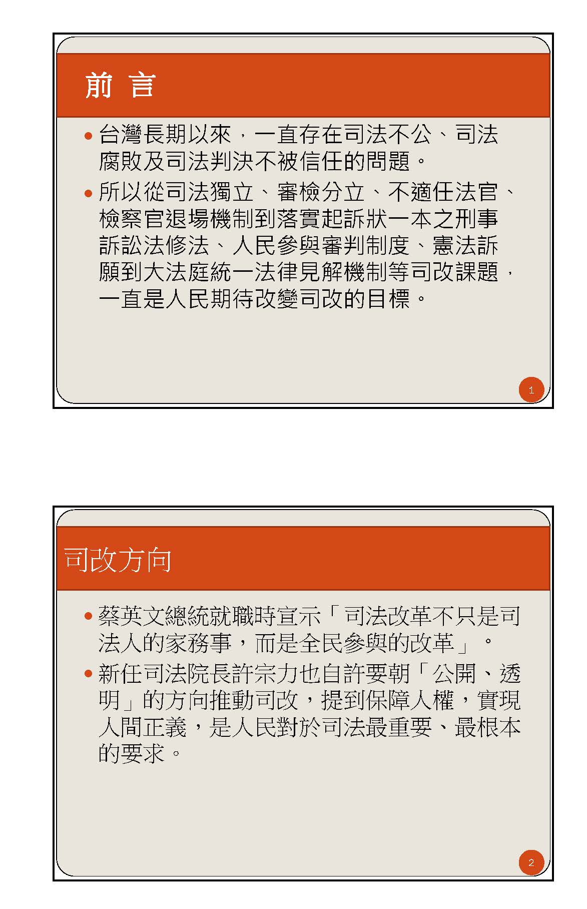 大家都知道在這次的司改國是會議,人民參與審判到底要採取什麼樣的制度是一個非常重要的重點。我們可以看到它的前言最主要是要解決台灣長期以來司法不公、司法腐敗及司法判決不受信任的問題,有很多的問題需要解決,但是我們今天僅就人民參與審判的制度來討論。我們從螢幕上可以看到,蔡英文總統說司法改革不是司法人的家務事,所以我今天僅就法律人來管一下這個事情。新任的司法院院長也說要推動公開、透明的司法改革,也提到保障人權、實現人間正義是人民對於司法最重要、最根本的要求,所以我希望我今天更是一個重要的角色,因為我是非法律人。