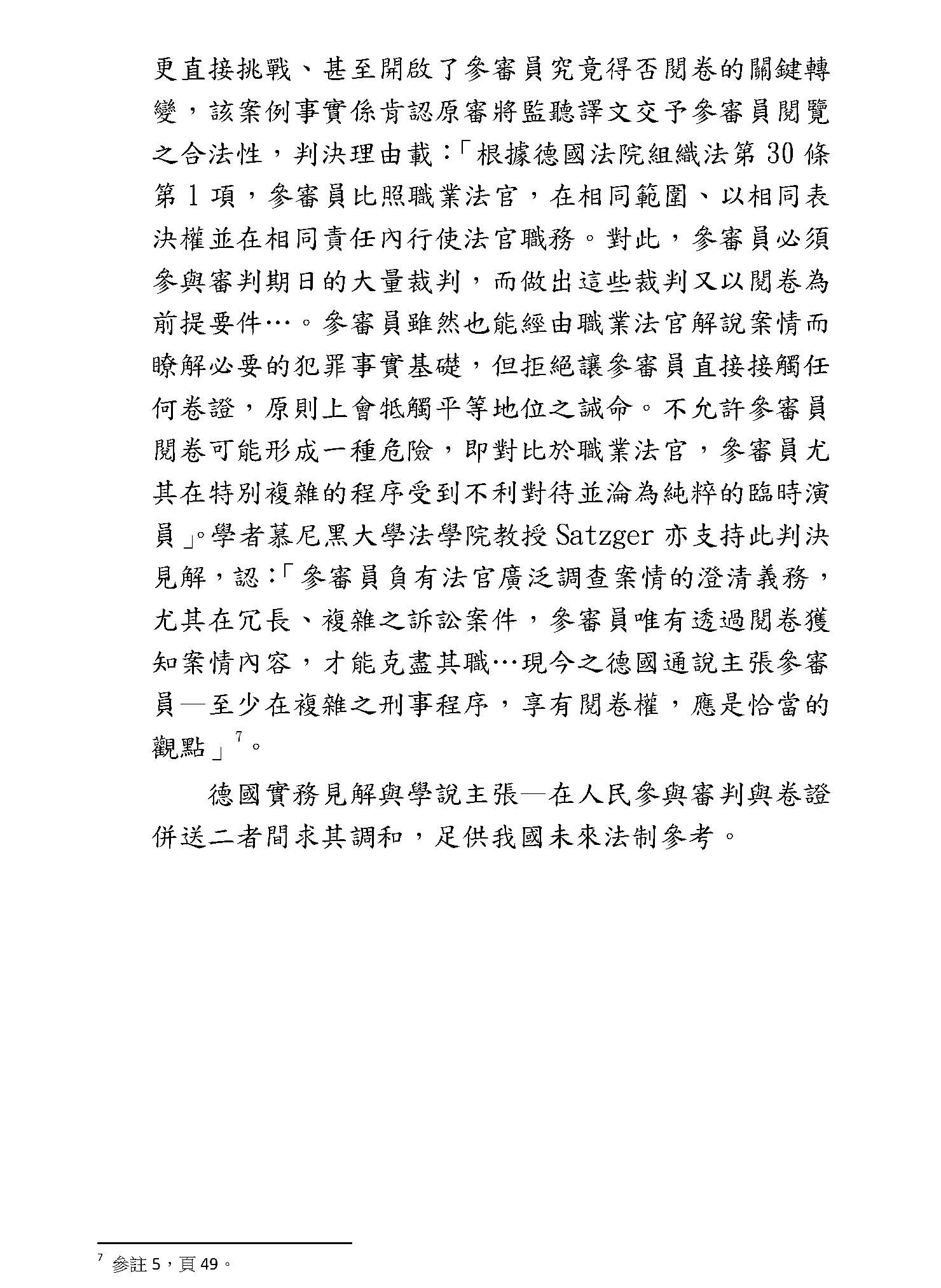 我剛才已經介紹過,我觀摩了這麼多國家的人民參與審判制度,而且官方和民間所有該去的模擬審判我都去了,剛才說的高雄地院模擬法庭我也去過,所以我有很深刻的瞭解。我試著舉出我發現的一些問題,第一個,到底卷證要不要併送?在過去的觀審制中,基本上是主張不可以卷證併送,但是它又留了一個後門說必要時受命法官是可以接觸卷證的,這不僅讓我覺得當一個人民走上法庭之後,他和法官的資訊在不平等的情況下,他要如何和法官平起平坐,做出公平的審判?這是我第一個發現的疑問。