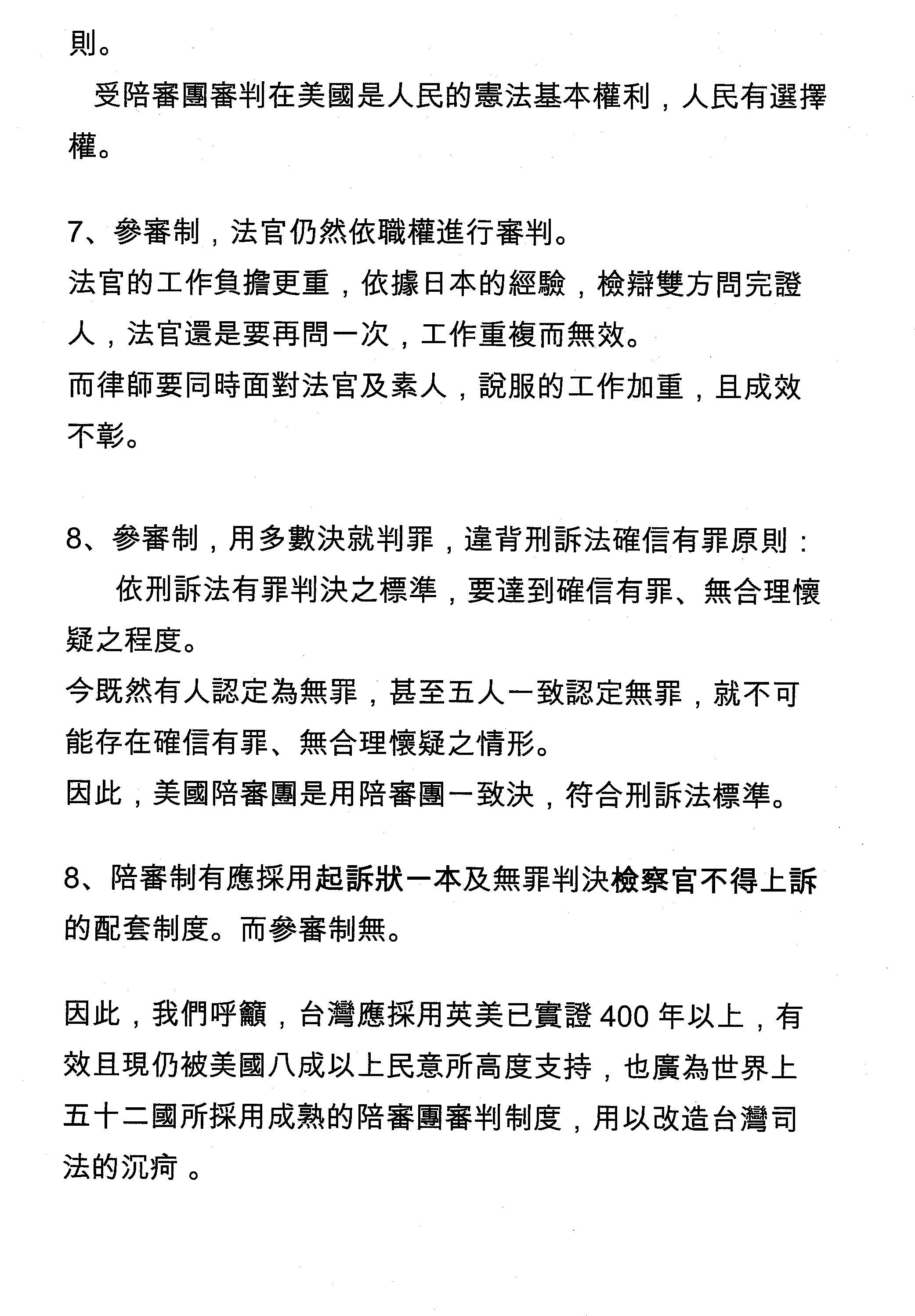 首先,講到陪審判決不附理由,這要看講的是什麼理由。如果是一本厚厚的公文書狀的判決書,確實沒有,這點我承認。但是美國陪審制有非常嚴密的兩項條件,其中一個叫Jury Form或Verdict Form,也就是判決用格式表,其厚度是依照罪刑本身所涉及的構成要件,拆解成個別人民所可以了解的事實後,作為審議依據。所以每個人都要填寫認定的理由、結論有無,最後附上簽名。再由陪審團主席統一收取後,綜合結果,報告給法院知道,並於庭上公布。因此,有關判決不附理由這點,我想各位有點誤會了,當然,這不是我講的,只要去美國聯邦法院系統統統找得到。