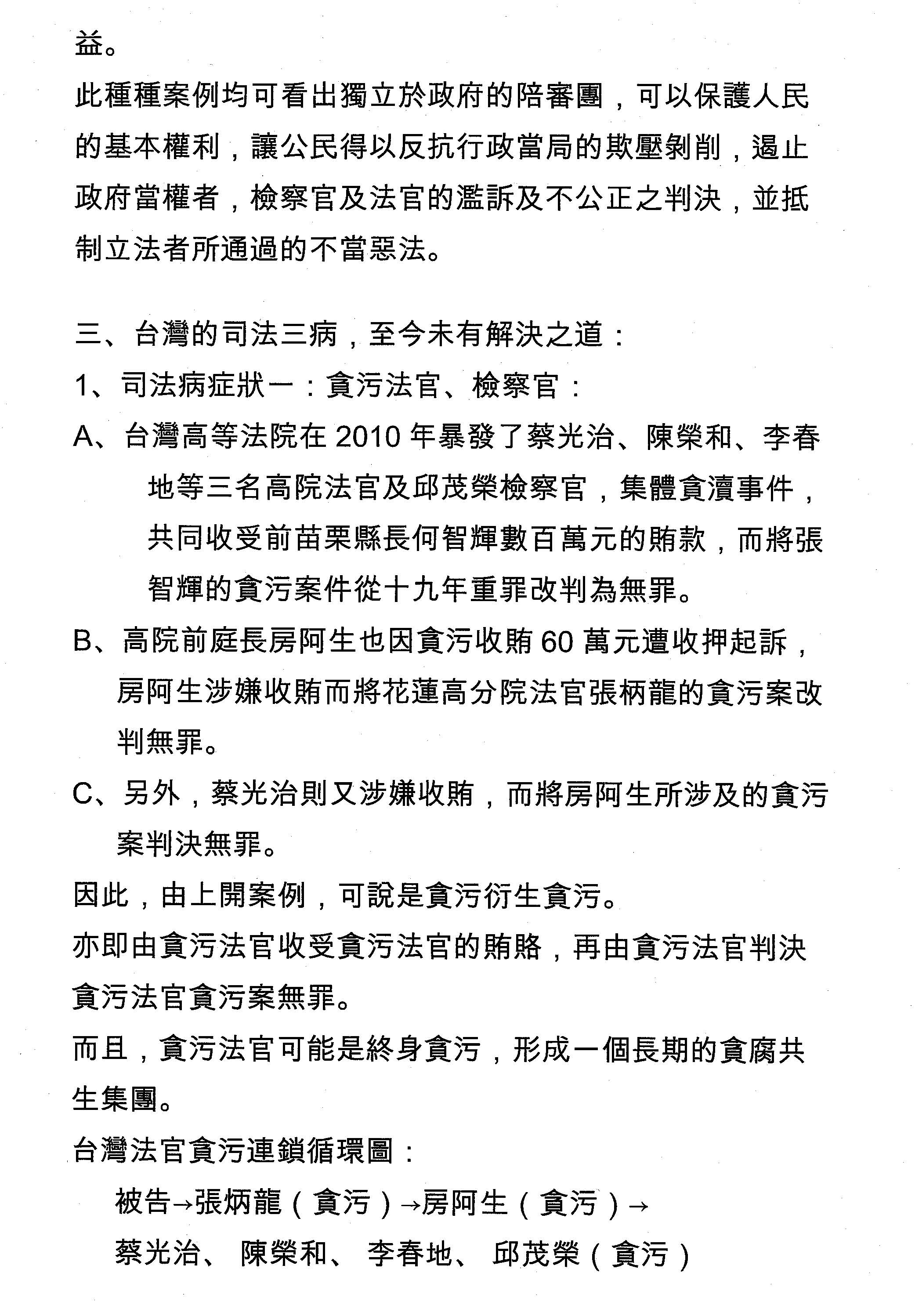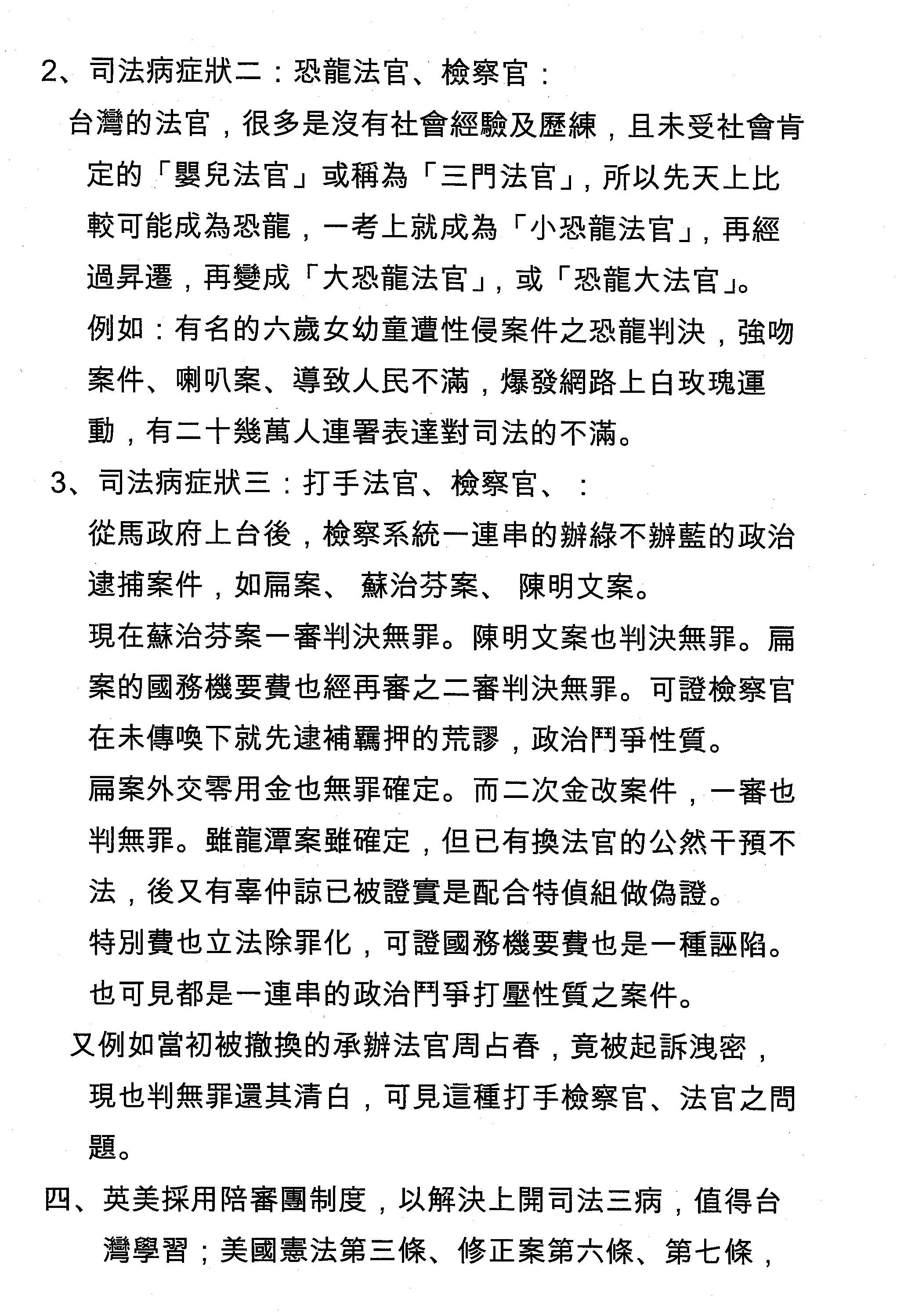 我們今天為什麼在這邊討論陪審或是參審?我跟大家報告,參審是一個假的人民審判制度,我認為現在有司法四病沒有解決;第一個是法官有一些少數的貪瀆案子,這在我今天的書面報告裡有講,在此不細數了;第二個是很多人批評台灣的法官比較沒有經驗,跟社會脫節,這也是事實,雖然他再認真,但經驗值就是不夠,叫小孩子去開大車,他就是沒辦法;第三個是早期在黨國體制之下,很多法官、檢察官不論是有意的被干涉或是揣摩上意,會依據當權者的意思去做審判;第四個是輿論審判,我們在審判的時候,輿論常常會影響到法官,但這個事實在參審制度完全不會被處理。