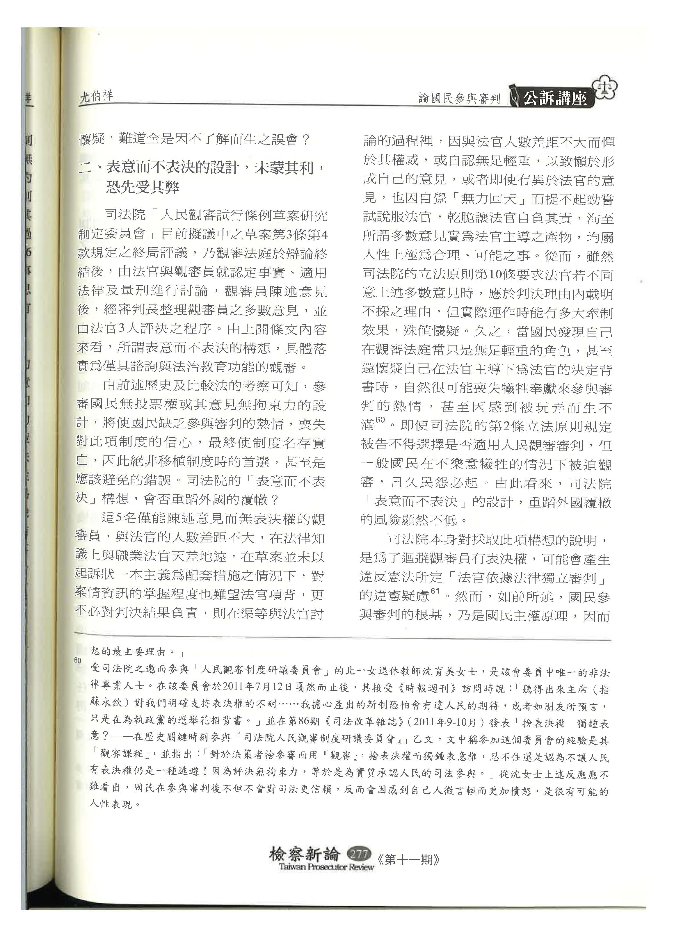 尤伯祥律師:主席、各位委員。我先針對今天提綱的第二點來講,這可能是我在這邊比較能夠對大院有點貢獻的部分。先講一下陪審跟參審之間的關係,參審其實是陪審的變型,人民參與審判的原型是陪審制,參審制的出現是在歐陸法系國家仿效英國引進了陪審制之後,在100多年的演變過程中自己逐漸把它改成參審制,這中間的演變流程,在我今天提供給大院的書面資料裡面有比較詳細的說明,我在這個地方跳過。為了要回答今天我所要針對的這個到底有沒有違憲的爭議,我必須先從人民為什麼要參與審判這點開始講,為什麼人民要參與審判?我必須先指出一點,就是過去我們在國內文獻上所看到對於人民參與審判的理解,基本上都是把它當成一種單純的司法制度或是審判工具來理解,我必須說這樣的理解是錯誤的。為什麼說它是錯誤的呢?因為其實人民參與審判不僅只是一種司法工具而已,它也不是一個審判工具,它更不只是一種增進人民對於司法信賴的工具。這樣子講太狹隘了,其實人民參與審判,它的性質首先是一種政治制度,之所以說它是一種政治制度,最主要的原因是,在國民主權原理底下,所有的國家權力都是來自於國人的付託,必須具有民主正當性,因此這個行使在國民的監督之下才能夠正當,這是我們對於國民主權原理及民主原則的最基本理解。在這個理解底下,我們可以看到,在大院這邊是人民選出來的,除了人民選出來之外,另外在現代的民主國家裡面也有直接民主的行使方式。在行政權方面,除了行政權,不管是總統或是內閣制的內閣總理,他具有直接選舉選出的正當性之外,另外在現代的民主國家裡面也有很多人民直接參與行政權的行使方式,包括公聽、陳述意見、聽證等等。