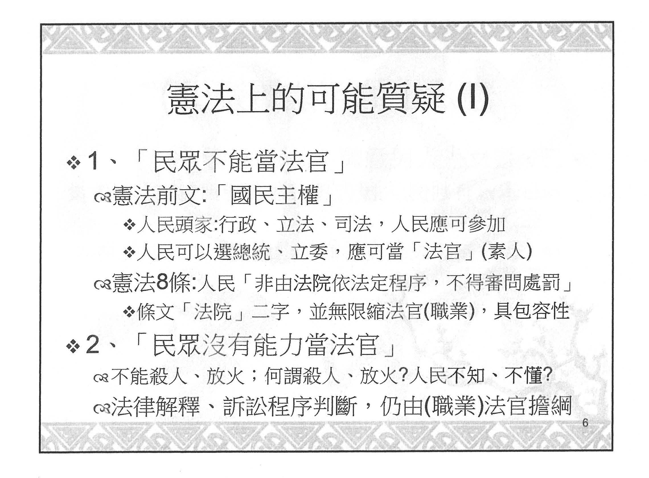 憲法第八十一條講法官為終身職,非受刑事或懲戒處分,或禁治產之宣告,不得免職。非依法律,不得停職、轉任或減俸的規定。這很明顯是就職業法官所設,為什麼制憲者會在第八十一條特別針對職業法官做這樣的規定?道理也很簡單,因為在制憲當時就只有職業法官,並沒有人民參與審查的制度,所以制憲者不需要特別去就人民參與審判加以規定。如果前面所屬,那是一個憲法委託,委諸於立法者來形成。事實上,制憲者的權力也是來自於全體國民,他的權力來自於全體國民的話,怎麼可能回過頭去剝奪掉人民在日後將來參與審判或是其他國家權力行使的過程?這是不可能做到的事情,代理人不可能去剝奪掉本人的權力,這是一個最基本的法理。所以,我想這兩條規定都不足以導出我們的制憲者在立憲的時候已經剝奪掉人民參與審判機會的這種結論,所以違憲爭議在我看來是一個假的議題。其實在國外,不論是日本或是韓國,過去曾經有的違憲爭議,其實現在都已經沒有了,日本和韓國目前都認為人民參與審判是合憲的,而日本用的是參審制,韓國用的是陪審制。所以,不管是哪一種制度,其實都不會有違憲的疑慮才對。