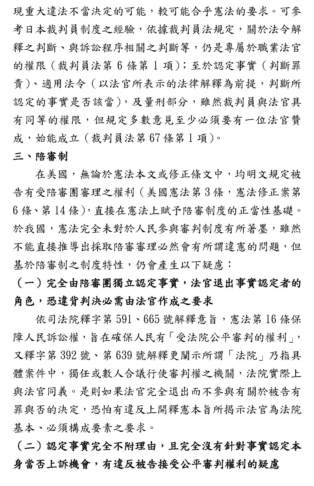 另外,採用陪審團制也有違憲的疑慮,因為憲法的基本精神是,司法機關對於事實的認定與法律的解釋、適用是最後終審機關,專業的法院、法官做裁判,對事實的認定、對法令的解釋是終審機關,參審制是由國民協助,所以不會違憲,如果採取陪審團制度,把專業法官的事實認定權責剝奪了,改由陪審團處理,這跟憲法規定專業法官才能進行事實認定的精神不符,有違憲之虞,採取參審制才不會有違憲的疑慮,因為他們是跟專業法官一起做決定。