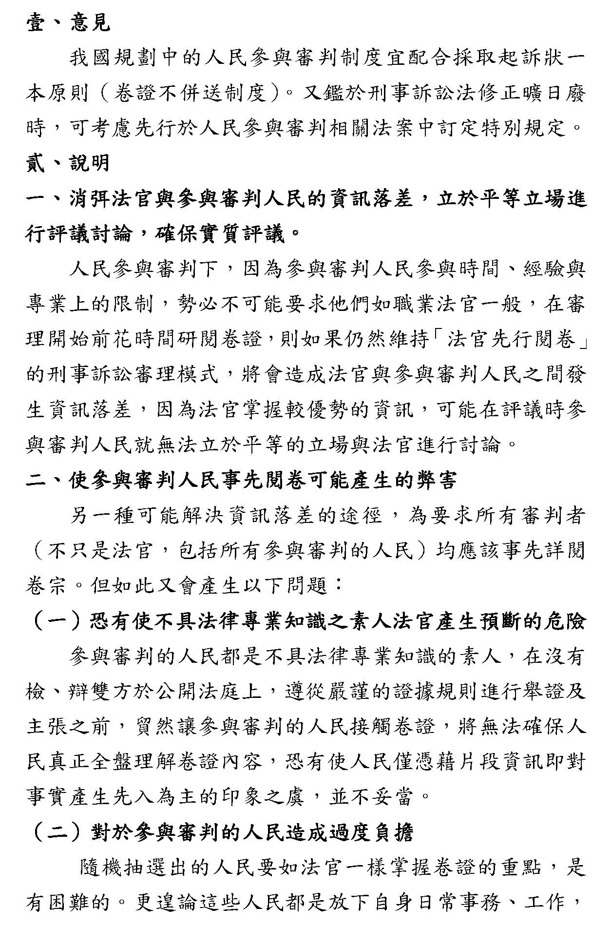 第三,從司法院和法務部的書面來看,很好笑的是,你們對於起訴狀一本的看法是不太一樣的。司法院認為人民參與審判一定要搭配起訴狀一本;而法務部卻認為不需要,享有閱卷權才是恰當的觀點,這兩者之間究竟有無矛盾?我不希望未來要採行這個制度時,起訴狀一本成為人民參與審判無法落實的最後一個絆腳石,我不希望變成這個樣子!我們非常質疑的是,大家吵了那麼多的制度,最後是否會因為要不要採行起訴狀一本,而導致臺灣人民參與審判又繼續拖下去?