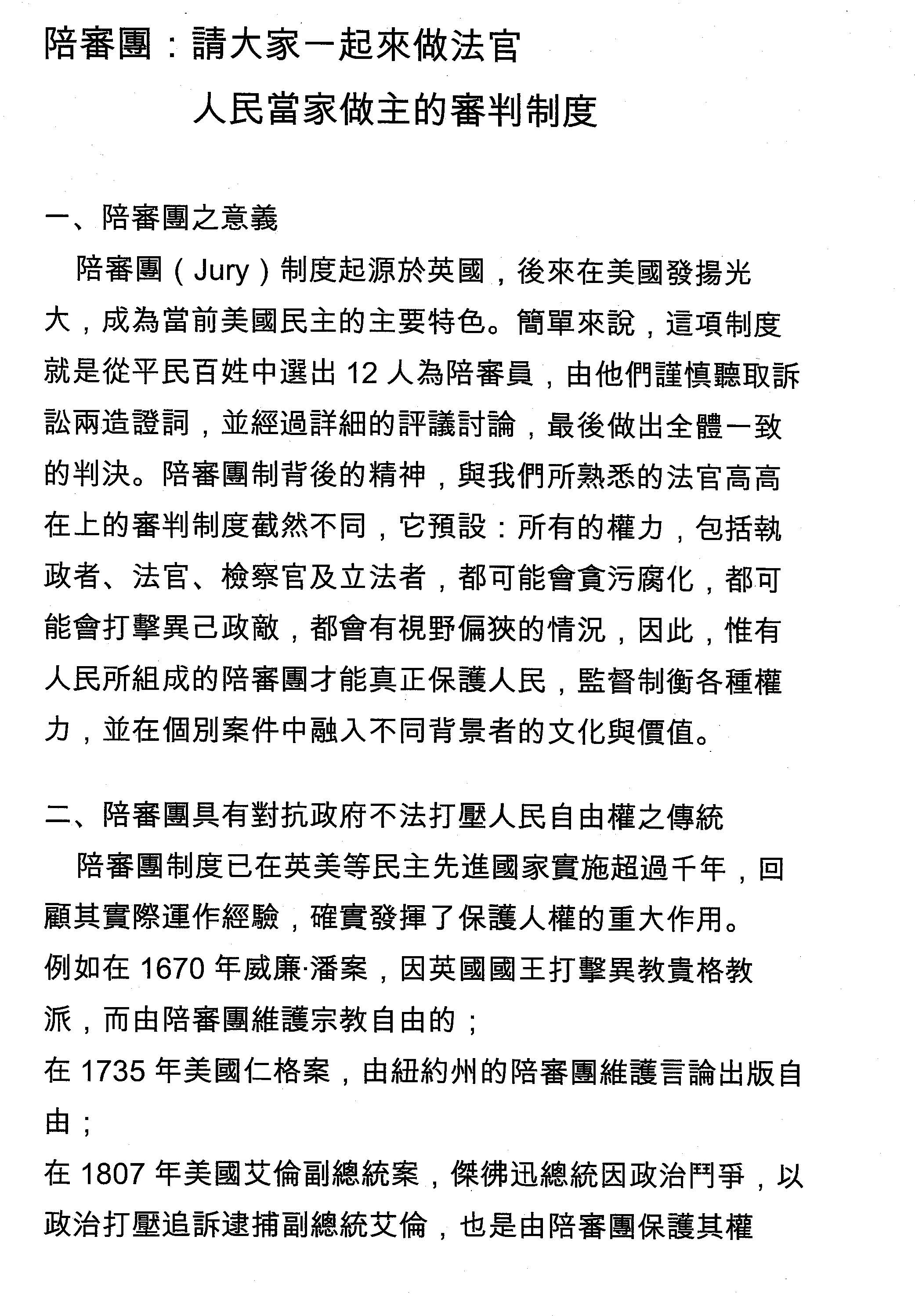 另外,我在今天的書面報告裡面舉了幾個案子,1670年威廉潘案、1735年仁格案、1807年艾倫副總統案,這幾個案子都是為什麼像在美國憲法修正案第三條及憲法第三條、第六條、第七條堅決用陪審團制度,因為美國在殖民地的時代,他們就發現英國國王常常藉由立法為惡,但後面就是靠用陪審團保護,像1735年就是這個總督要藉由換法官的方式來修理仁格,他是一個報社的老闆,但是後面因為人民覺得這就是言論自由,所以即使那個總督去換了兩個法官來控制這個審判,陪審團還是堅決抵抗這種藉由政治力控制法官要來打擊人民言論自由的審判,判他無罪,這個判決在美國是一個最轟動的案子,也導致1776年獨立革命戰爭。這些案例都是美國堅決要用陪審團的一個原因,這也是台灣現在制度可以用的,像我辦阿扁的案子也是換法官,到最後就是有辦法透過職業法官控制,藉由改變法律見解來判人家罪,所以為什麼陪審團可以真正保護人民,就是因為陪審團是由市民而來,他們有良心、有多元的經驗,不會被藉由政治力來控制法官達成打擊異己的弓刃,所以我們還是堅決主張要用陪審團,謝謝大家。