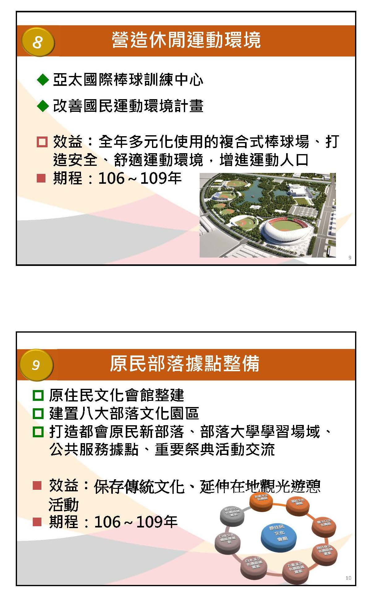 至於文化生活圈的建設部分,花蓮的智慧科技文化館為多功能、多目標使用的智慧場館,國民黨政府時有給予支持,但等到新政府時,這個計畫就石沈大海。我們希望不管是花東計畫、基金計畫或前瞻計畫都應該讓它復活一下,以使基層人民有一點微薄的感覺。
