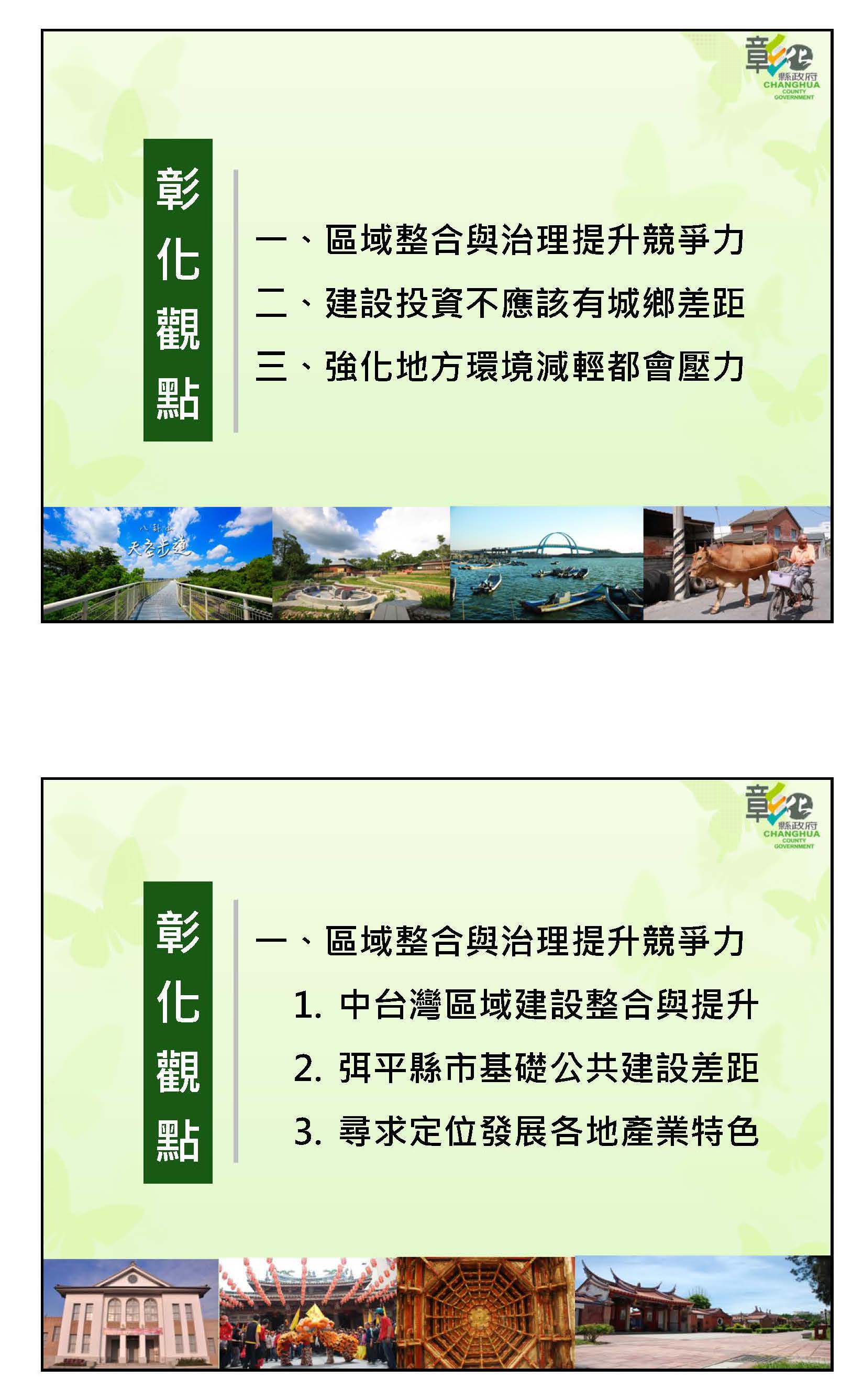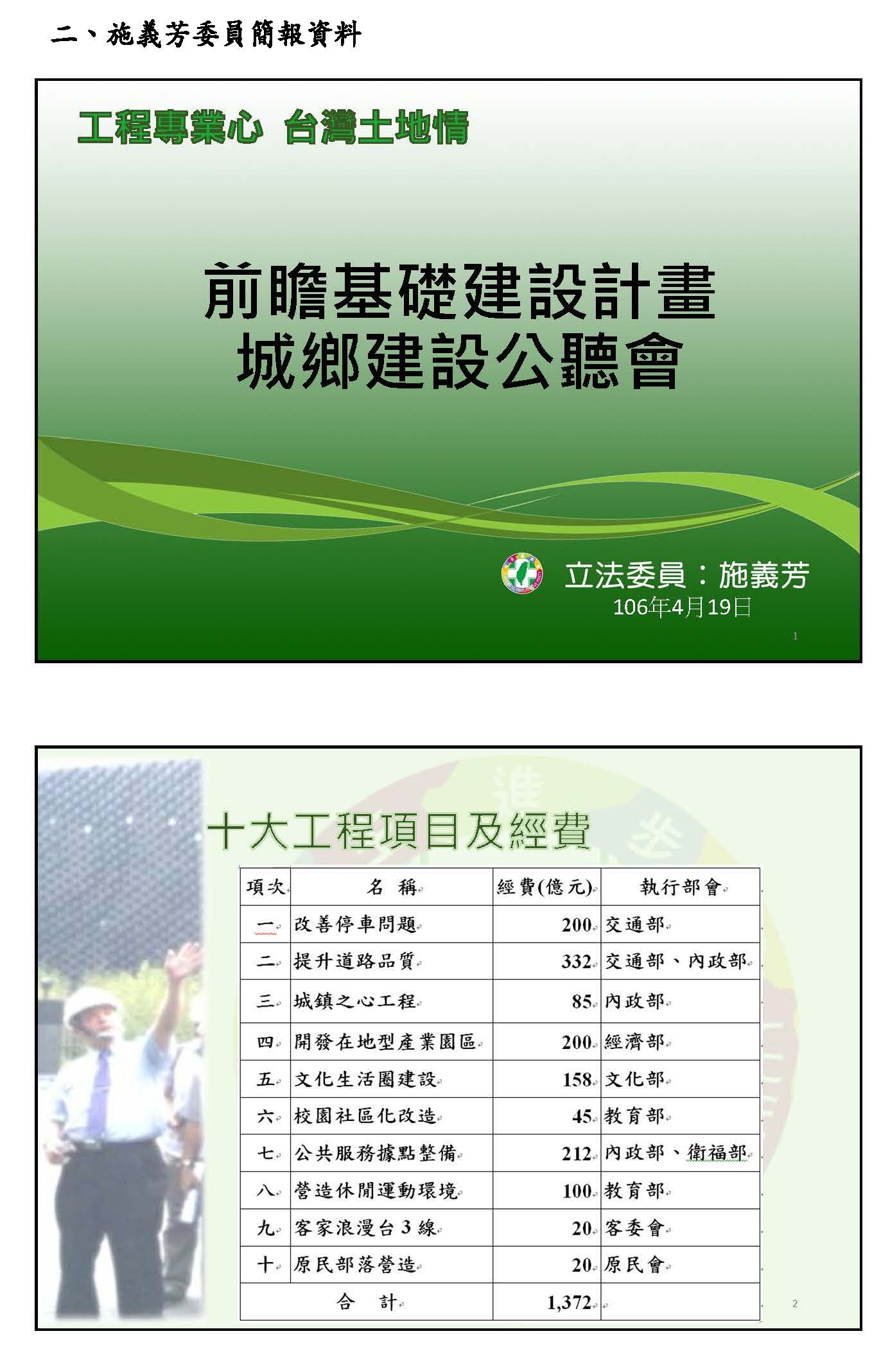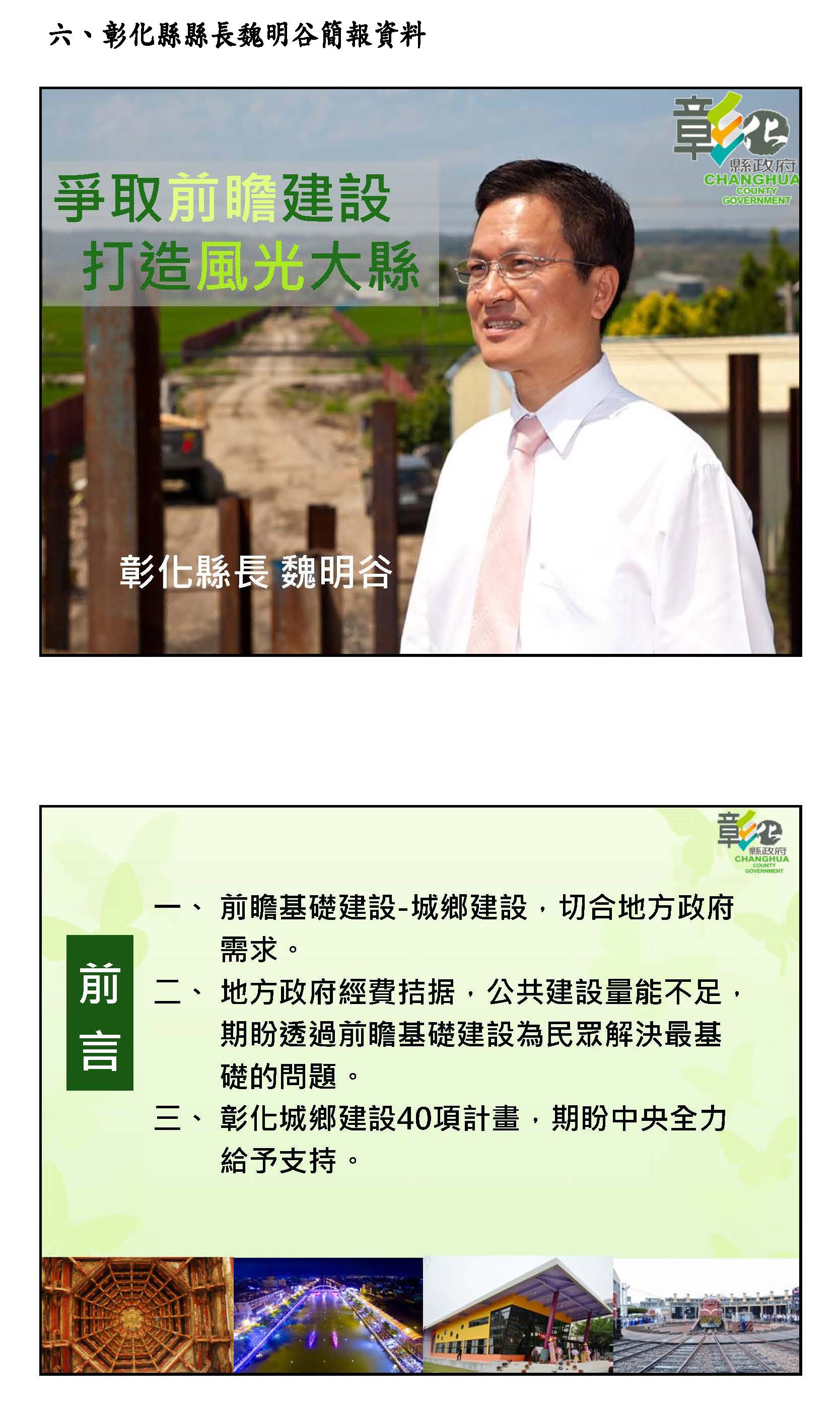 第二部分是希望在過程中,能夠有完整計畫。在縣市政府部分,譬如10項建設,如果提出的計畫能夠同時整合二、三項或三、四項建設,讓它落到同一地區,讓建設效果在短期間內可以呈現,我相信它就更能夠得到支持,也更能夠發揮建設效果。