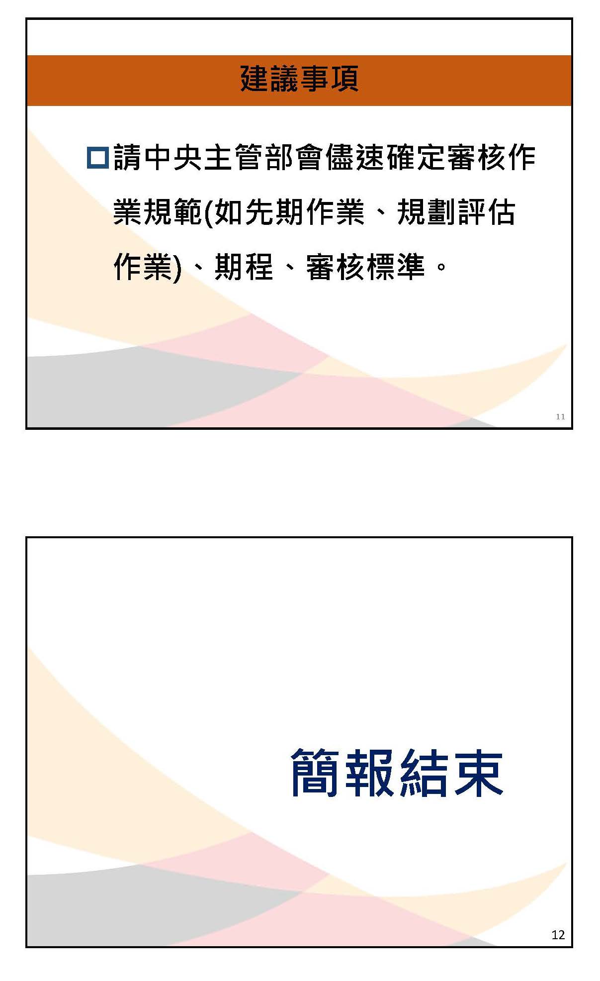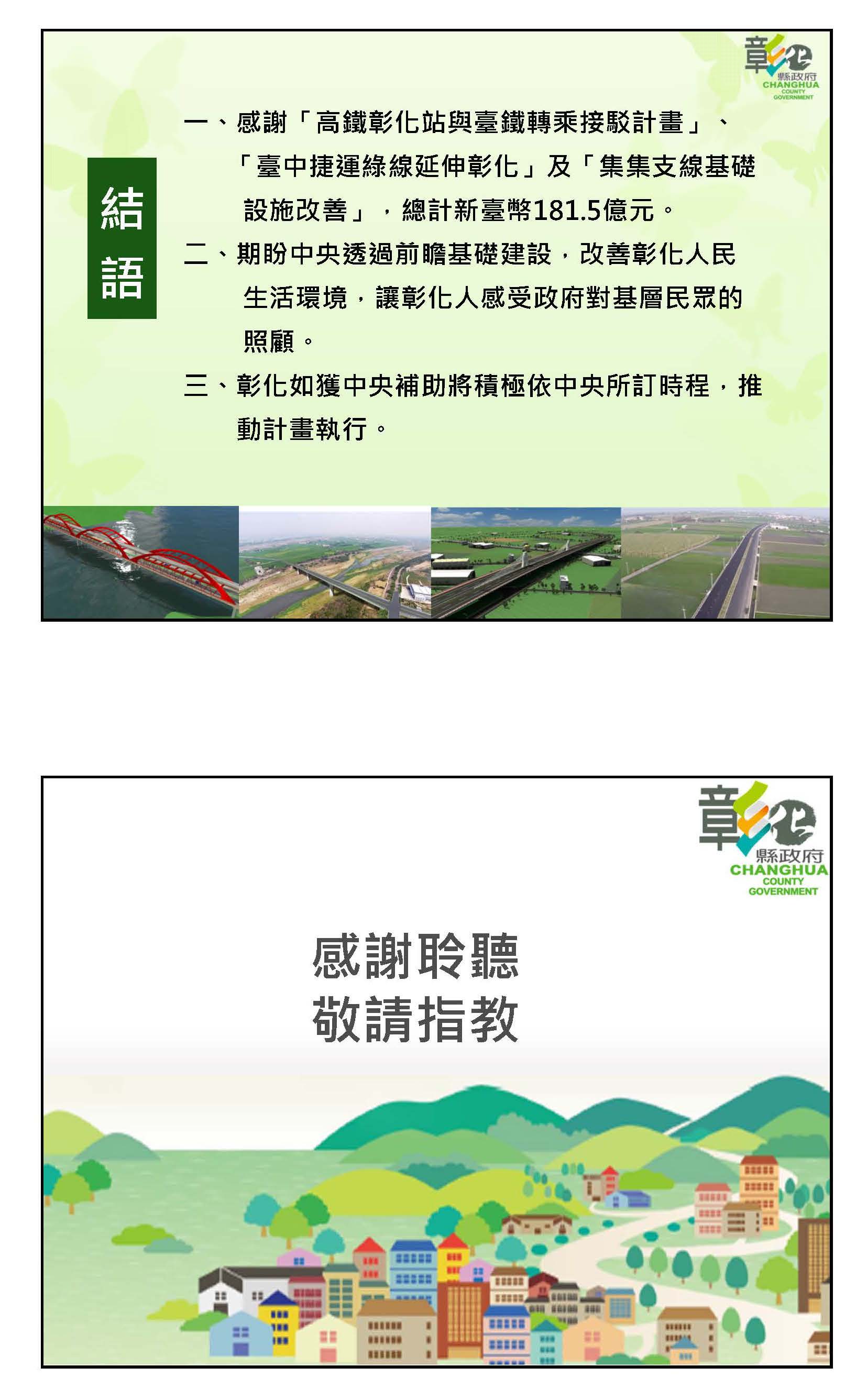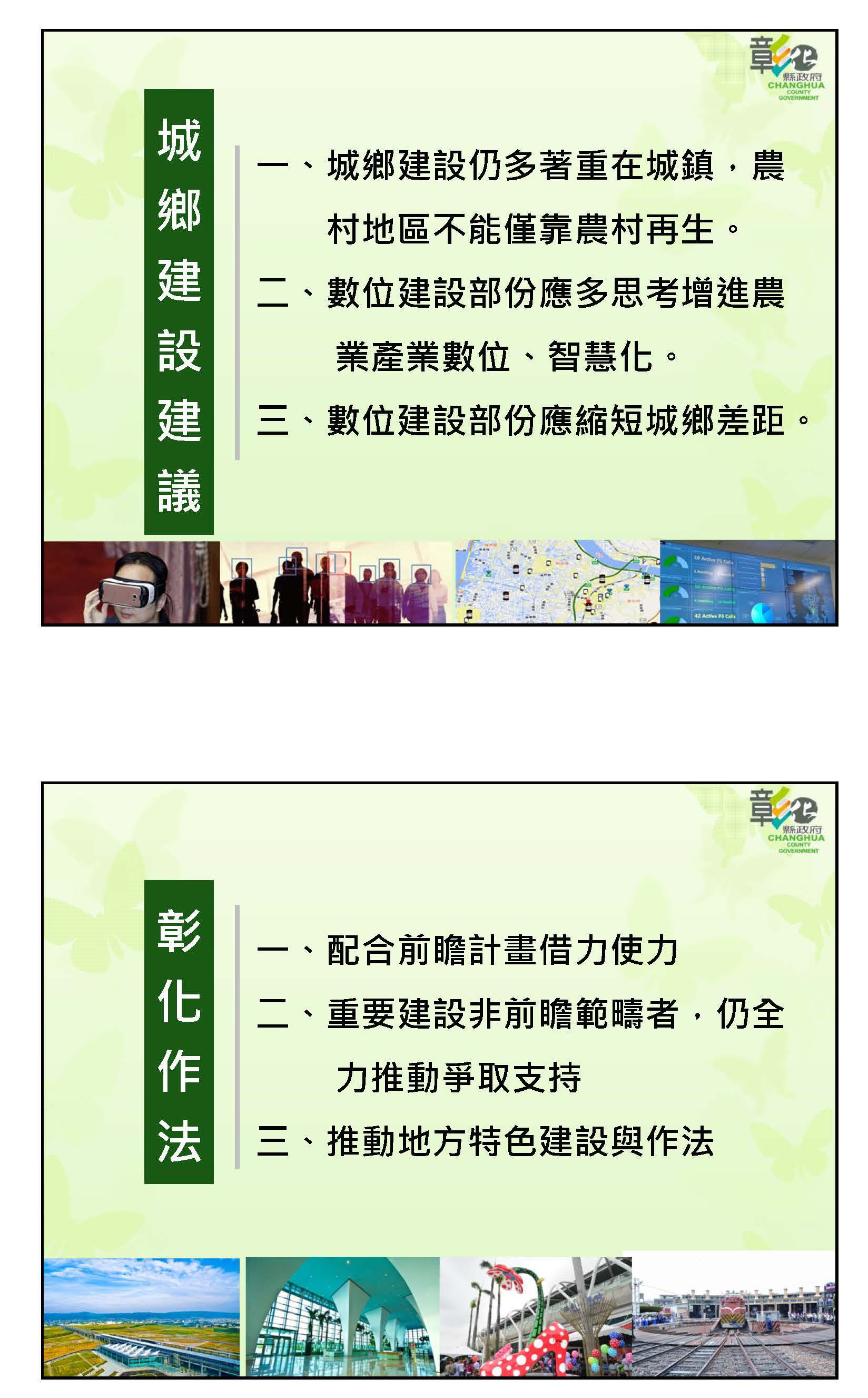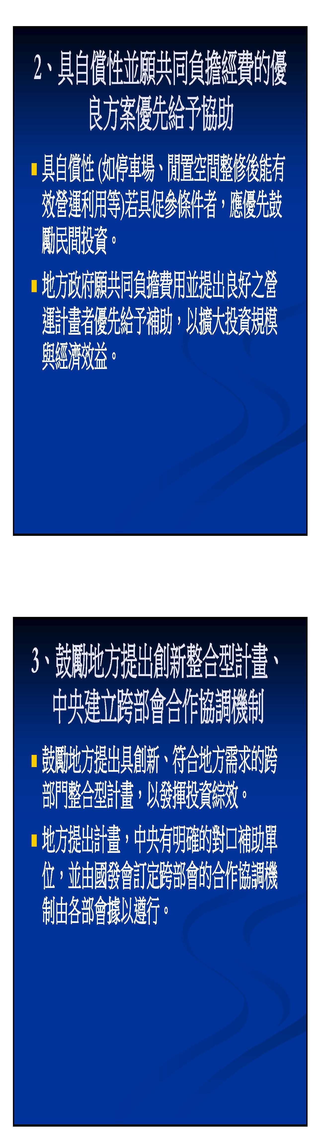 第二部分是希望在過程中,能夠有完整計畫。在縣市政府部分,譬如10項建設,如果提出的計畫能夠同時整合二、三項或三、四項建設,讓它落到同一地區,讓建設效果在短期間內可以呈現,我相信它就更能夠得到支持,也更能夠發揮建設效果。