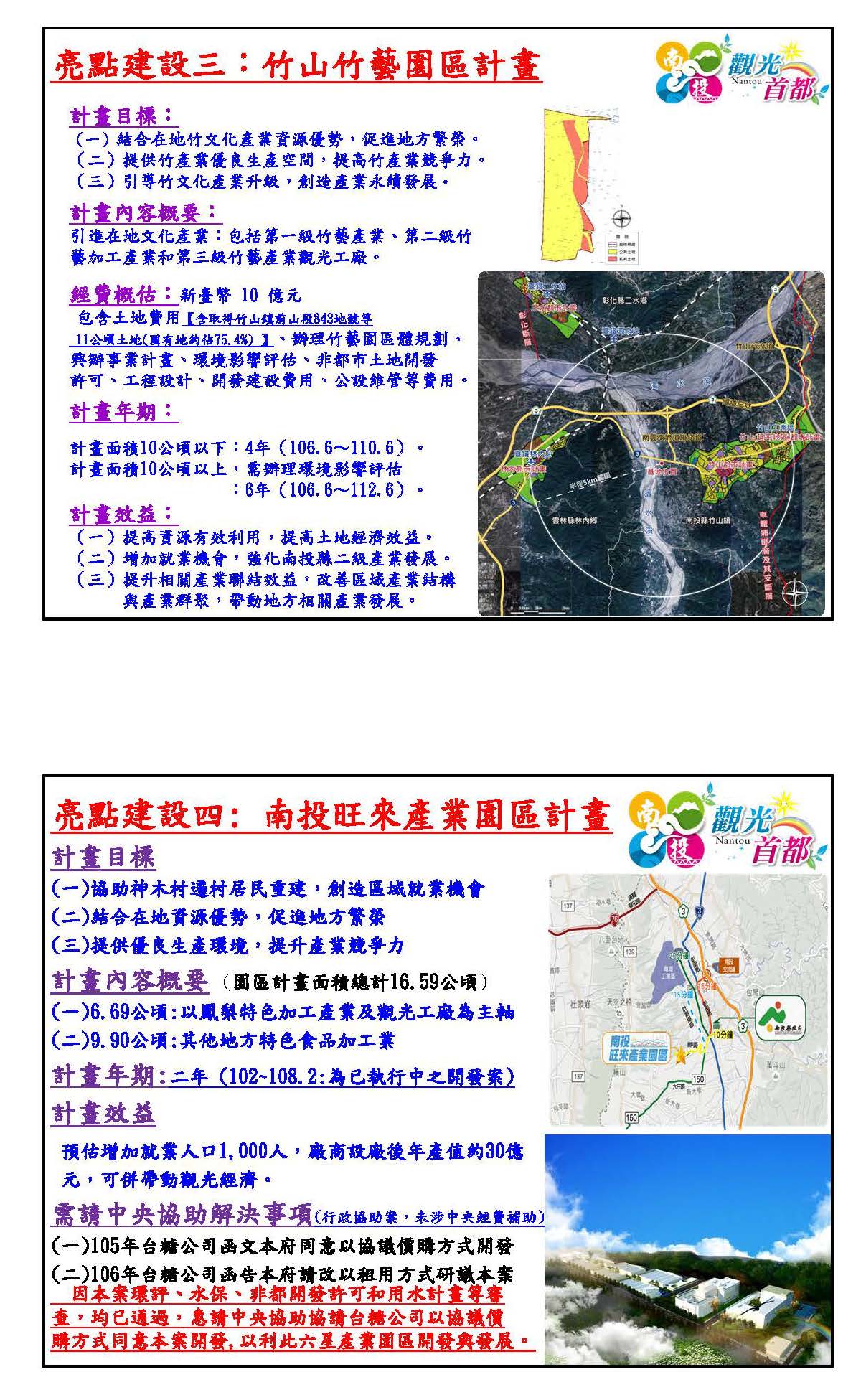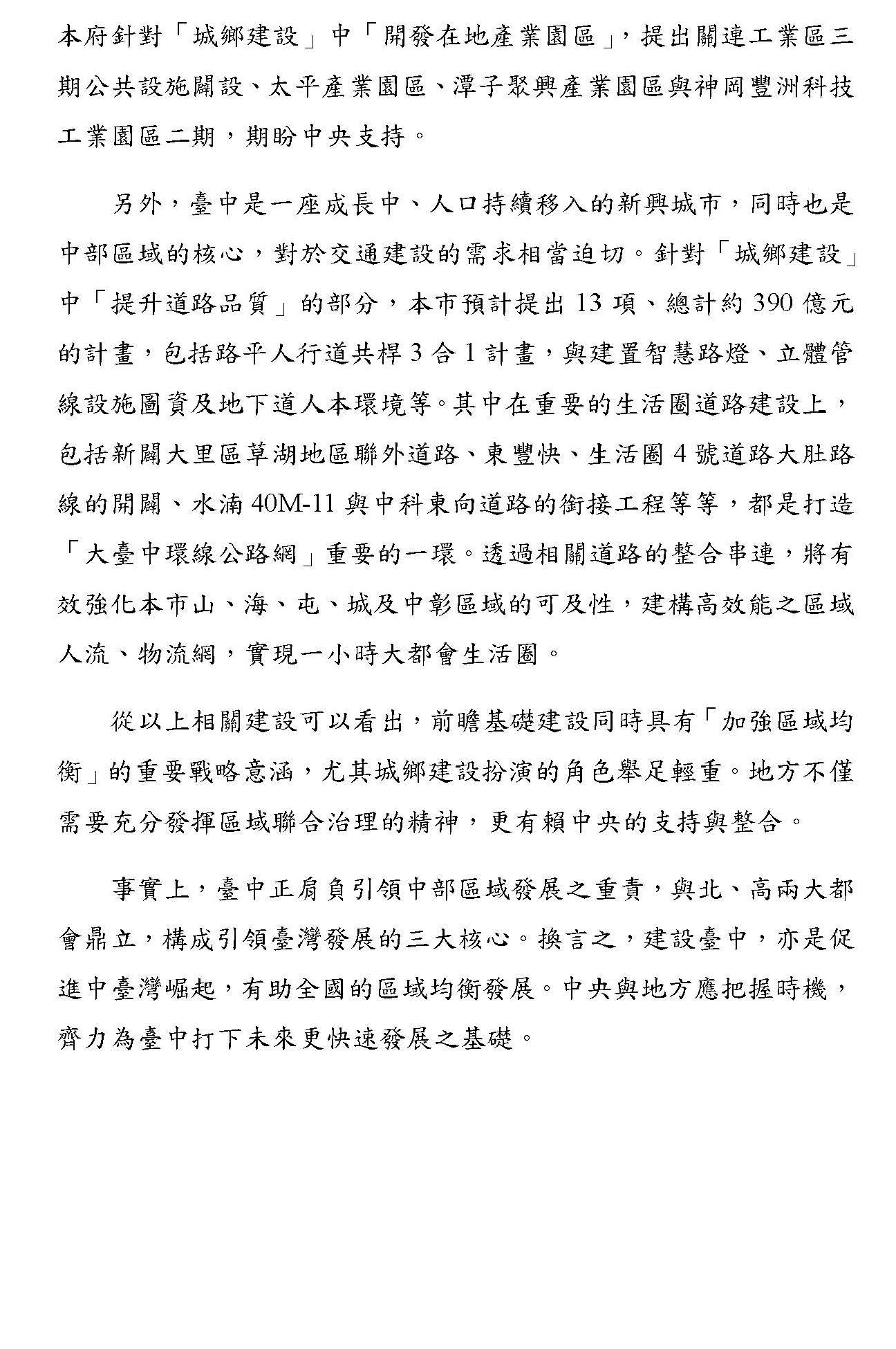 第二個,臺中具有全球數一數二的精密機械產業群聚,剛剛我聽到南投縣長講,那麼多項沒有爭取到半項,我也很辛酸,所以在這裡我要特別提出來,事實上中彰投苗工業區的開發的確是不足的,尤其其中有一些之前開發的工業區,它的區位條件不適合,或是有些地方的污水處理等基礎設施不夠,造成目前的使用率不高,已經形成臺中精密科技產業發展的瓶頸。這一次我們有一個產業園區的計畫,希望可以以區域產業發展的高度,共同來解決這個問題,我也要為南投、彰化多講兩句話,這裡的確不是只有我們的園區不足,我們還有大量的違章工廠,值得透過這個計畫來解決相關的問題。