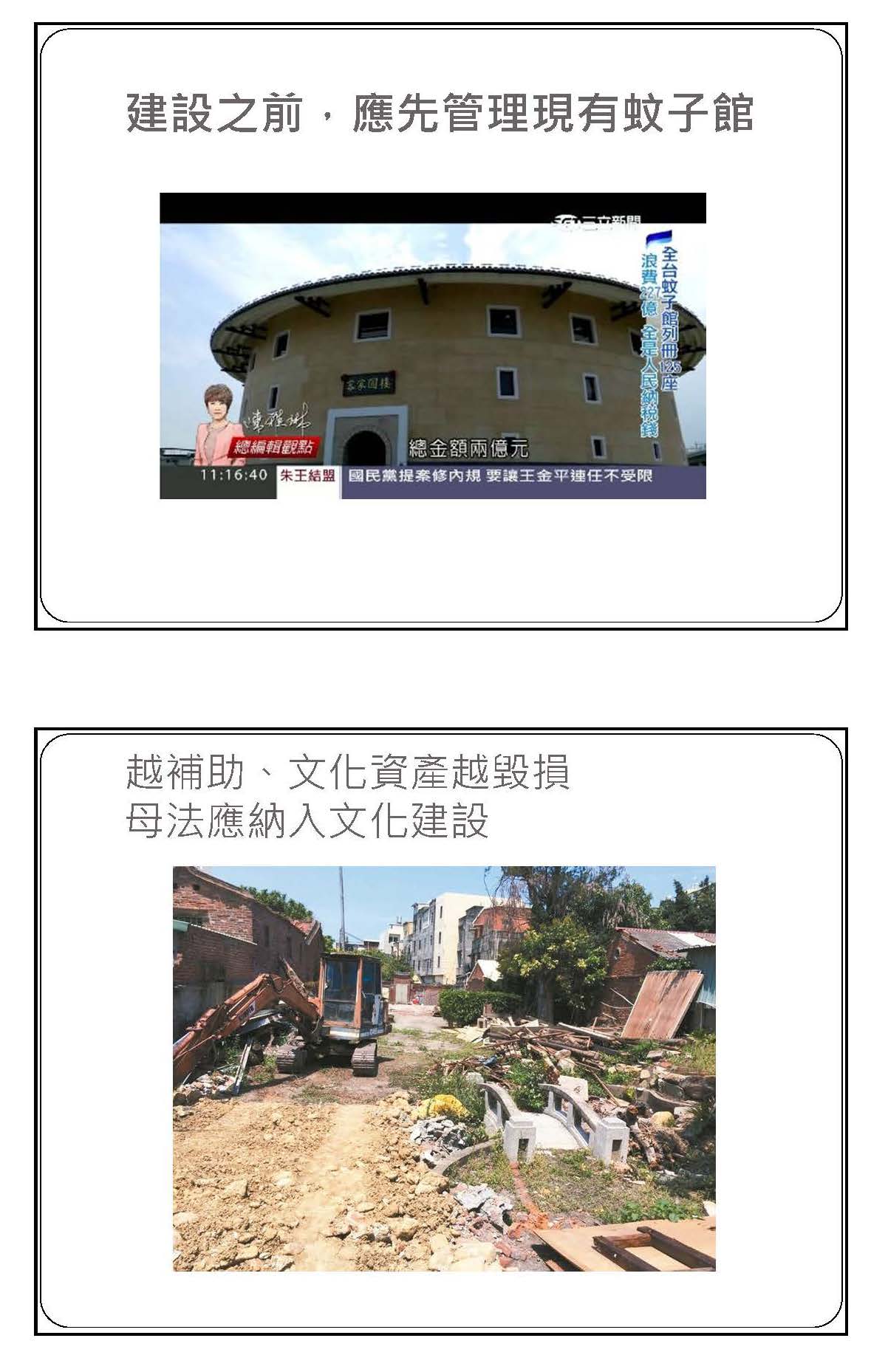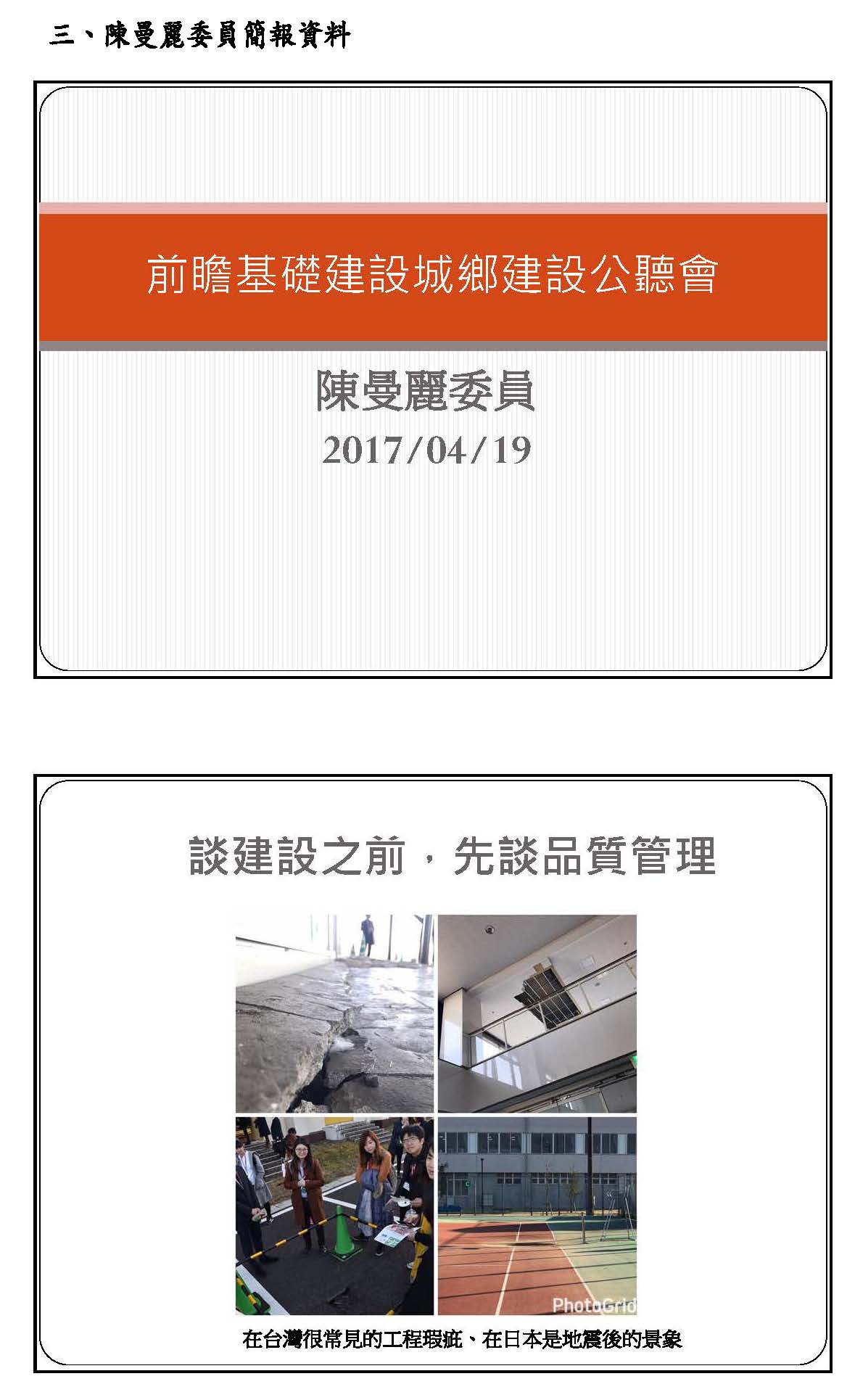 陳委員曼麗:主席、各位學者專家、各位同仁。今天我們在談城鄉建設的部分,在談建設之前,先來看一下建設品質的管理,在此以幾張照片為例,這在臺灣是經常見到的,可是在日本是不常見到的,在日本什麼時候會見到這樣子的畫面?就是工程方面,或是大家會看到好像跟臺灣差不多,主要是因為在地震之後就有一些破壞,但當然日本很快地再把它恢復原狀。我們在做建設之前,除了要談品質管理之外,也應該談閒置空間,就是蚊子館,各地都有很多蚊子館,是不是公部門在做前瞻建設的時候也可以盤查一下蚊子館,以及看要如何活化?因為每一次建設都花很多錢,可是後面如果沒有一些作為的話,我們的蚊子館就會愈蓋愈多,所以對於蚊子館的部分是不是可以先做一個盤查?也不要一直說要繼續蓋,到時候大家就會覺得很頭痛了。民間也看到,補助愈多的話,可能文化資產毀損得會愈快,因為大家都想把老屋拆除掉,再做其他利用,但事實上這都是文化,如果我們的國家是沒有文化的,那當然到後來我們也會看到這個國家的歷史就這樣不見了。在前瞻條例裡面,我們是不是也可以把文化建設變成是一個非常重要的角色?所以我希望在前瞻條例裡面可以加入文化建設的部分。