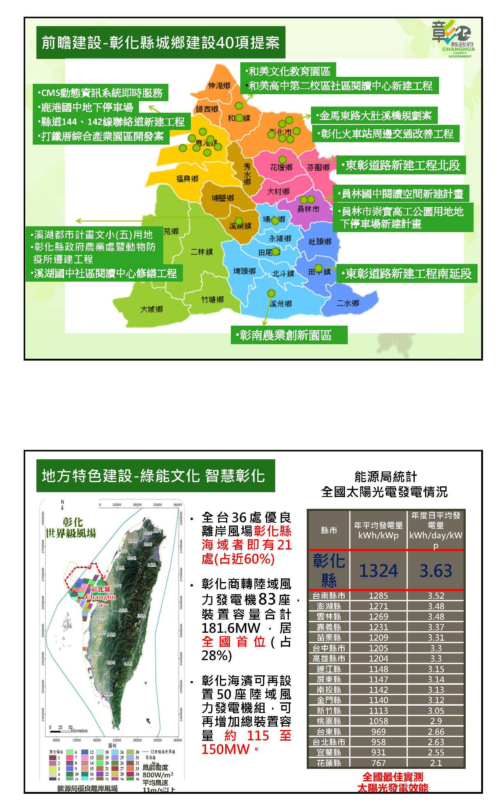 魏縣長明谷:主席、各位委員。關於前瞻基礎建設計畫裡面城鄉建設的十大幸福工程,本席首先要表達彰化縣政府的立場,彰化縣政府一直想打造彰化縣成為「風光」大縣。我可以說,綠能的推動如果沒有彰化縣政府的參與,是無法在2025年達到非核家園的目標。因為彰化縣是全台灣海域最淺的,有2,300平方公里,是彰化縣陸地的2.5倍大,海深不到50公尺。所以在彰化縣建置風力發電機的機組絕對是最便宜的,這是地理的優勢。在氣候的優勢上,彰化縣一年四季都有風,全世界十大優良風場中,彰化縣就占了8個。去年12月和今年1月,我們招到了4個外商和2個本土商,其中丹麥的廠商要投資3,500億元,台電也要投資3,300億元,招商投資簽訂MOU已達到1兆0,120億元的金額,我們也很感謝總統在14日到彰化縣參與招商成果發表記者會。很遺憾的是,在綠能的研發、人才的培訓以及運維基礎建設上,彰化縣提出來的都沒有獲得中央的支持。我們希望中央能加以重視,因為這些廠商和在地的大學簽訂了人才培育的計畫,我們也提出了運維港基礎建設和綠能專區,希望中央政府能重視彰化縣政府的努力以及需求。
