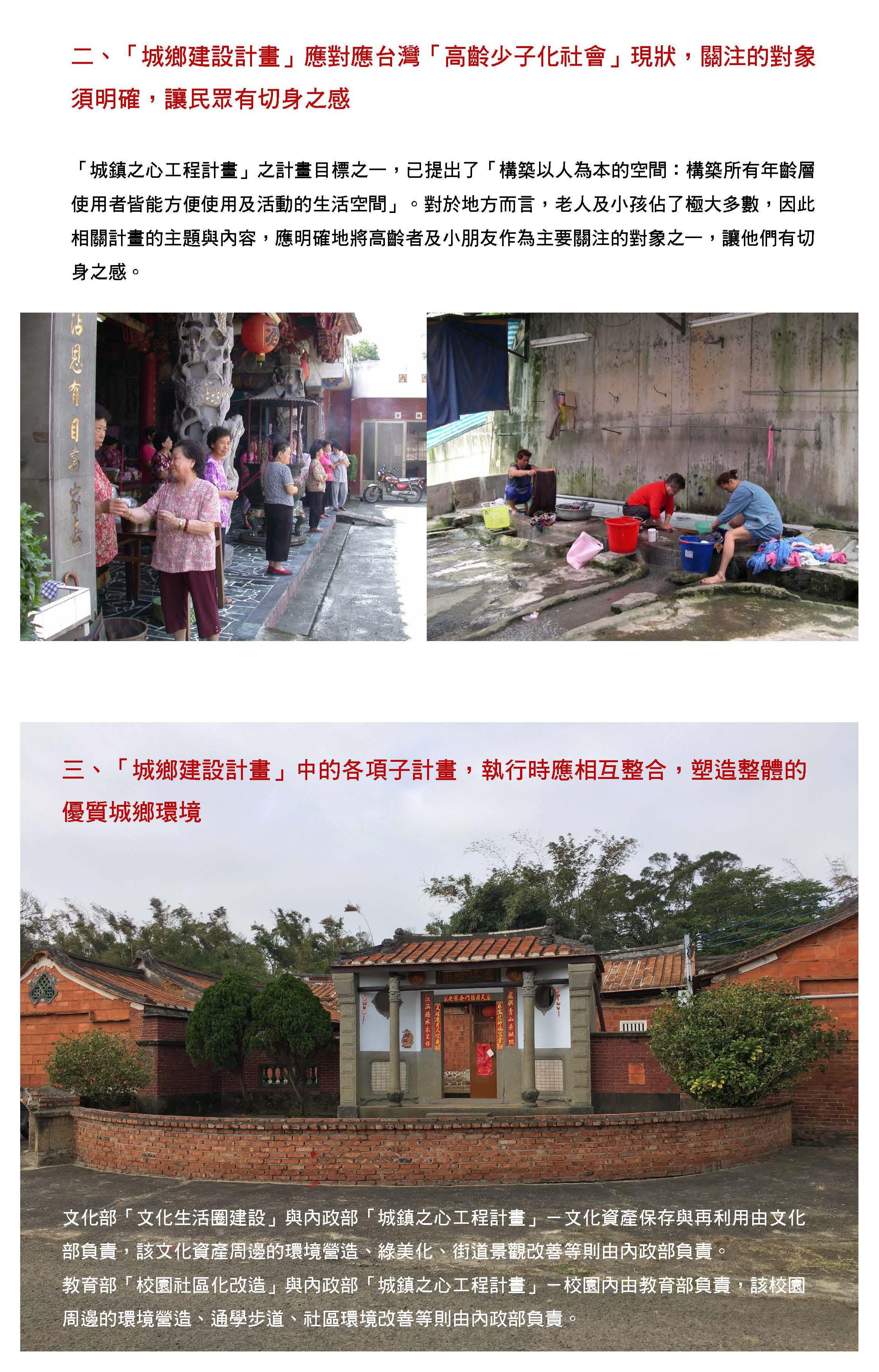 第三,城鄉計畫當中的各項子計畫在整個推動的過程當中應該是相互整合,塑造出一個整體優質的環境。舉例而言,我們曉得文化部有提出文化生活圈建設,是屬於文化資產的保存與再利用,這是文化部長期下來所鼓勵並支持的。我們經常看到一個現象是古蹟修好了,開始再利用了,但是周圍的環境不是很好,所以在文化部文化生活圈的計畫是以文化資產者為主,但是周圍的環境營造、綠美化、街道景觀的改善,就可以透過營建署的「城鎮之心」來加以整合。