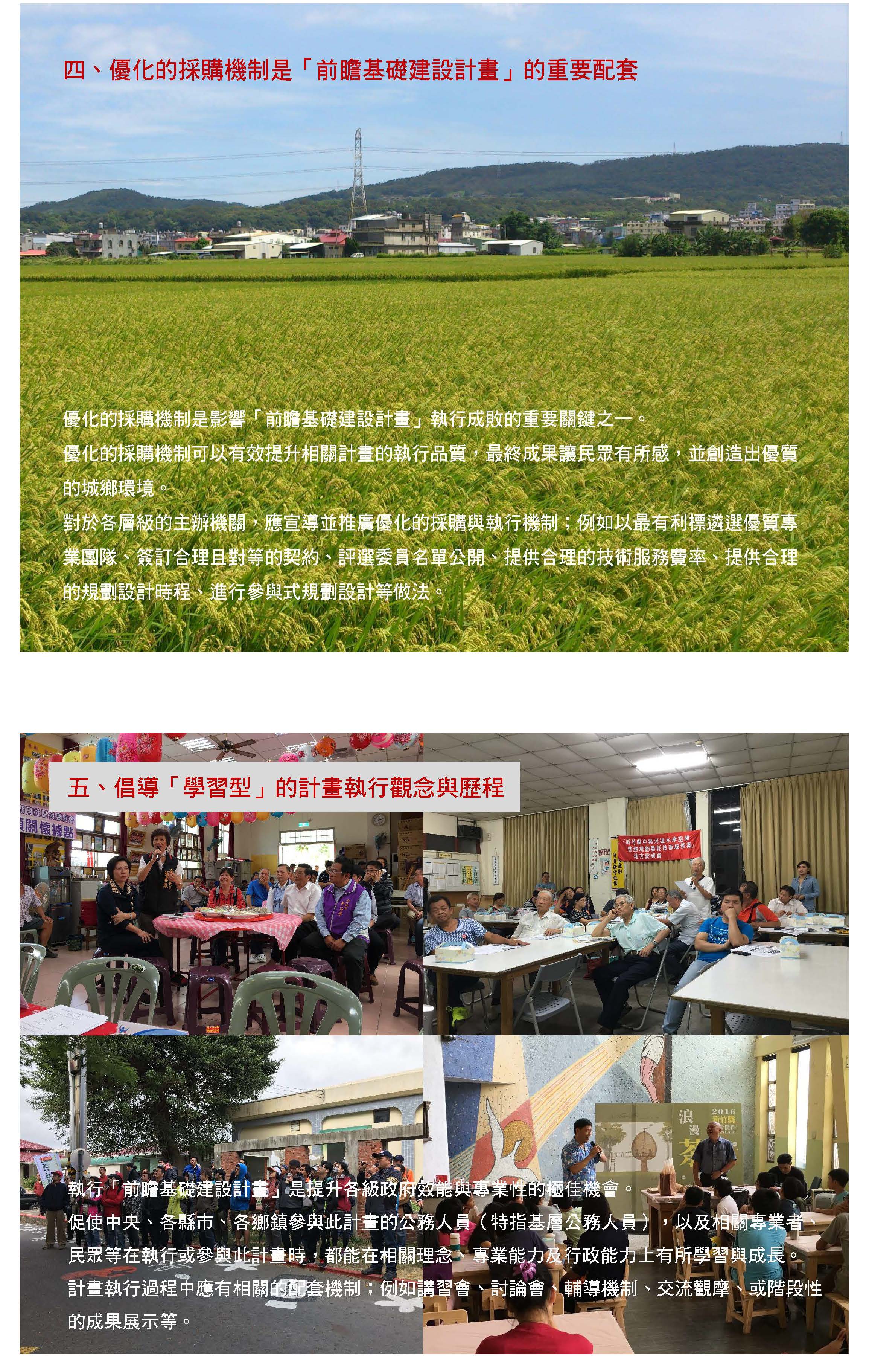 另外一個策略是,希望透由這次的建設,雖然是很平常項目,可是透由好的執行方式,可以建立出一個新的品質,所以我們希望經由這樣的推動,我們有新的道路、新的集會所、新的街景,總總這些都成為是新的標準,也讓台灣能夠建立出一個好的國家未來形象。