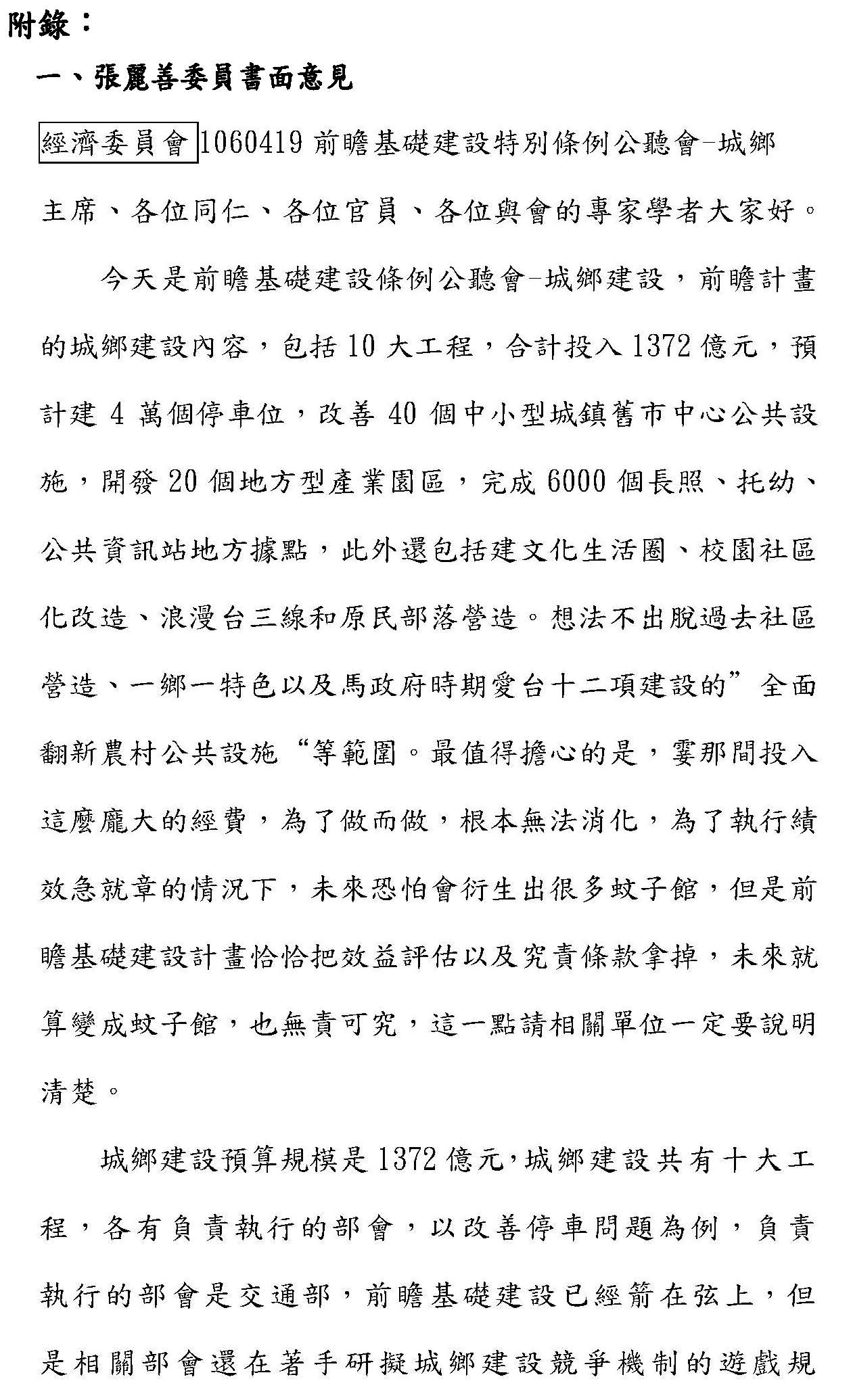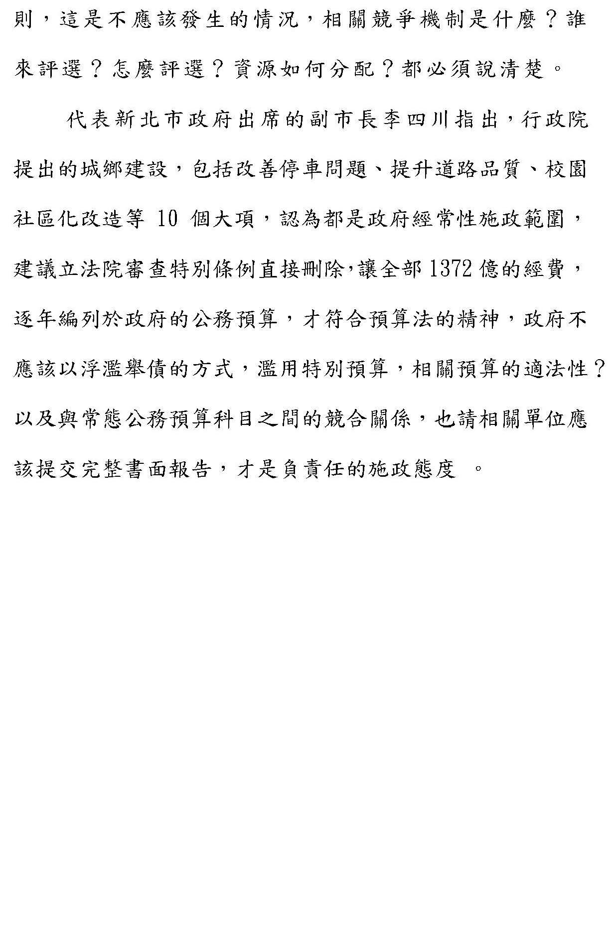 新北市政府朱市長說過,剛才很多首長也提過,說實在地,對於城鄉的平衡,包括城鄉落差要如何平衡發展,這點新北市都不反對,但是從特別條例的精神來看,我不認為這與特別條例編列特別預算的精神是符合的,而且在行政院所提的預算當中,有編列在特別預算的、公務預算的或是其他預算,也就是說,即使地方政府爭取到這筆預算,說實在我們也不知道要在哪個年度編列配合款來做配合,所以我建議大會能夠將特別條例回歸,把1,372億元按照預算法編列在公務預算,讓地方政府能夠依法、依規定來做申請,也可以在每個年度編列預算來做配合,否則把政府經常性執行的工作列為前瞻,都會被外界質疑,甚至部分媒體還把它指為選舉綁樁。因此,我建議將這次特別條例第四條第五項城鄉建設的部分予以刪除,或是把它改以公務預算來編列。
