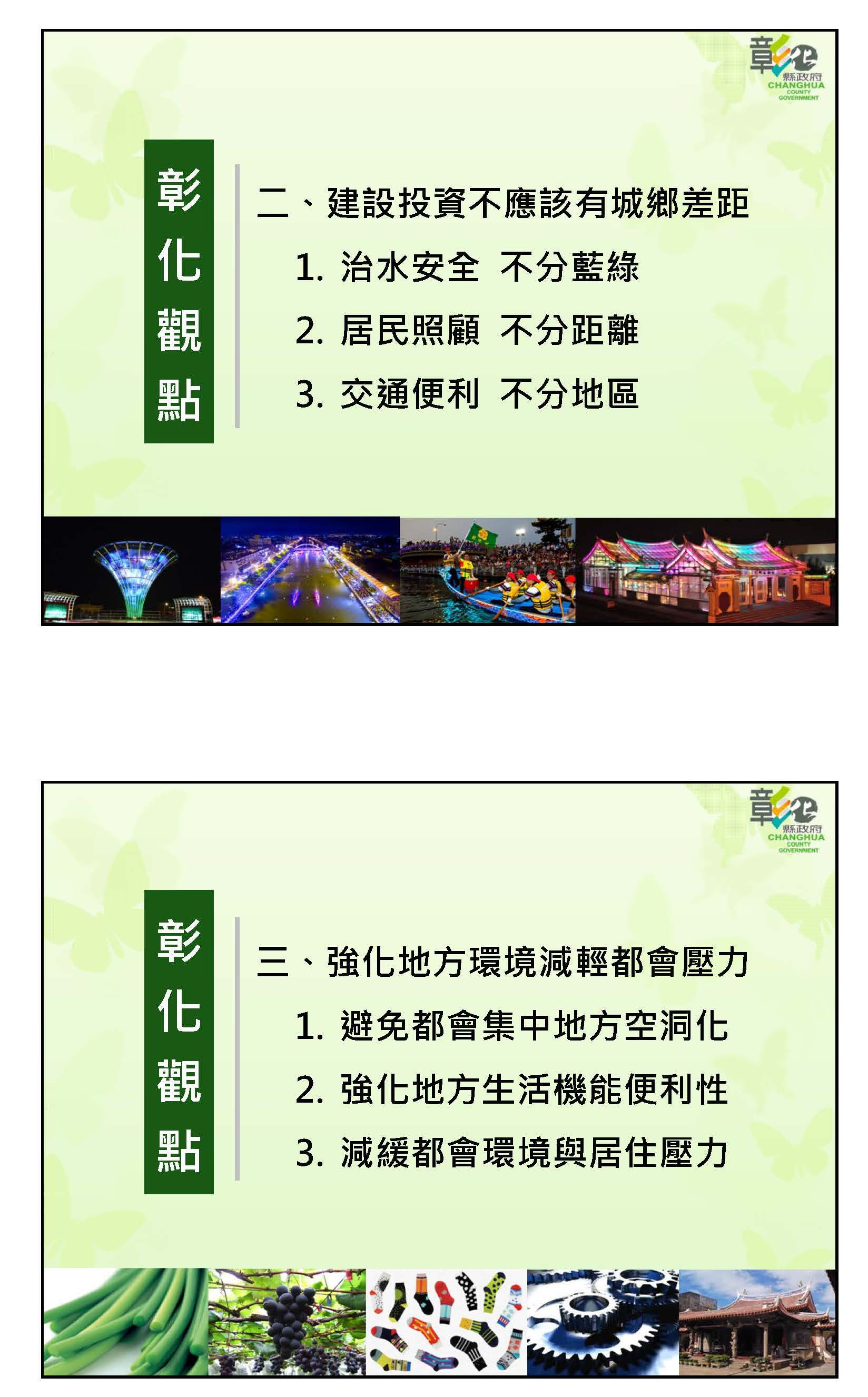 除了要進行城鄉建設之外,我們也要針對制度作全盤思考,目前直轄市、省轄市有1,700萬人口,它是二級制的,而且區是不用選舉的,剩下600萬人口的縣竟然還有鄉鎮市民代表會。以彰化縣為例,我們負擔的人事費用一年就要4億元,因為我們是三級政府,所以我們的行政效率不會比省轄市或直轄市來得快,雖然彰化縣是全台灣最大的縣,擁有130萬人口,除了六都以外,我們排名第七,,但是彰化縣的人均基礎建設卻是全國最低的,因為我們的面積最小,這是我們最吃虧的地方。雖然我們的人口最多,但是我們的土地面積最小,彰化縣只有南投縣的四分之一,但彰化縣是平原比例最高的縣市,在台灣本島中,面積這麼小的縣,但人口卻有這麼多,面對鄉親的需求,加上彰化縣人口老化,就今天所要討論的十大幸福工程而言,在此謹提出一些個人的建議。
