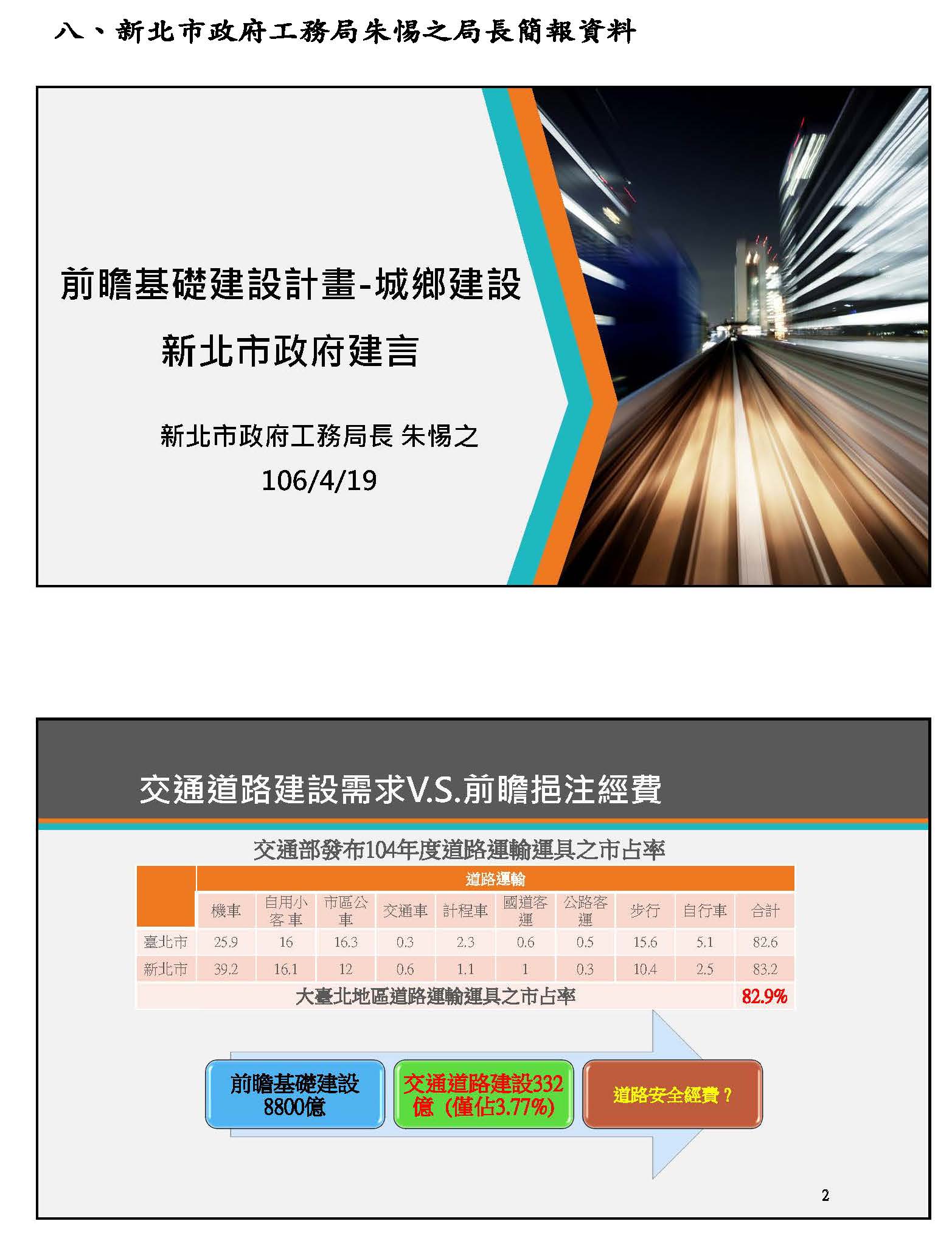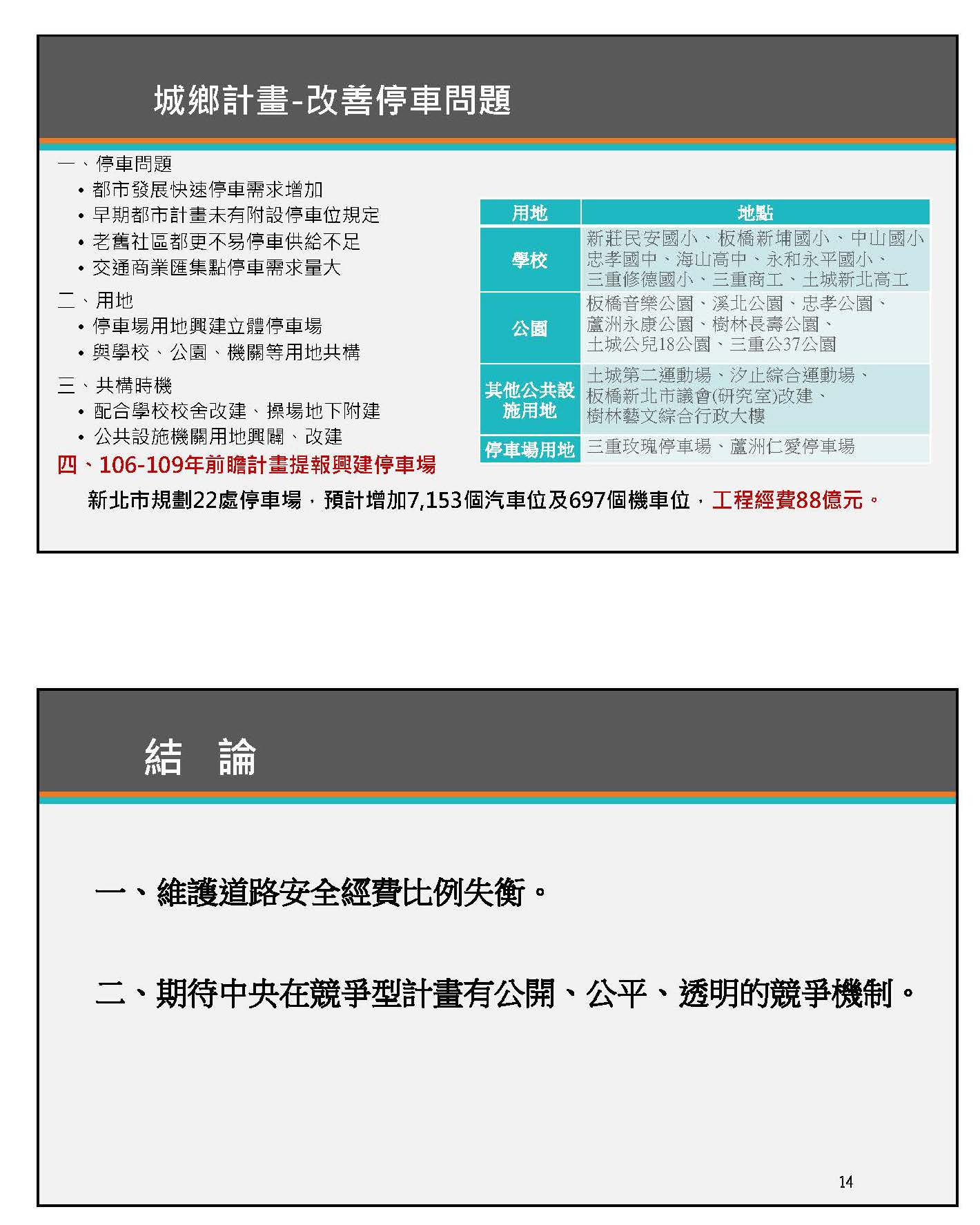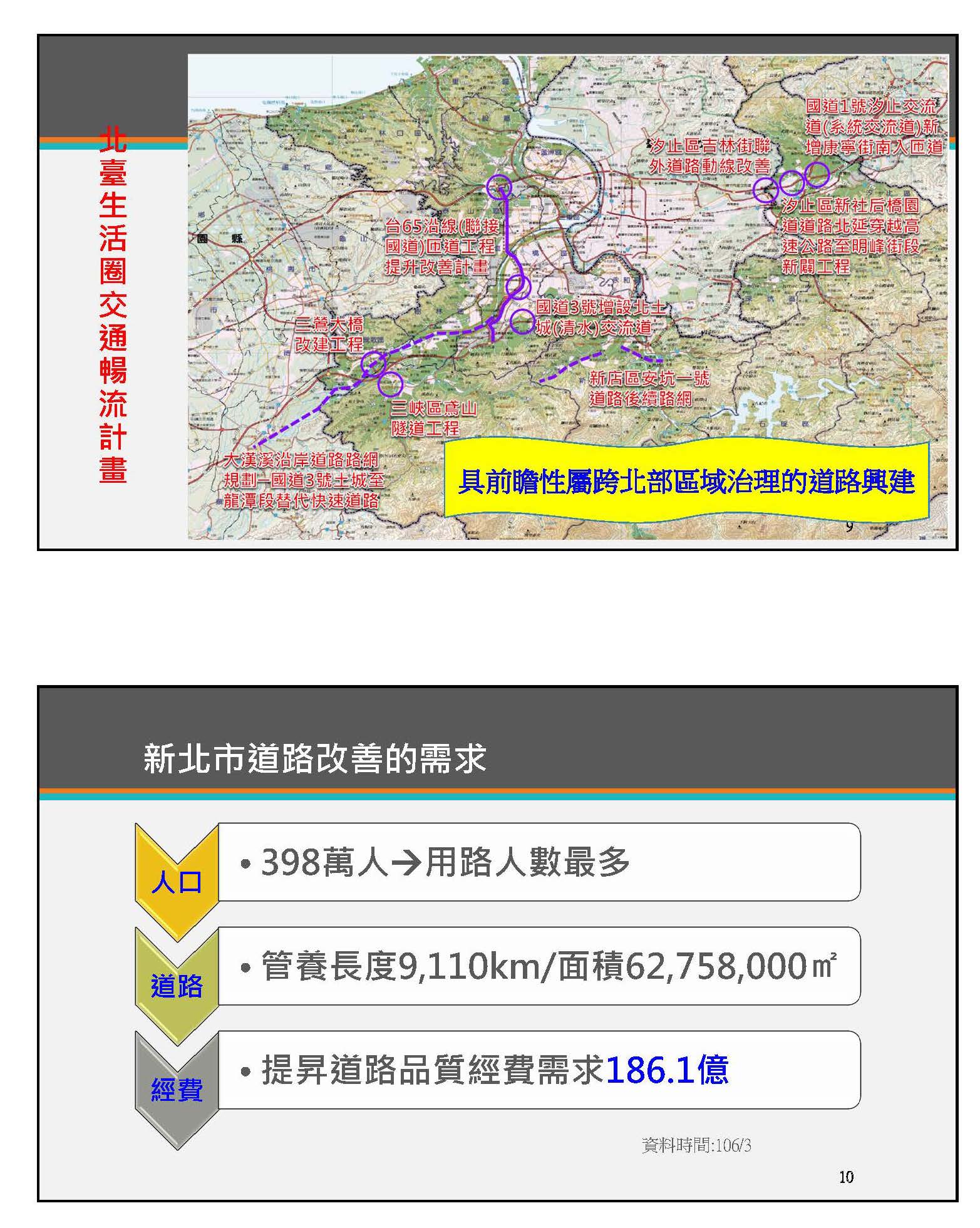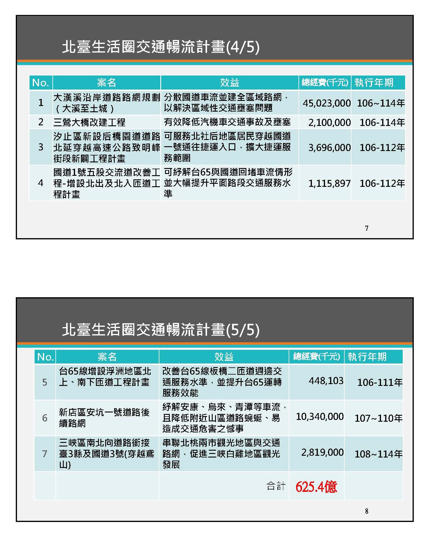 因此,針對城鄉建設,我們希望中央補助的,包括北美二館、台北市古蹟保存的問題、南港機場、長照2.0台北市的試辦先行和整個台北市道路管線智慧管理系統,以及我們現在正在推動的鄰里交通改善計畫,我希望台北市可以做成功,一樣可以推廣到全台灣。所以我再講一遍,台北做為首都,做為一個台灣最有能力做前瞻計畫的縣市,同時我們也以務實的態度,我們不會打高空,報一大堆東西,所以城鄉建設1,300億元,台北市只要76億元就可以了,我們只是很務實的要求這個錢而已。謝謝。