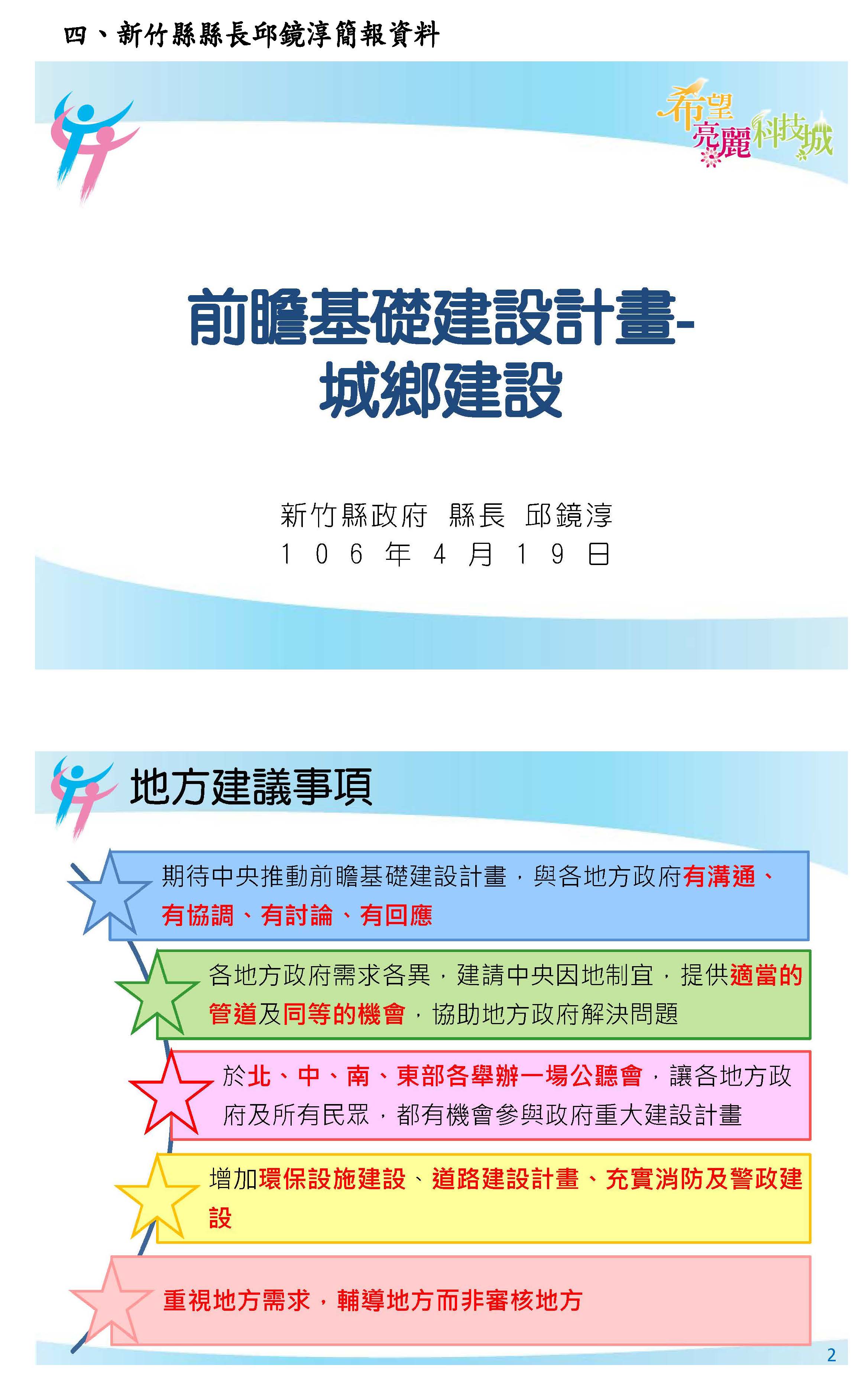 邱縣長鏡淳:主席、各位委員。今天我是以回娘家的心情來學習的,首先要肯定中央有前瞻基礎建設特別條例的草案,整個金額達到8,900億元,我跟主席報告,新竹縣政府一年預算是二百二十多億元,可以說要45年的計畫才有辦法達到8,900億元。在我上任以來,因為財政等各方面的困境,廚房都燒起來了,很難得能在整個財務狀況不好的情況下運作七年多,讓各項工作都可以準備好。有關前瞻基礎建設特別條例,中央希望地方政府提出2年之內可以完成的計畫,因此我們提出190億元的計畫,這個計畫涵蓋了五大項,包括水環境、數位建設、綠能建設、城鄉建設及軌道建設等等,這幾項也是根據中央的條款來辦理的。