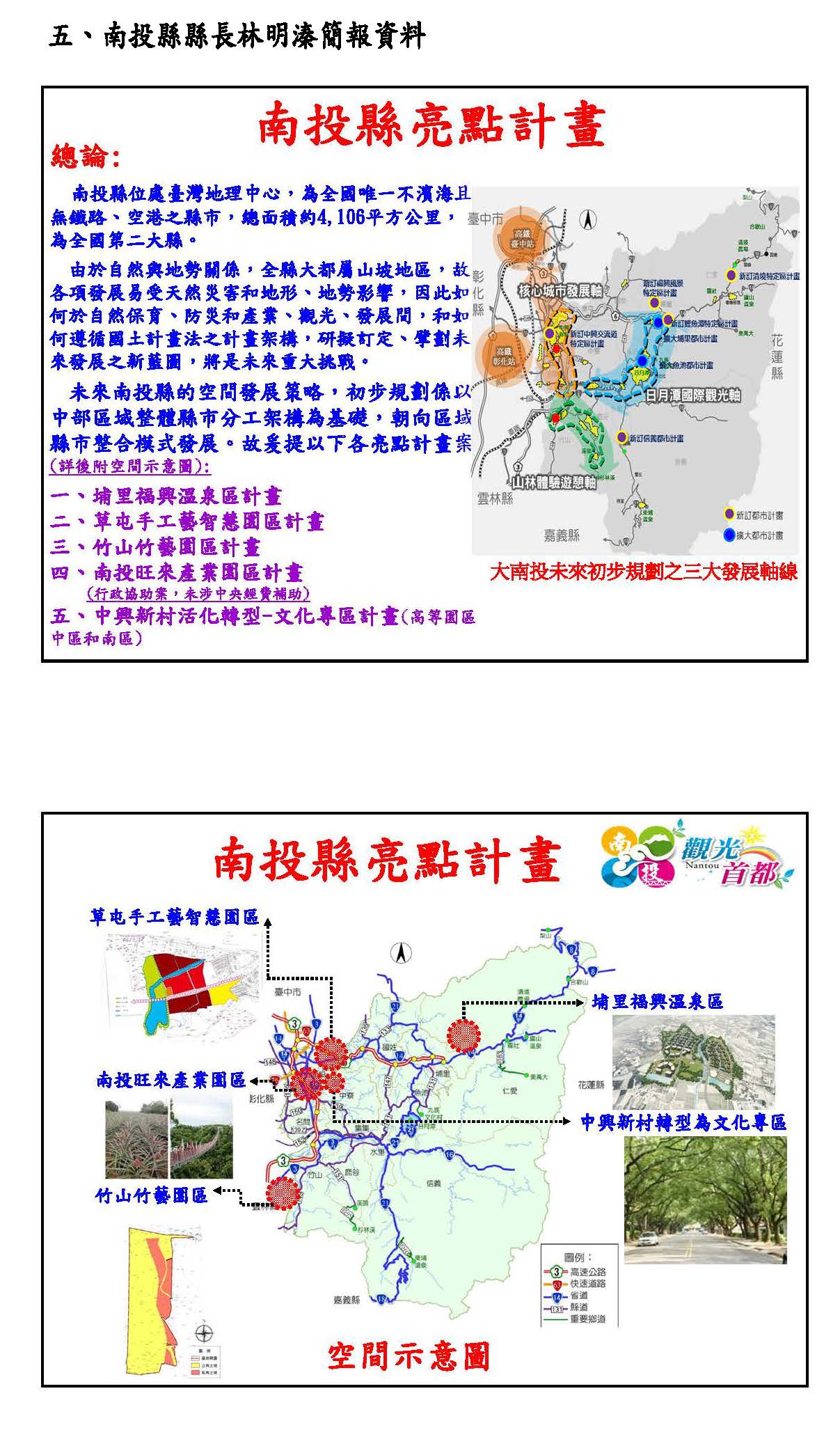 林縣長明溱:主席、各位委員。今天我從基層的縣市來到立法院,中央針對前瞻基礎建設計畫要投資8,800億元,身為縣市長當然是熱烈歡迎,在整個消息曝光與宣傳之後,就有很多人,尤其是我們南投縣的鄉親問我,我們南投縣爭取到了什麼?我說「到目前都沒有」。在這十大工程中首先明定改善停車場的計畫,另外還有提升道路的品質、城鎮資訊的工程、開發在地的產業園區、文化生活的建設、校園社區化的改造、公共服務據點的整併、營造休閒的運動環境、客家浪漫的台三線以及原民部落的營造等10項重大工程。