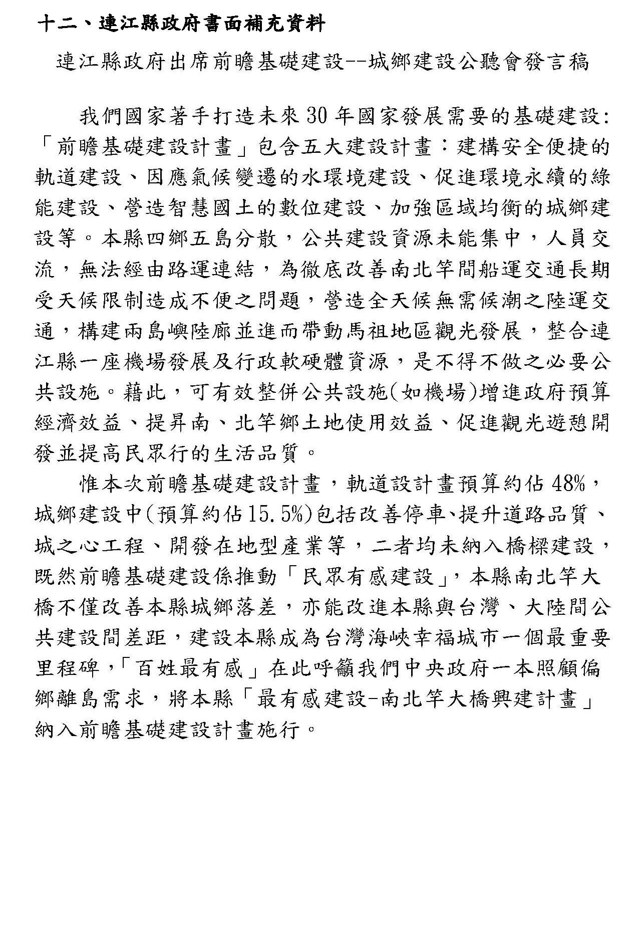 王副縣長忠銘:主席、各位委員。連江縣最後一位發言,前面該說的已經說了,不該說的也都說了,我簡單的提出兩項說明、三項建議。我的兩項說明是:一、我們支持前瞻計畫,因為它是福國利民的計畫,我希望中央在作前瞻計畫時能夠顧後,即便是前瞻,也要顧後。二、連江縣提了三項計畫,到目前為止沒有列入任何計畫之內。關於三項建議:一、我希望這個計畫能考慮到公平、正義的原則,當政府有需要的時候,就把金馬地區作為實驗區,例如戰地政務實驗、金門小三通實驗,為什麼叫做實驗?實驗就是失敗也沒有關係,可有可無,從來沒有考慮把它列為所謂的模範縣,這次希望藉著這個機會,可以考慮讓我們有實施模範縣的機會,以實現公平正義原則。