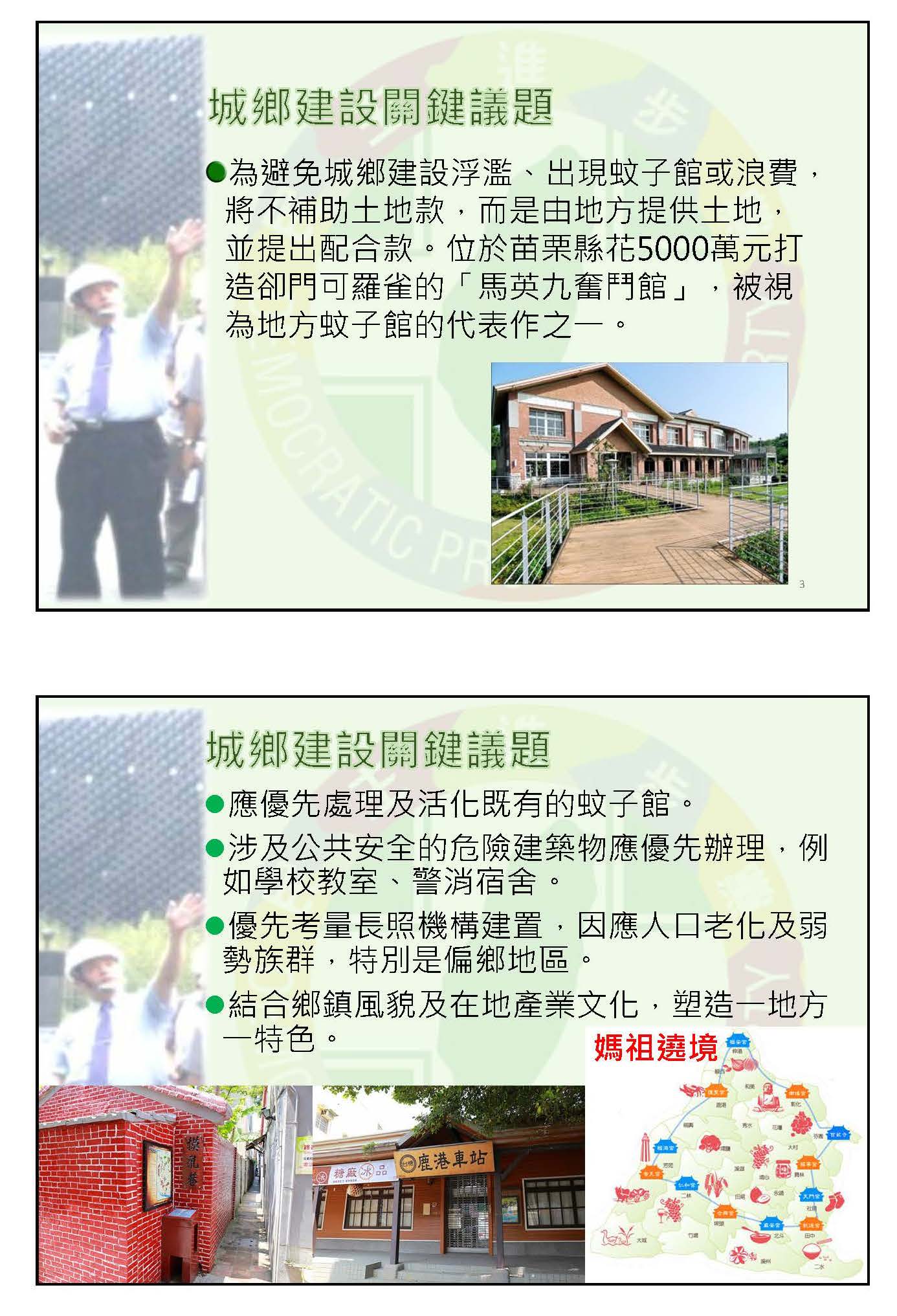 其次,城鄉建設中各項建設的報列方式,根據行政院發言人徐國勇明確表示,除了競爭型的城鄉建設項目預算之外,其他建設項目錢都已經確定,立法院只能刪減預算,不能夠增加預算,換句話說,城鄉建設的各項經費需由各縣市地方提出建設計畫,中央視計畫的優劣決定補助項目,但是這樣美其名的「競爭型預算」就是在比哪個縣市能夠得到中央比較多的關愛眼神,是在比哪些首長比較有交際的手腕。此外,同一個縣市並不是縣市首長跟執政首長是同一政黨,未來所有的提案經過縣市政府提出,很有可能出現同一陣營的鄉鎮市計畫火速提出,不同陣營的鄉鎮市計畫卻棄之不理,我認為應該要在特別條例當中納入鄉鎮市公所計畫,明訂各公所應負擔的自付額,讓每個鄉鎮市都有公平爭取經費的機會,也降低政治力過渡干預、干擾到地方建設的情形。