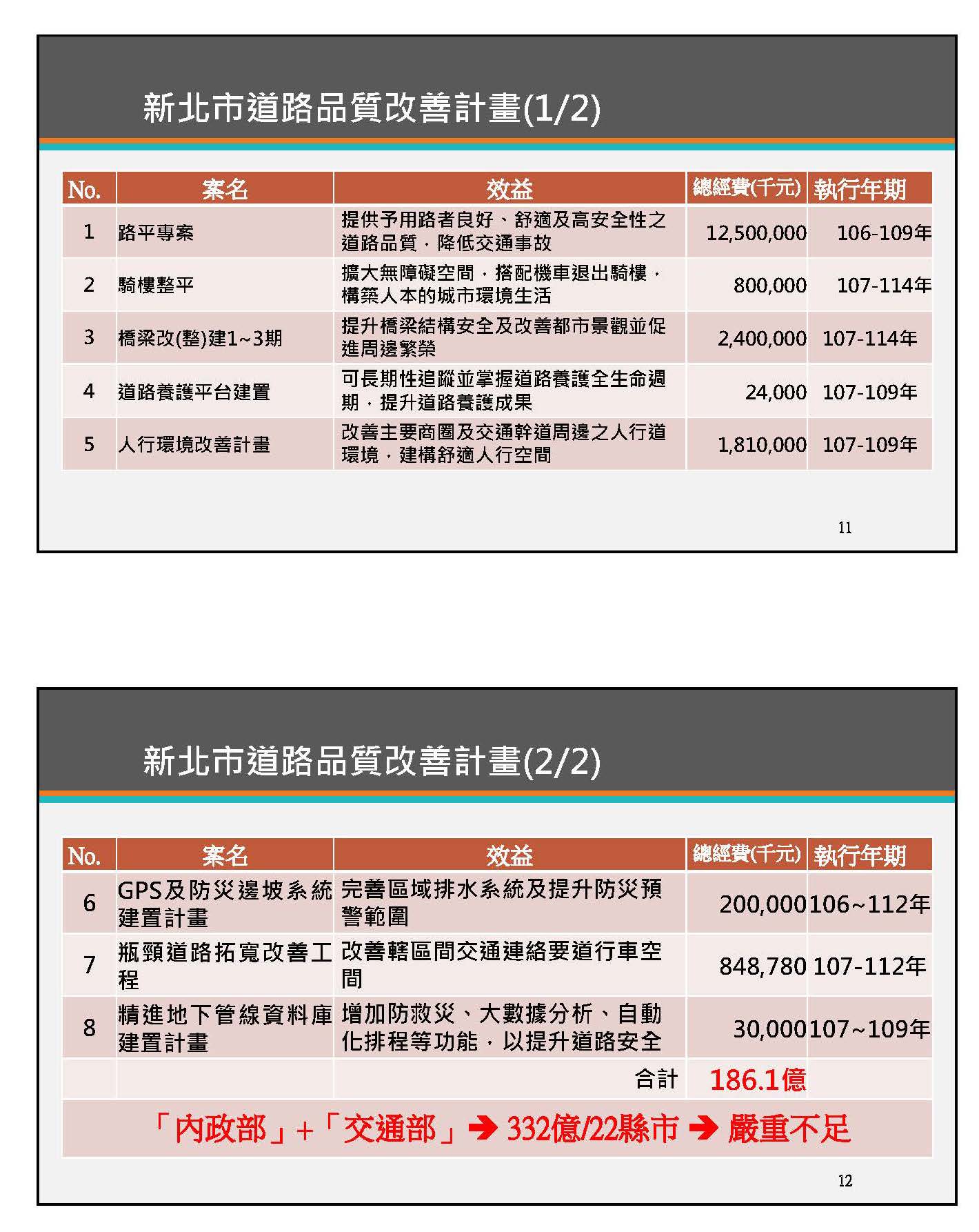 舉例來說,前瞻計畫要更新1,000公里以上的道路品質,但實際上,全臺灣縣市乃至於中央的工程會早就推動「路平專案」多年,但成效如何?我相信在座各位的答案都是否定的,因此這些基礎建設問題,不是在於沒有做,而是做對了沒有,城鄉建設的重點不在於花了多少錢,改了多少建設,也不在於這個建設投資多少錢,而是在於它到底能不能發效益!然而,從現在行政院空泛的核定報告中,看不到!