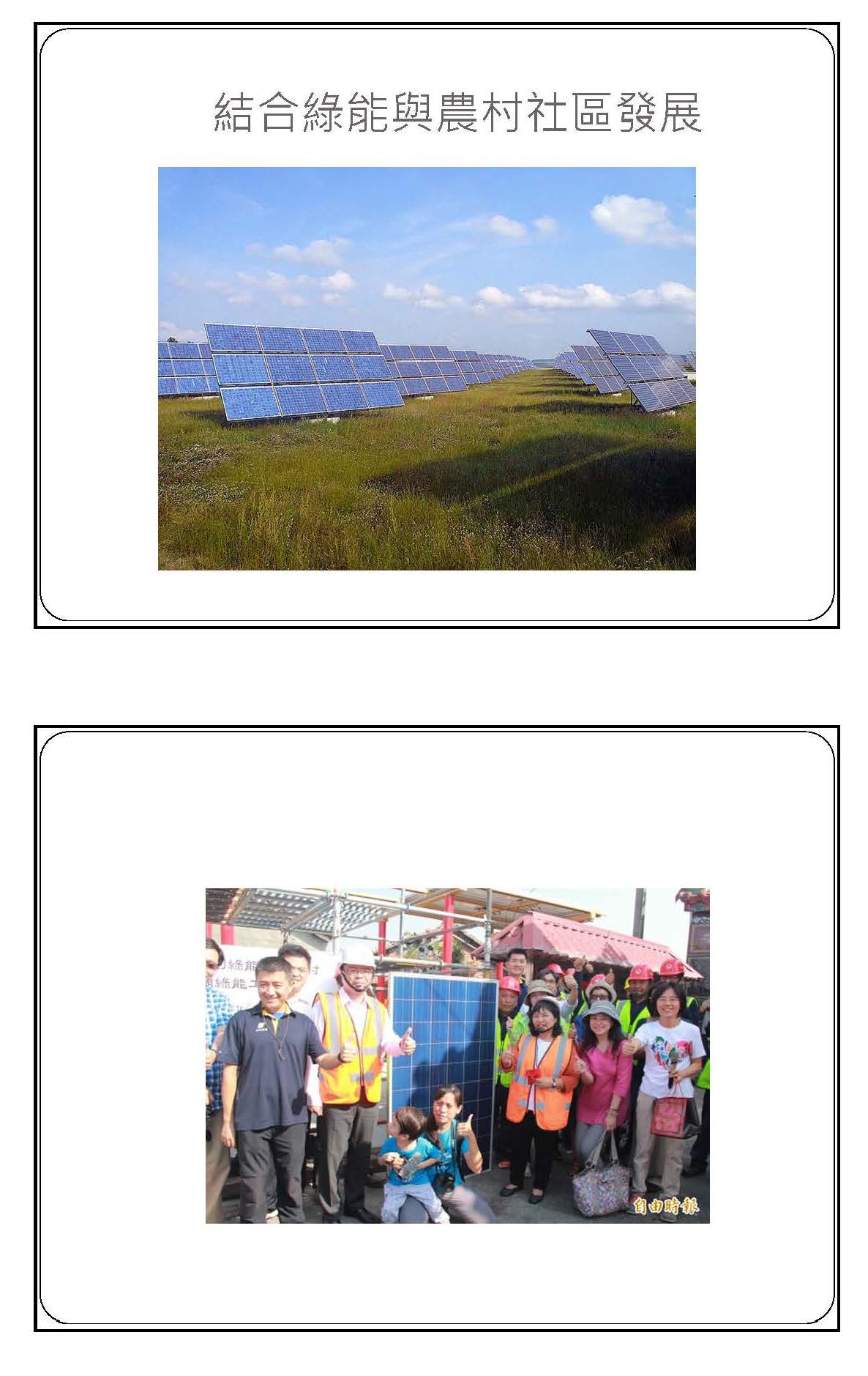 其次,我個人非常在乎的是農村裡能否做一些綠能?各位現在看到的這個畫面不是在臺灣,而是在德國,他們把綠能與農村社區發展結合在一起,然而我們此次的前瞻基礎建設裡卻沒有看到像這樣有前瞻性的規劃。我們過去也曾在彰化台西村及臺東達魯瑪克部落做了一些有關再生能源的推廣,但看起來規模還是很小,如果能由國家做整個前瞻性的規劃,相信規模可以變得更大。此外,屏東向陽農場是我個人看過最棒的農場,農場上面用太陽能發電,下面則種很多蔬菜水果,創造了雙贏,很多人都到那裡去看過,能源局也去看過,我們是不是能有更多向陽農場這樣的地方被製造出來?大家覺得這是一個方向,政府對這部分也是支持鼓勵的。