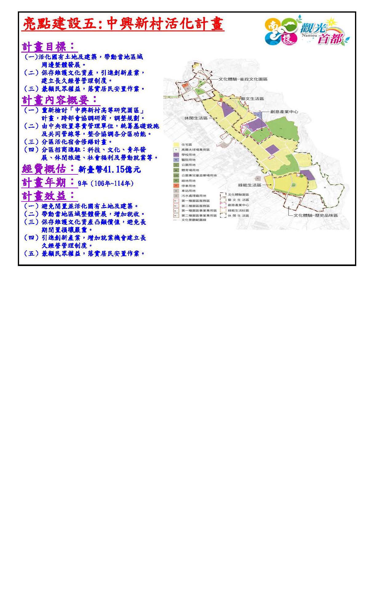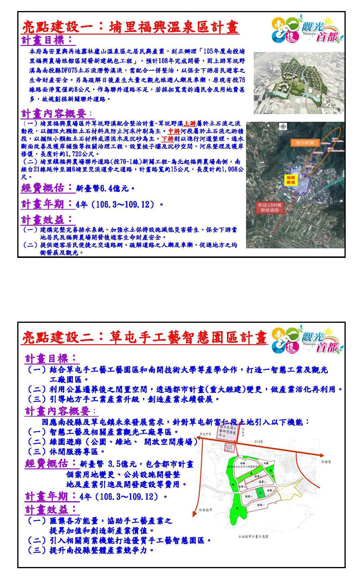 以南投縣的需要來說,我們沒有機場、沒有鐵路也不靠海,所以我們的先決條件,在這個重大的發展建設中就被限制了很多。南投縣唯一比較優越的就是發展觀光,但在十大建設裡可惜就是沒有看到觀光的議題。另外,台灣也有很多農業縣,但在整個十大建設裡也沒有看到政府協助農業和農民發展的政策,所以也有些農民反映,政府要花的8,800億元竟然沒有一點是要照顧農民的,我們地方希望中央能把農業的產業建設納入考慮的範圍,不要讓這些農民失望。尤其是,像我們這些以農立縣的縣市相當多,不要把發展農業建設的基礎給遺忘了,因此我們也希望這部分能在計畫中有所檢討。