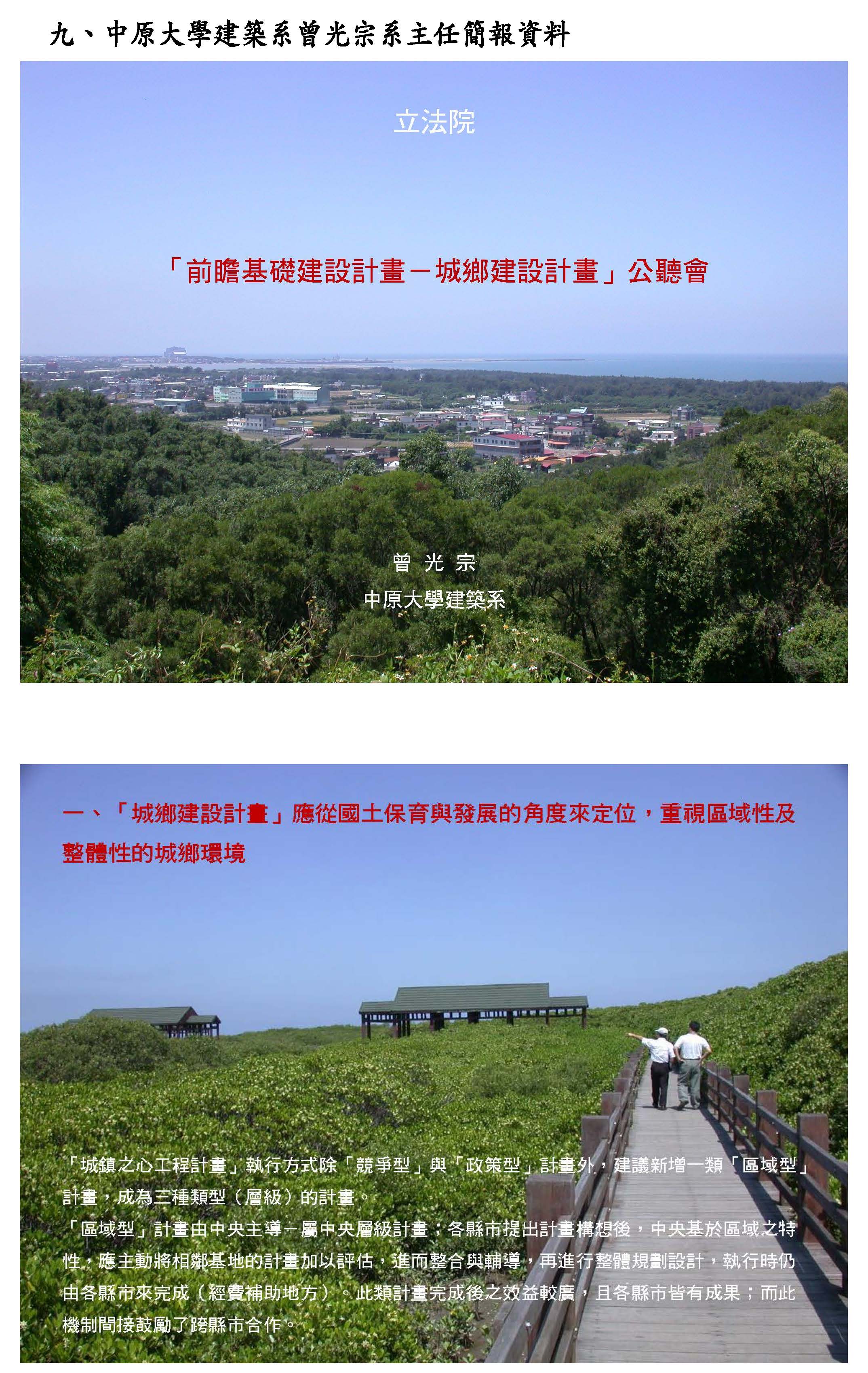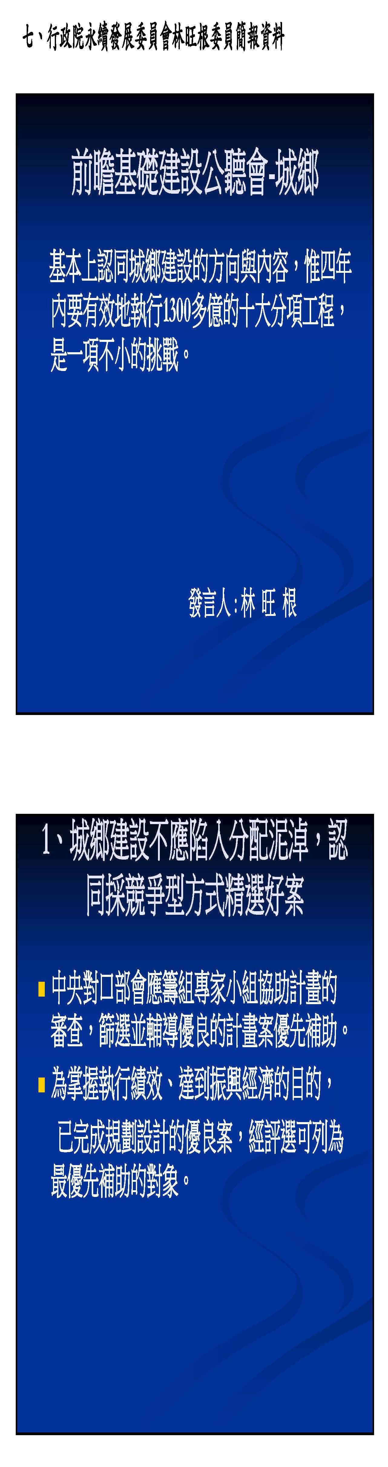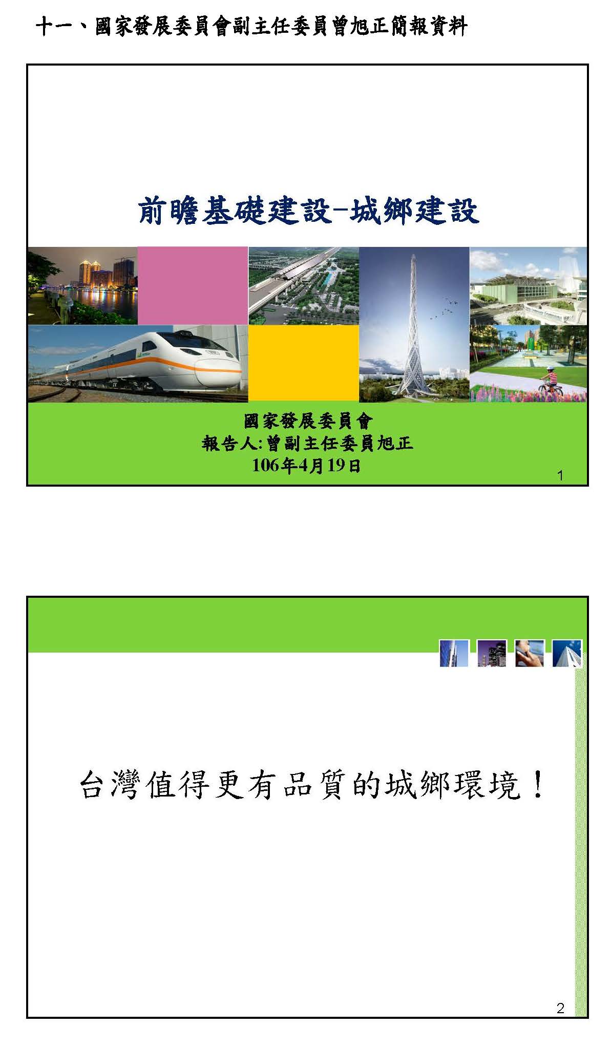 曾副主任委員旭正:主席、各位委員。今天是整個前瞻基礎建設計畫的第五場公聽會,大家又坐了5個多小時了,我代表相關行政部門,在此做簡單答復。剛才休息時間,我就把原本希望在會議前段提出的簡報,很快的做出修正,做為今天結尾的簡報,因為從這些項目裡可以看到我們在城鄉建設這方面的一些思考,其實是跟地方政府或是立法委員所關切的不謀而合,我很簡單說明如下: