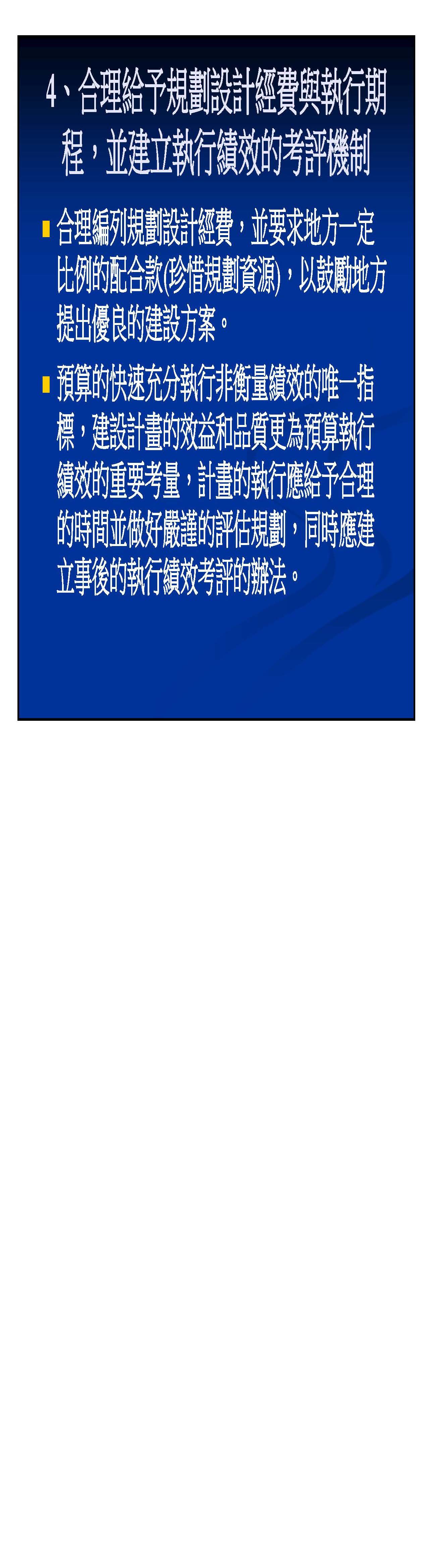 第四點,希望給予合理的規劃設計經費與執行期程,並建立執行績效及考評的機制。過去有很多專案計畫,事實上,補助下去時間都很短,未給予充分執行時間,所以規劃及設計的品質較為粗糙。因為預算執行的壓力,執行時間有限也產生後來執行不利的情形,我認為這部分非常重要,也就是希望各部會能夠瞭解地方政府的預算執行、規劃設計需要的時程及計畫整合內容的排除,這部分希望能夠訂出比較合理的規劃設計經費。事實上,以各位委員過去在地方政府的執行經驗而言,地方政府再怎麼窮,自己編列一些規劃費應該不是那麼困難,如果能夠預先自己籌備一些規劃費,為提出好的計畫準備,那是很有機會的!